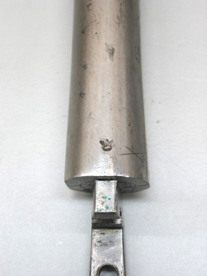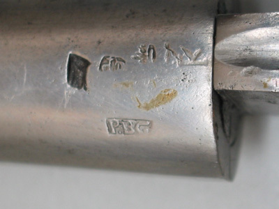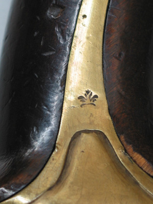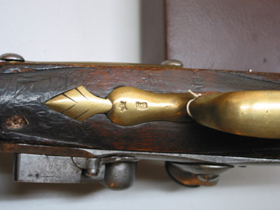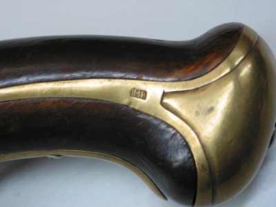Pipa modellenlig men avkortad, rund, slätborrad med plana ytor på vardera sidan från pipbasen och ca 70 mm framåt. Vid pipbasen stämplar: P.BG i rektangel, C P i rektangel (?), stiliserad bladkrona samt krönt ligatur ik. Därframför en sned, rektangulär, oläslig stämpel (?). Svagt böjt, baktill tvärt avskuret svansskruvblad, platta med rundat hak för låsskruv. Riktmedel: Spetsoval skålning på svansskruvbladet, spolformigt korn av mässing. Fästning: Två häften, det främre utan funktion. Pipan fäst med krysskruv samt ett pipstift av stål. Flintlås modellenligt, välvt låsbleck och hane med lös överkäke, rundad fängpanna med bred fals. Batteri med markerad spets på eldstålsryggen, kraftig häl. Batterifjäder med treflikigt fjäderlöv. Mellan batterifjäderns armar en stämpel A G i rektangel. Fästning och avtryckare: Två låsskruvar. Avtryckare med upprullad ände. Ovalt avtryckarbleck av stål,framför avtryckaren stämpel: iMB i rektangel. Helstock av al(?) med skuret, droppformigt blad vid svansskruvbladet. Beslag av mässing. Kolvkappa med långa flikar, slät kantlist, på ena fliken bladkronstämpeln, på den andra IMB-stämpeln. S-formigt sidbleck stämplat på insidan: B samt AR i rektangel. En rörka med kantringar. Varbygel med främre 8-formig arm avslutad med rombiskt blad, stämplar kron- och IMB-stämpeln. På främre armens insida stämpel A S B i rektangel. Näsbandet ersatt med mässingsskålla vid avkortningen. Tillbehör: Laddstock av trä, l: 274 mm.