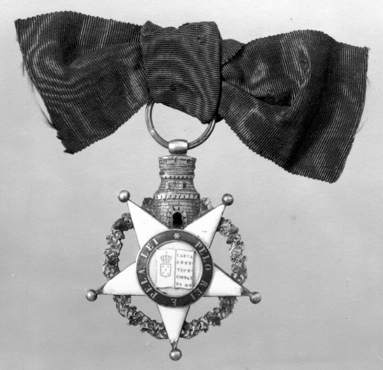 Femuddig, vitemaljerad stjärna av silver, kulor på spetsarna, en udd raktnedåt. Medaljong täckt med vit emalj, därpå fäst grönemaljerad eklövs- och lagerkrans, därigenom stucket svärd med blåemaljerad klinga. Runtom blåemaljerad ring med guldtext: "VALOR LEALDADE E MERITO". Frånsidans medaljong av vit emalj, därpå vitemaljerad uppslagen bok, på ena sidan Portugals krönta vapen, på andra sidan text:"CARTA CONSTITUCIONAL DA MO". Däromkring blåemaljerad ring med guldtext: "PELO REI E PELA LEI". Runt stjärnan vid spetsarna en grönemaljerad eklövskrans av silver. Mellan de två övre spetsarna ett torn av silver, svartemaljerade fönster och dörrar,på tornets översida en tunnformig ring, däri fäst bandring av silver.