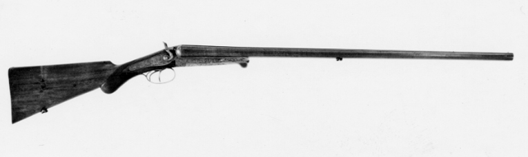 Brunerad, slätborrad dubbelbösspipa med ejektor, banddamask. Hög littrad spång, i utsparat fält inslagen silversignatur: "VICTOR COLLETTE LIEGE". På kammarens undersida stämplar, på h. pipa: 54626, 16.8, VC, ASC, på v. pipa ELG och stjärna i oval, S krönt av stjärna, obelisken, chiffer EL, 16.4 och NON POUR BALLE (införd 1878). Tre pipklackar, två för slutningen och en för fästning i stocken. På spången därframför rembygel. Riktmedel: Förgyllt knoppkorn. Lås med bakåtliggande slagfjädrar. Svagt välvda låsbleck med bladrankor mot mörkskrafferad bakgrund, bakom hanarna graverad text, på v. lås: "M. WIDFORSS", på h. lås "STOCKHOLM" (importör). Starkt svängda hanar med brett fasade kanter, bladdekor, nätskuret tumgrepp. Slagfjädern förenad med nöten med länk. På låsbleckets insida stämplat, ovanför slagfjädern: VC 54626, nedanför: N. Fästning: Två låsskruvar från v. låsbleck. Två avtryckare. Halvstock av valnöt som slutar bakom låsen. Kolv med nätskuren pistolkolv. Beslag av stål, bakplåt med liten spetsig flik över kolvhälen, graverat blad, två skruvar. Stötbotten med slagstift, blad med rundad avslutning, bladrankor, två skruvar, pipplatta och nyckel med bladdekor, nätskuret fingergrepp. På plattans ovansida stämplat: på ena sidan: 54626, på andra sidan S och stjärna, obelisken, C i oval. Avtryckarbleck och däri fäst varbygel, kluven bakre stolpe, lång bakre arm med rundad avslutning, bladdekor. På kolvens undersida rembygel.