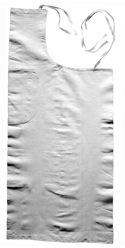 FÖRKLÄDEN (disk-), tolv stycken (ett dussin) Av oblekt tvåskaftad linnevävnad. Maskinsydda. Avlånga, med raka kanter, sidokanterna upptill starkt insvängda för armarna och bildande bröstlapp, samt en ficka. Varje bestående av två stycken, det ena mycket smalt, hopsydda med en fällsöm. Sidorna på sex stycken med stadkant, på sex stycken ena sidan fållad, övriga kanter fållade. På förklädets mitt en påsydd stor ficka med övre kanten rak, fållad, den nedre rundad och invikt. På rätsidan vid fickans hörn en liten träns, på avigsidan en liten kvadratisk eller rektangulär linnelapp som förstärkning. Alla sömmar sydda med vit bomullstråd. Ett stycke innanför förklädets övre hörn ett vitt tvåskaftat linneband med fållade ändar samt fastsytt för hand med fåll- och kaststygn av vit bomullstråd. På bröstlappens övre kant ett dylikt band, fastsytt innanför hörnen. I förklädets högra övre hörn handbroderat med korsstygn av rött bomullsgarn: W v H 12. Längd med bröstlapp: omkring 1,12--1,17 m.; bredd: omkring 1,015--1,06 m. Linnelärft till 5 förkläden. Inköpt av Wilhelmina von Hallwyl i november 1898 hos K. M. Lundbergs Bosättningsmagasin. Förfärdigade av Kammarjungfrun Hulda Jonsson, (anställd mellan 1886 och 1930). 7 förkläden inköpta efter beställning av Wilhelmina von Hallwyl 17 Juni 1926 hos Aktiebolaget Nordiska Kompaniet.