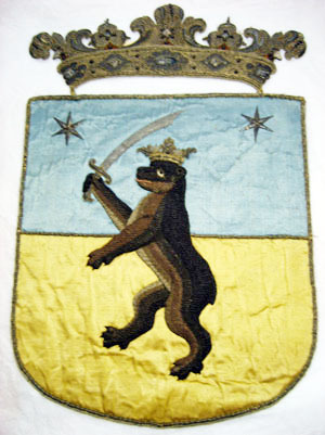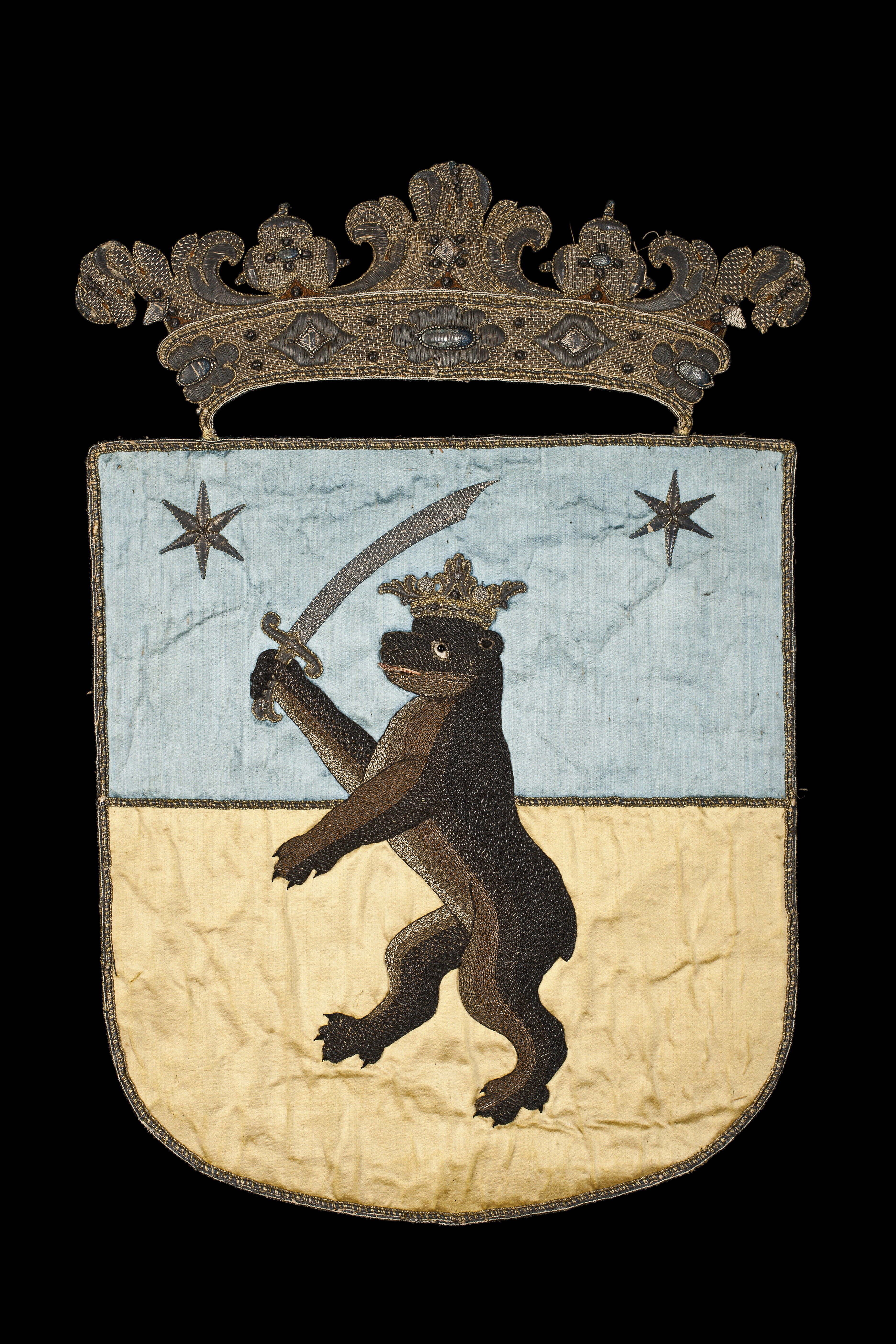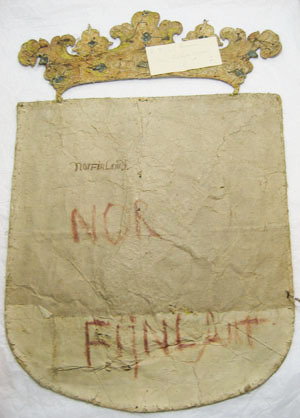Delad sköld med övre delen av ljusblå sidenatlas och undre delen av gul sidenatlas. Skölden kantas av en bård bestående av ett snöre av silverlan och gul silkestråd virad runtom en silkeskärna samt av en tvinnad silvertråd och gul silkestråd och ett smalt vävt band av ett silverlan, två gula silkestrådar och en silvertråd utdragen i små öglor. Skölden delas även mitt på av samma slags snodd dvs en snodd av silverlan och gul silkestråd runtom en silkeskärna och av två tvinnade silvertrådar och gula silkestrådar. Mitt på vapnet är påsytt ett applikationsbroderi i relief föreställande en krönt björn stående på bakbenen. Björnen är broderad av svart, mörkbrun, brun samt vit och beigefärgad silkestråd. Den är huvudsakligen broderad i läggsöm. I höger ram håller björnen i en lyftad värja med ett fäste av silvertråd, kantat av gul silkestråd och en klinga av silvertråd nedsydd med stygn av vit silkestråd. Björnens öga är ifyllt med vit silkestråd och pupillen utgörs av en svart glaspärla. Ögat kantas runtom av gul silkestråd och ett ögonbryn av tvinnad silvertråd. Björnen har en halvöppen mun med en blekt röd tunga. Munnen, nosen, nosborre och öra, markeras av kantilj av förgylld silvertråd. Öra och klor är av svart silkestråd. Björnen kröns av en grevlig krona med fem spetsar föreställande stiliserade blad av förgylld silvertråd, kantad av tvinnad gul silkestråd och silvertråd. På kronringen sitter fem prickar av kantiljer av silvertråd och däremellan åtta små prickar av silvertråd. På den blå atlasen, i sköldens båda hörn är broderat två stjärnor av silverlan. Skölden kröns av en grevlig krona, påsydd i två hörn. Kronan har fem spetsar föreställande stiliserade blommor och blad med volutformer. Mitt på vardera blad eller blomma sitter en romb eller en oval med silverlan i mitten, kring vilka är virat röd respektive blå silkestråd. Dessa kantas av skruvade silverlan och av små prickar av kantiljer av silvertråd. Vid nederkanten av spetsarna är ifyllt med brun silkestråd. Kronringen är 45 mm bred, kantad på vardera sida av tre smala snoddar av silvertråd och gul silkestråd samt av ett smalt vävt band av silvertråd och gul silkestråd samt av utrdagna små öglor av silvertråd. Kronringen är av silvertråd nedsydd med stygn av vit silkestråd. På kronringen sitter fem blommor av silvertråd med silverlan i mitten omvirade med röd och grön silkestråd, kantade av skruvade silverlan och små prickar av kantiljer av silvertråd samt tvinnad silvertråd och gul silkestråd. Mellan blommorna är broderat små prickar av kantiljer av silvertråd. Vapnet är på baksidan klätt med beigefärgad linnelärft och med gråaktigt papper. Mitt bak på skölden, i övre kanten, en påskrift med svart bläck: "norFinlandg" och med stora bokstäver mitt på vapnet samt i nedre kanten är skrivet med röd färg: "NOR//FINLANT".