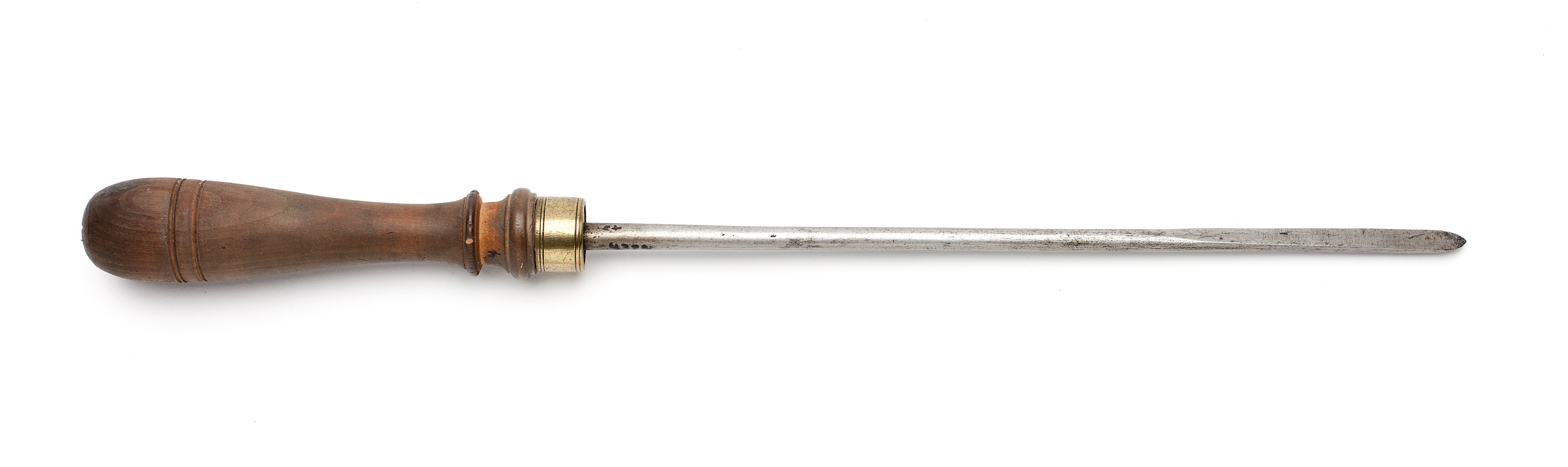 Rund klinga, stålet med halvcirkelformad genomskärning. Stämplat på klingan: hjärta under kors. Spetsoval egg, rundad på undersidan. Svarvat skaft av päronträ, med två vulster nedtill ("rydboholmstyp"). Mässingsring.