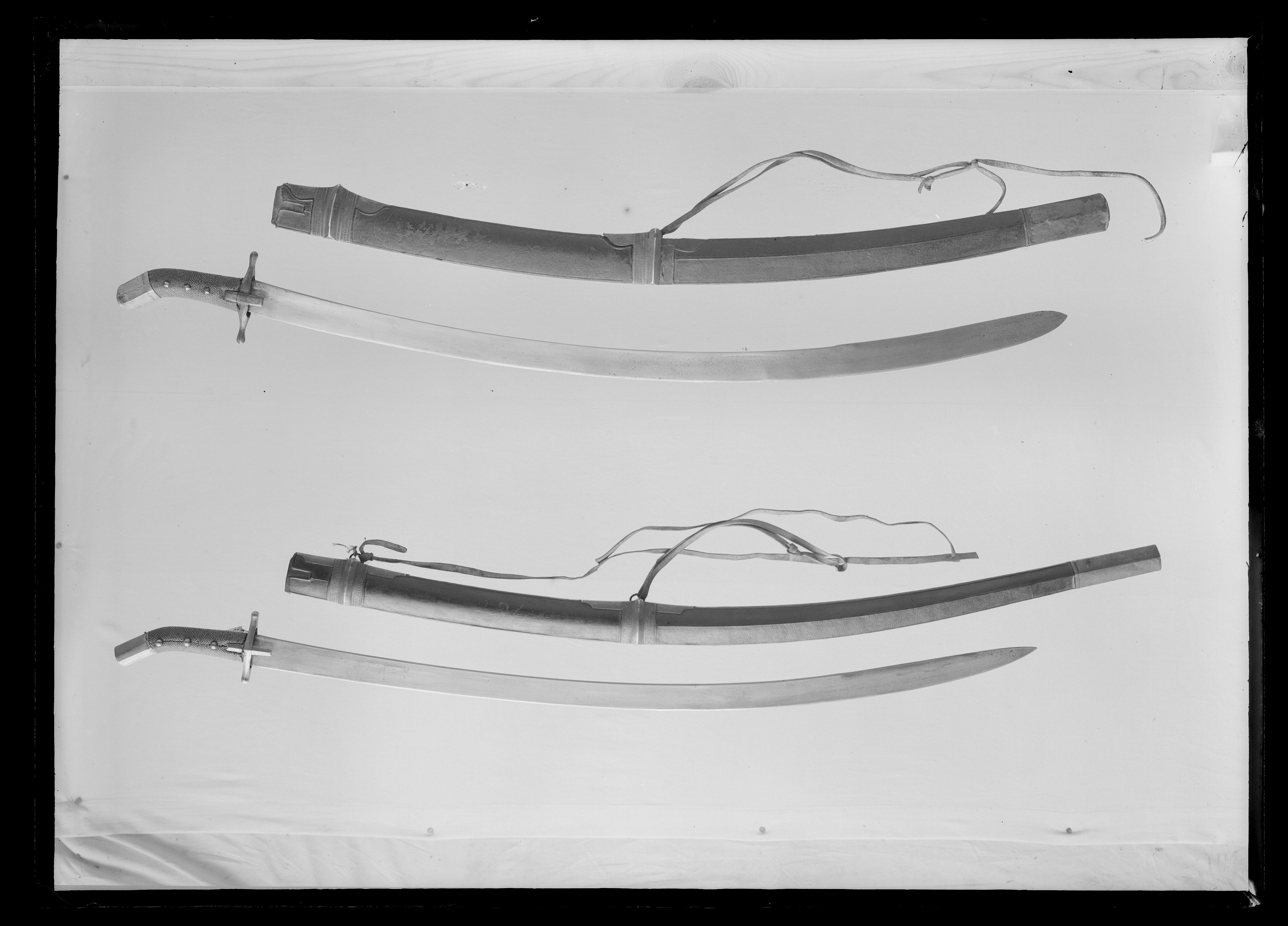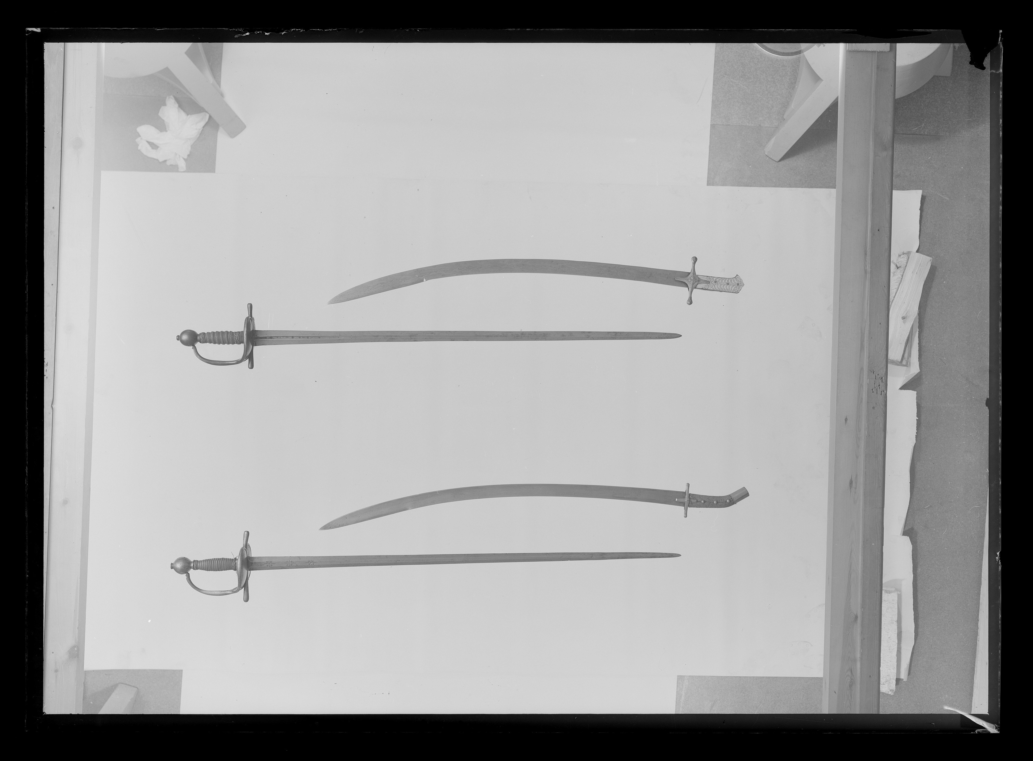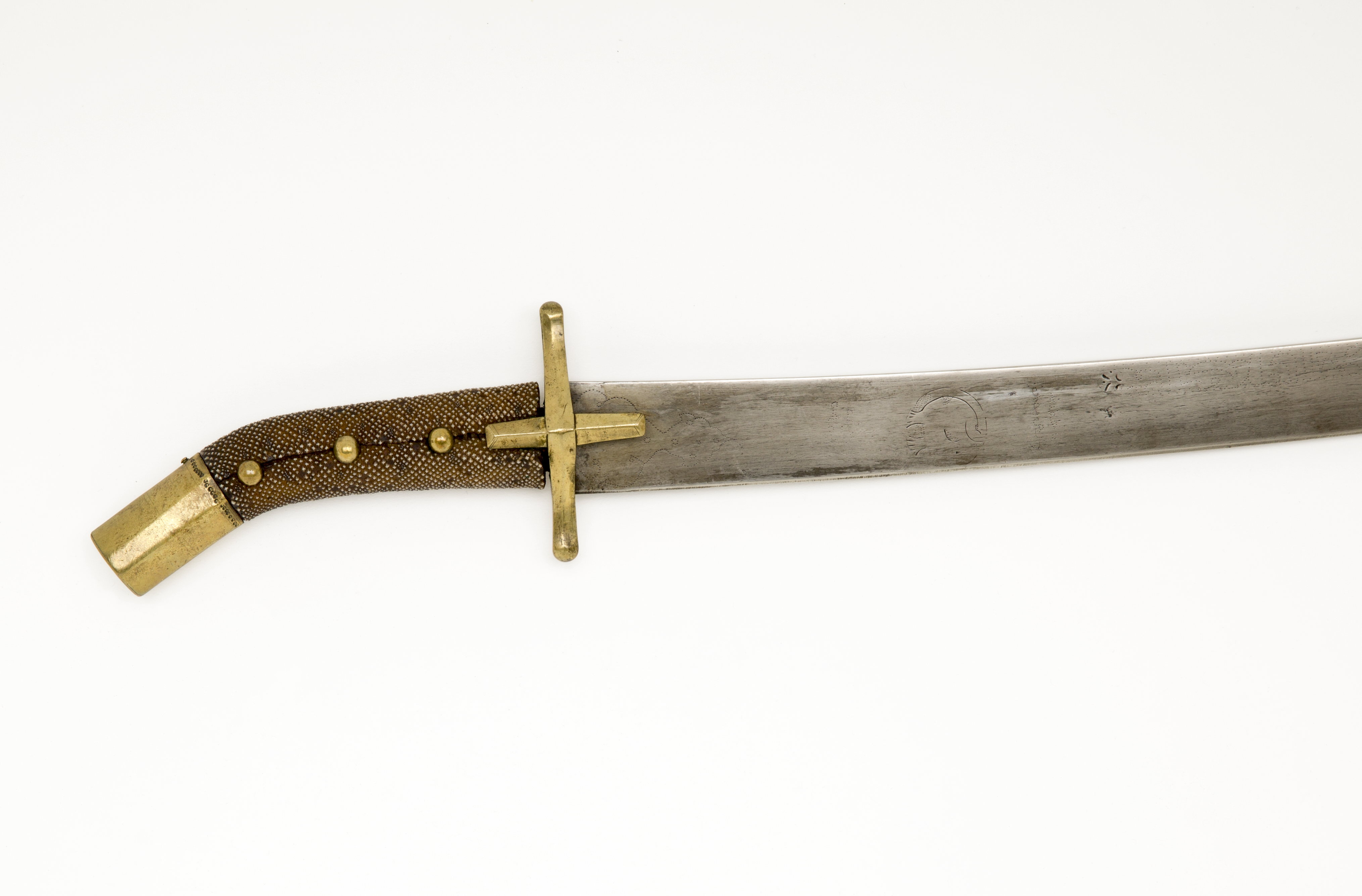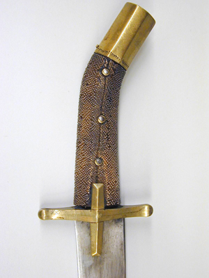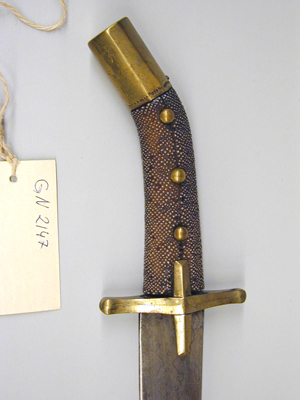 Fäste utan byglar. Kavelns överdel framåtböjd och klädd med en sexsidig kappa av förgylld slät mässing, runt kappans nederdel en smal bård av punsade ringar. Kavel med nästan spetsovalt tvärsnitt, klädd med hajskinn och med en längsgående rad av tre nitar, de på utsidan med kupiga huvuden av förgylld mässing. Parerstänger korta, raka och liksom de uppåt- och nedåtriktade styrskenorna av slät förgylld mässing med ryggås. Klinga böjd, eneggad med nedslipad jelman och plan rygg. På utsidan av starka delen finpunsade, glest tecknade ornamentala mönster. Nederst en symmetrisk, från basen uppstigande kartusch, svagt konturerad med fint punsade prickar. Därovanför ett fågelliknande rundat ornament bildat av punsade smala ränder följt utmed ryggkanten av ett otydligt prickat mönster (inskription?).