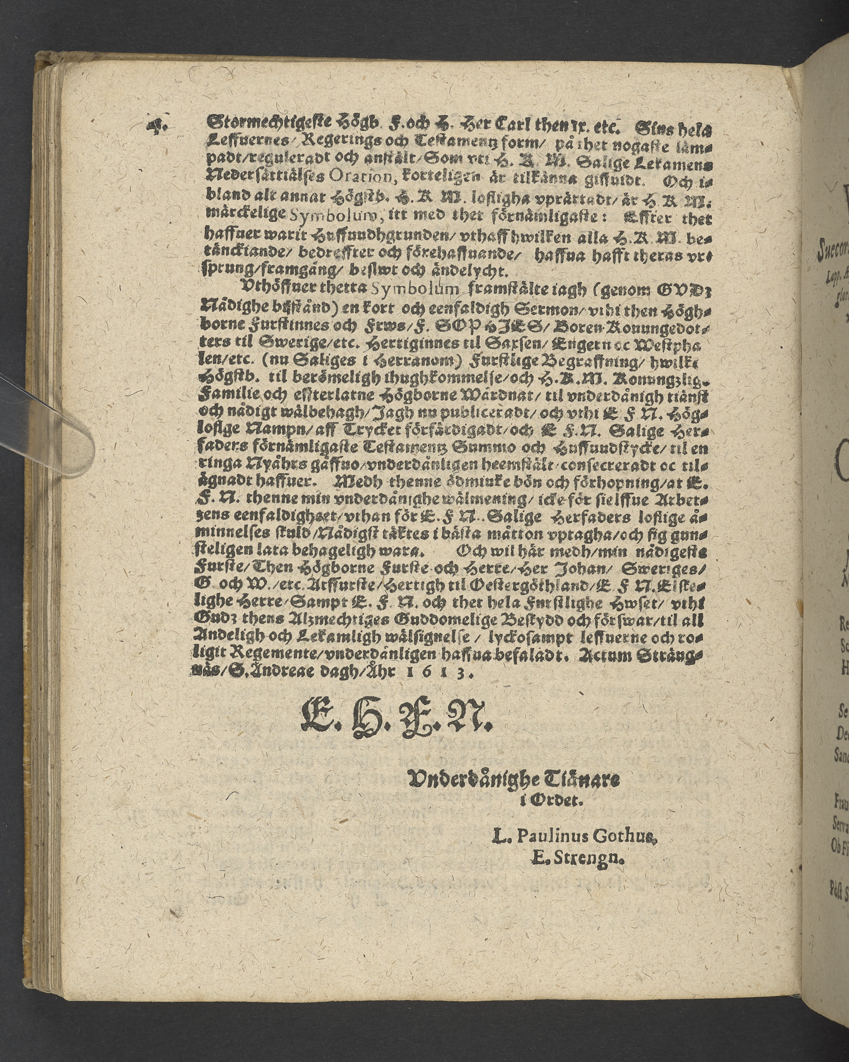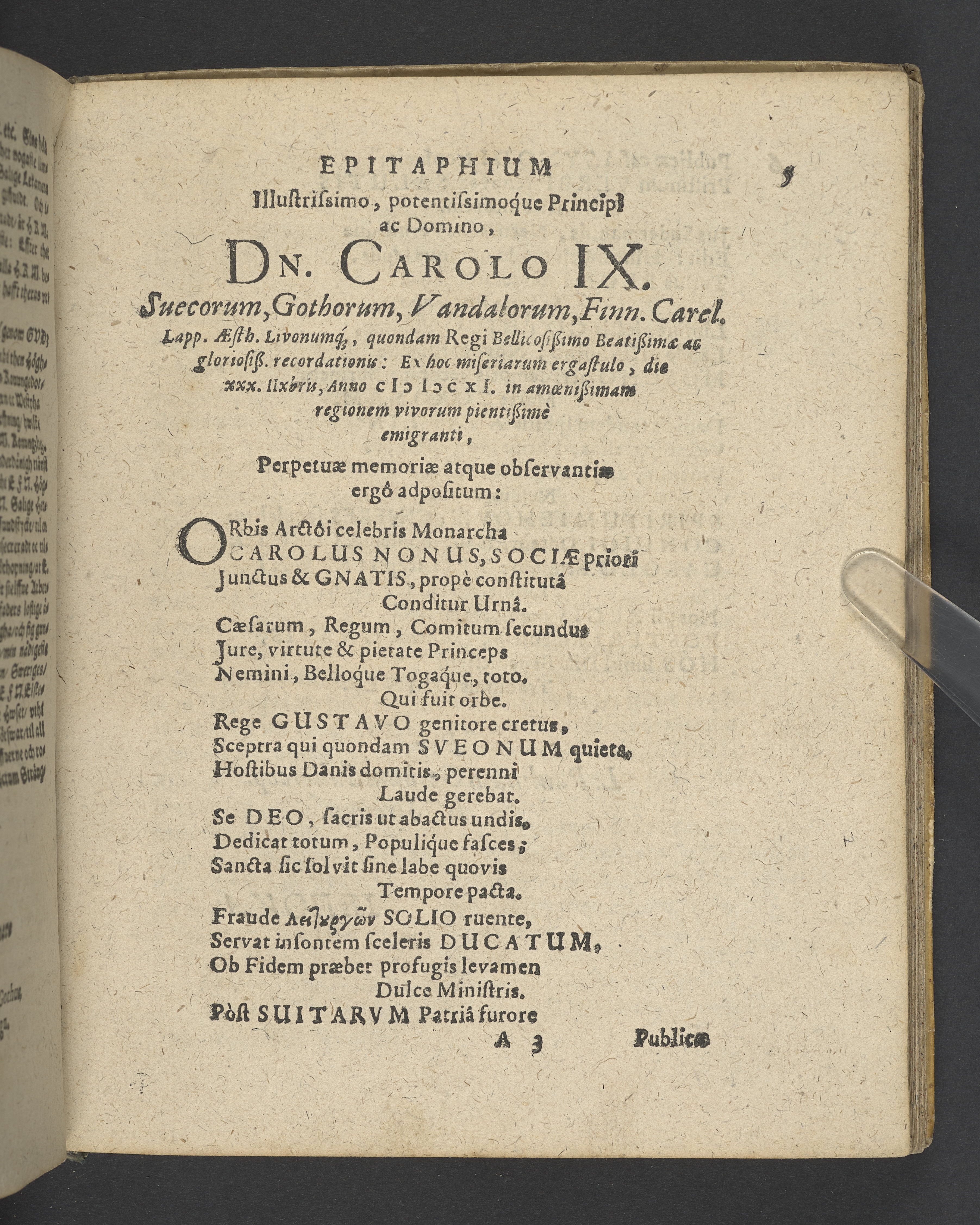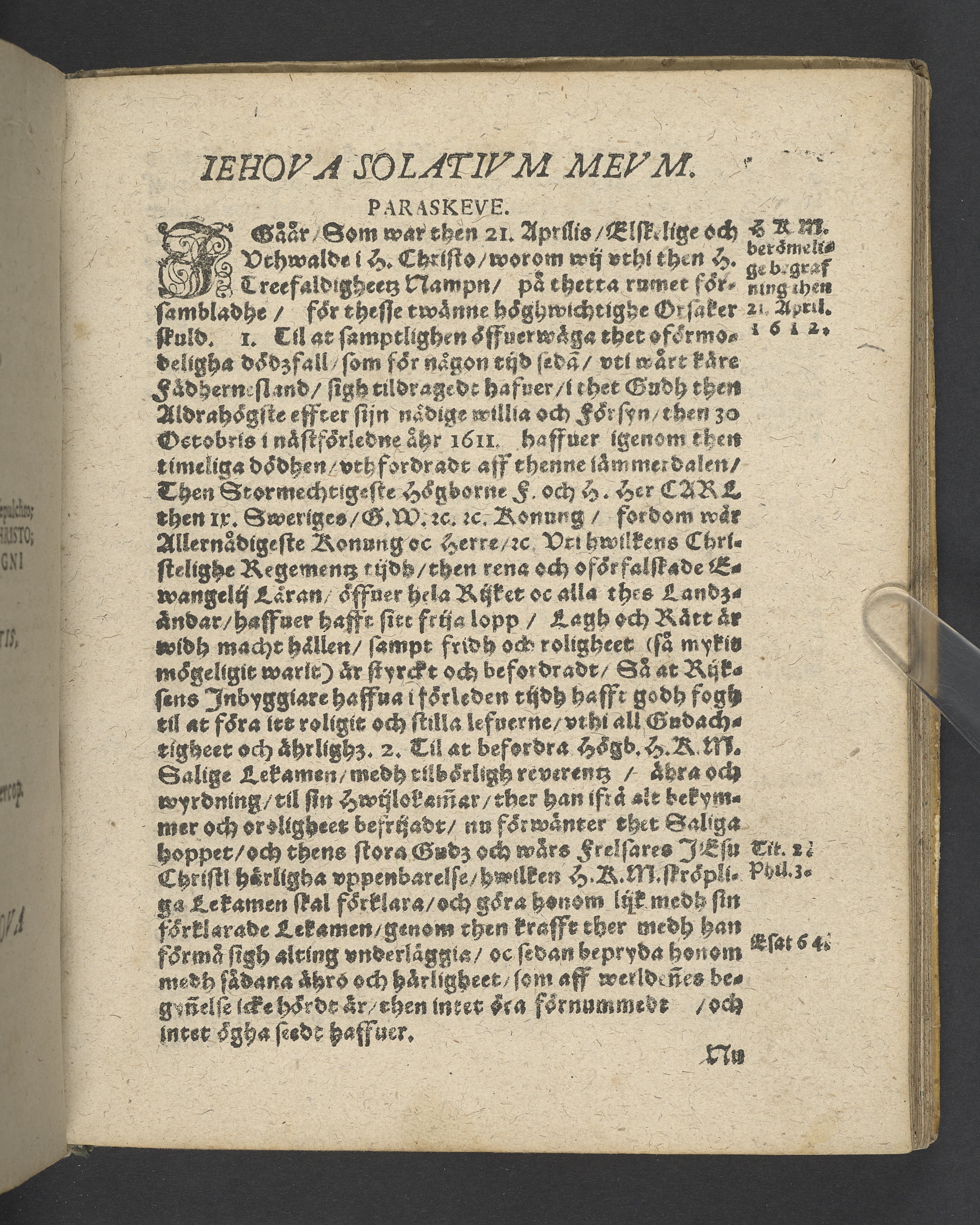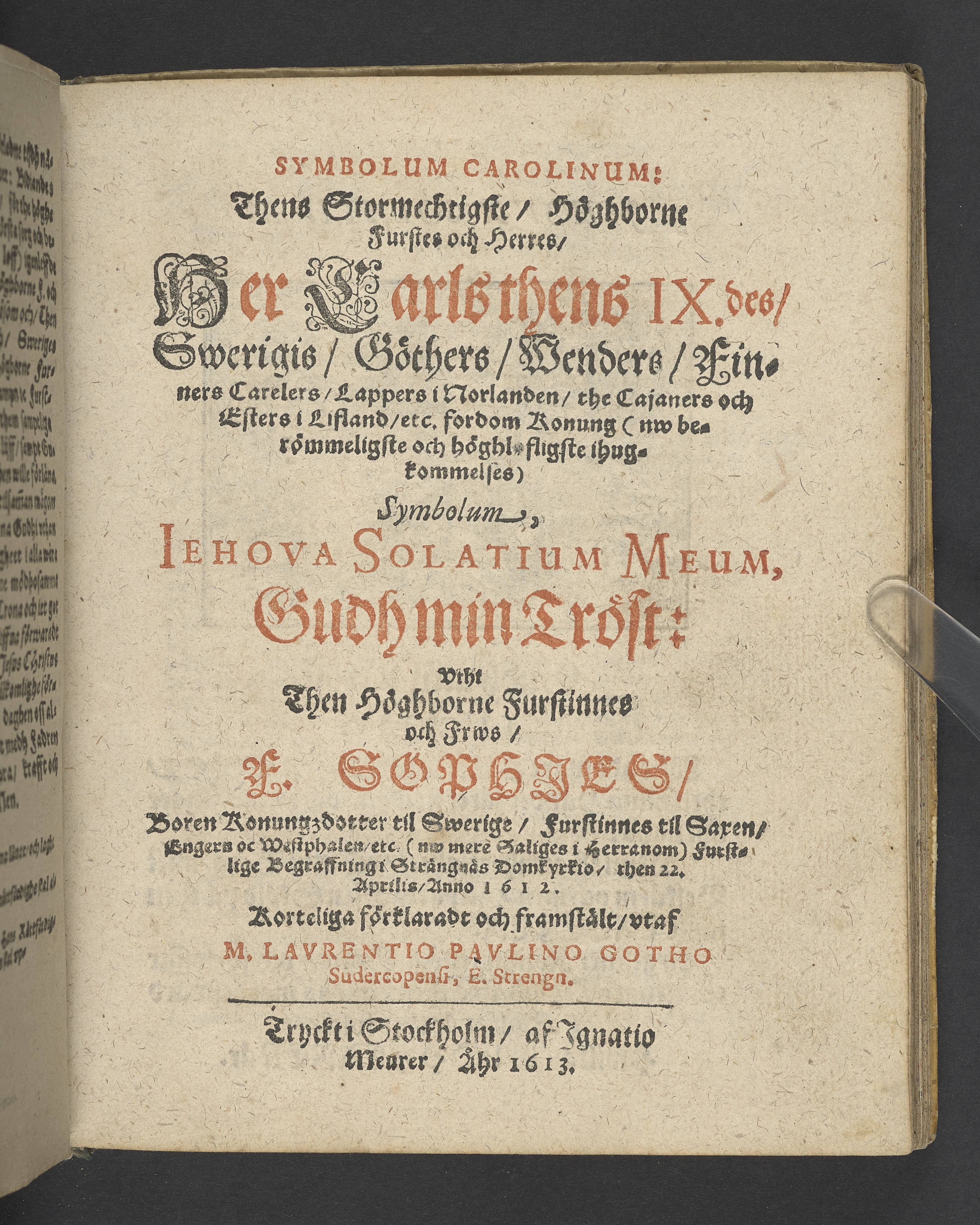 Symbolum Carolinum... Her Carls thens IX.des... symbolum, Iehova solatium meum, Gudh min tröst: Vthi then höghborne furstinnes... E. Sophies... begraffning i Strängnäs domkyrkio, then 22. Aprilis, anno 1612... Framstält vtaff M. Laurentio Paulino Gotho... Tryckt i Stockholm, af Ignatio Meurer, åhr 1613.
