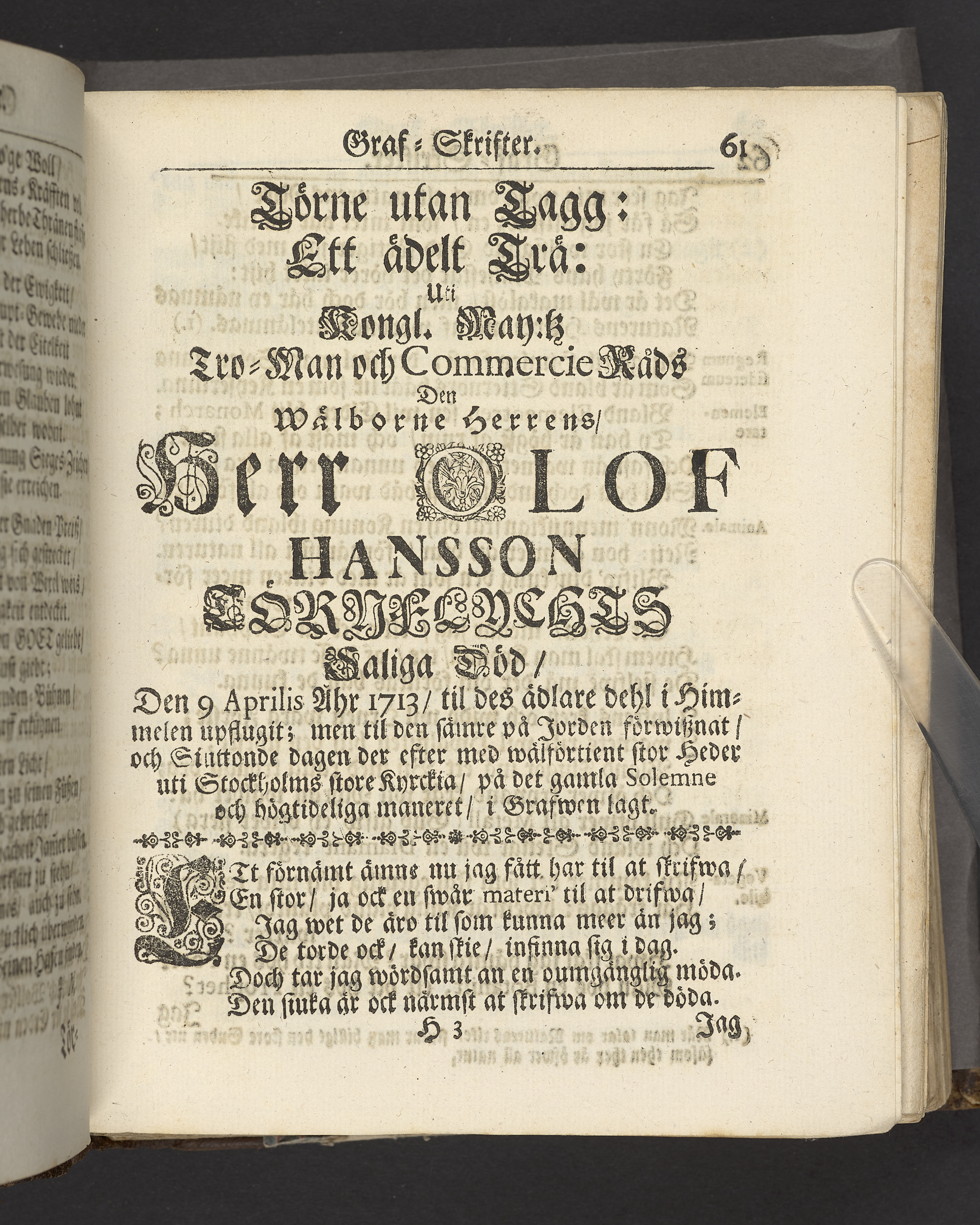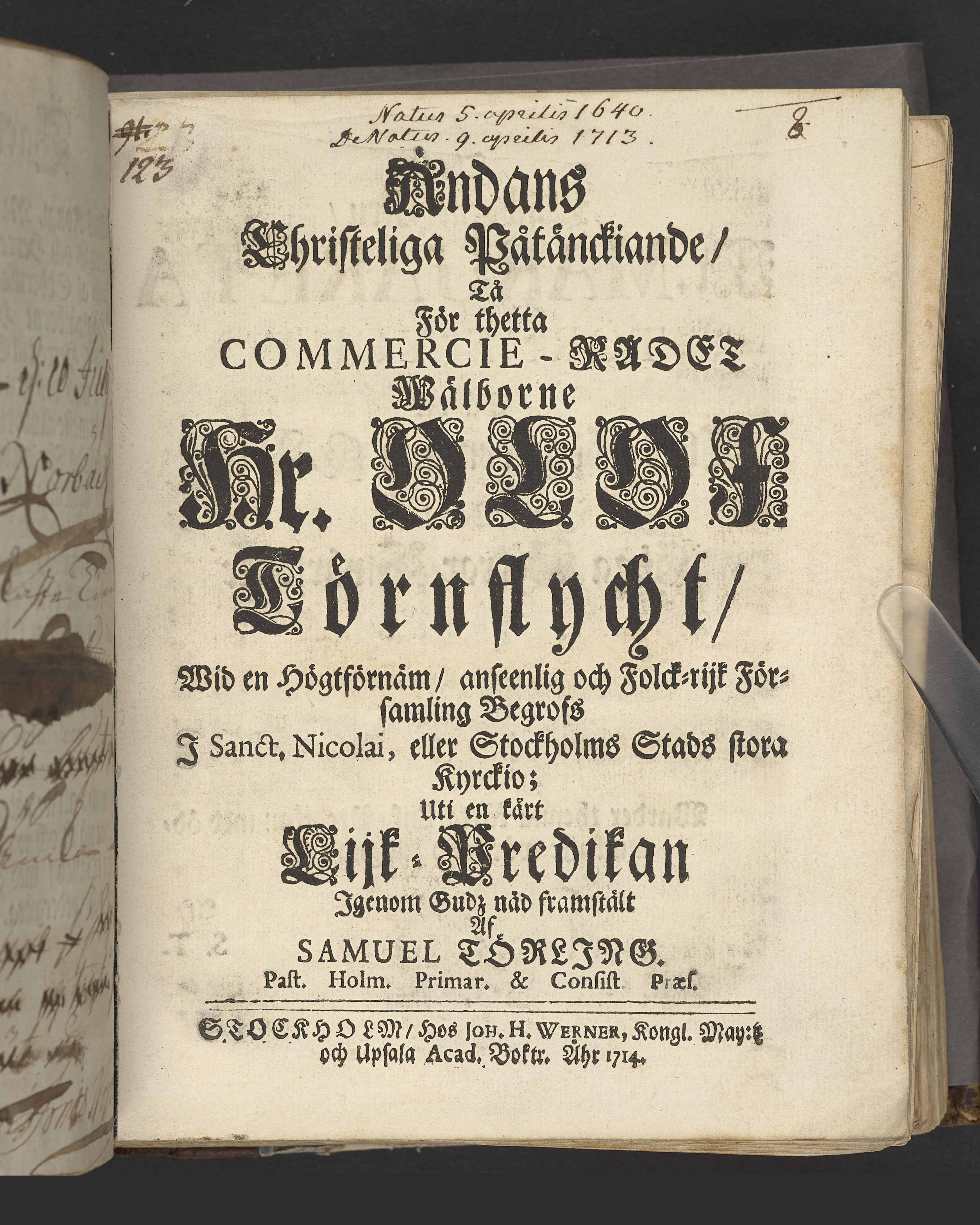 Andans christeliga påtänckiande, tå... Hr. Olof Törnflycht... begrofs i Sanct Nicolai eller Stockholms stads stora kyrckio; uti en kårt lijk-predikan... framstält af Samuel Törling... Stockholm, hos Joh. H. Werner... 1714.