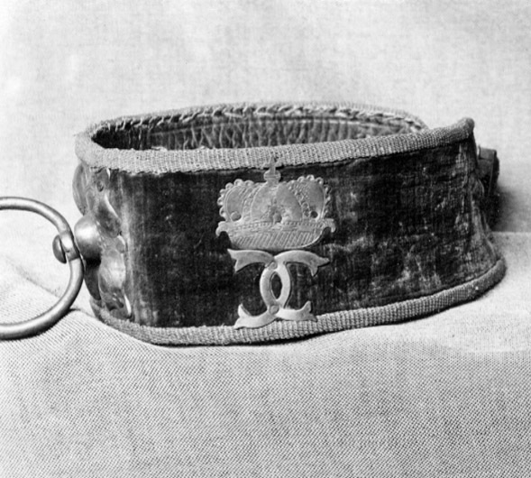 Halsband av grön sammet fodrat med brunt läder och kantat med silvergalon. På utsidans mitt ett kvadratiskt beslag av förgylld mässing med en stor ring, punsad dekor på beslaget. På vardera sidan ett spegelvänt C krönt av kunglig krona. I ena änden rektangulär sölja av förgylld mässing, i andra stropp av halsbandets material med ändbeslag av förgylld mässing.