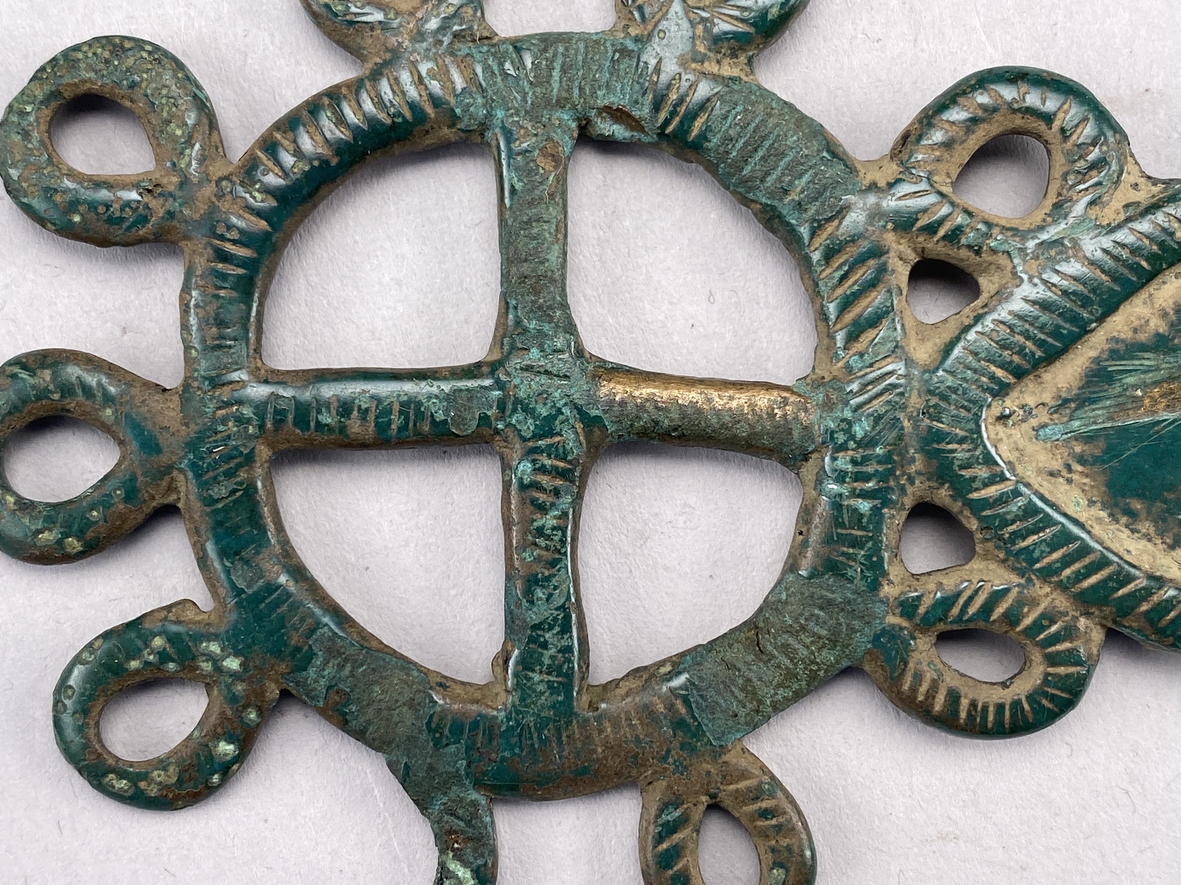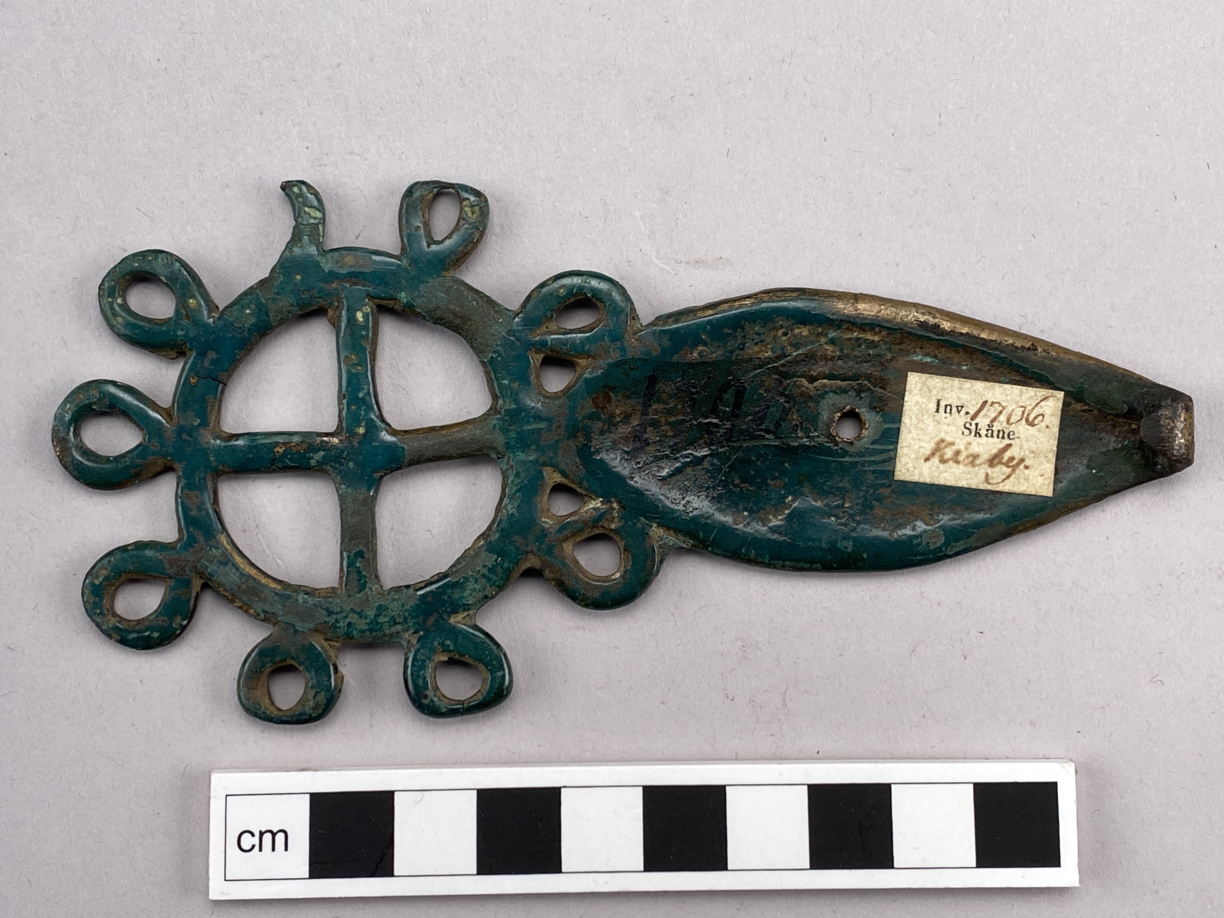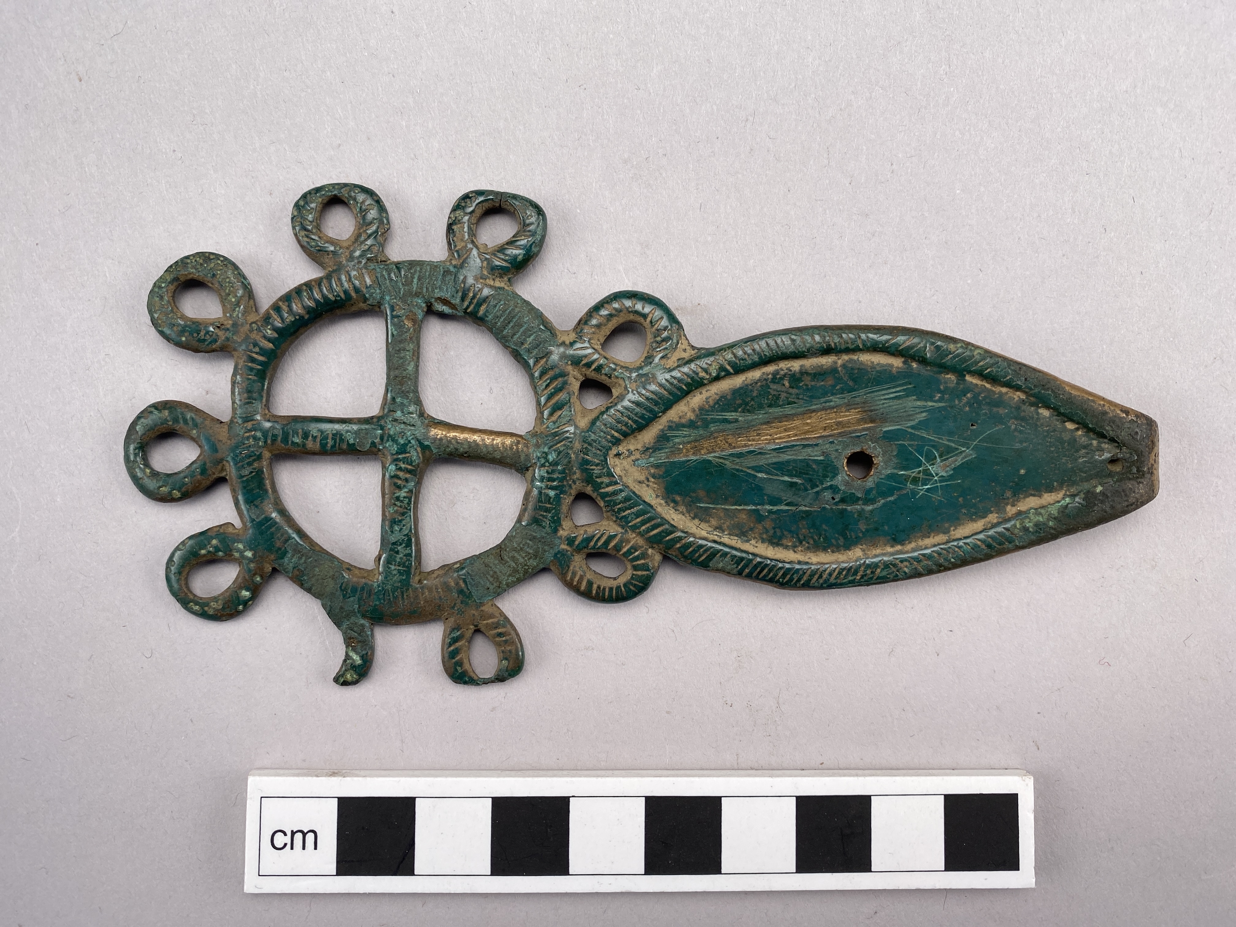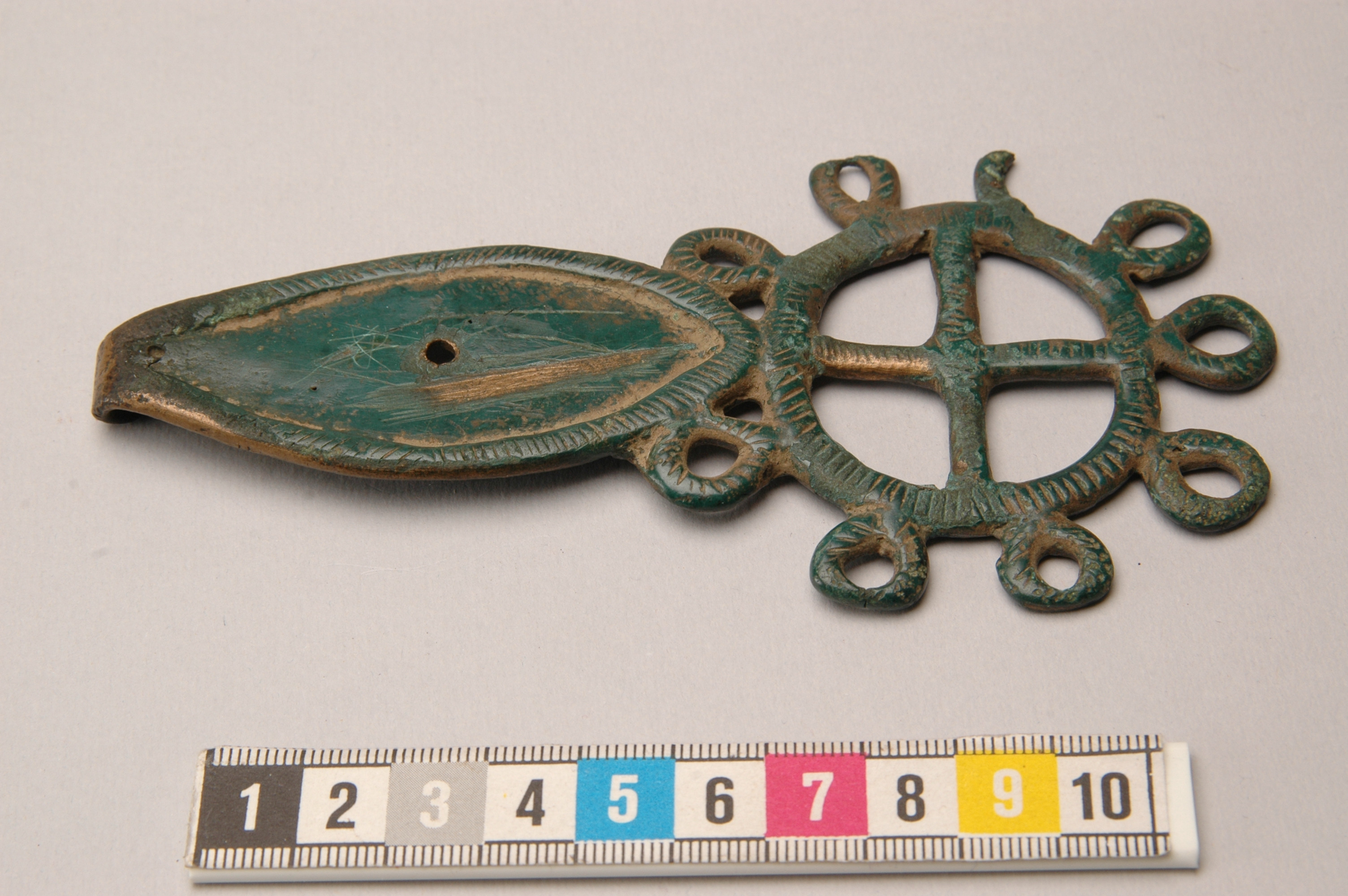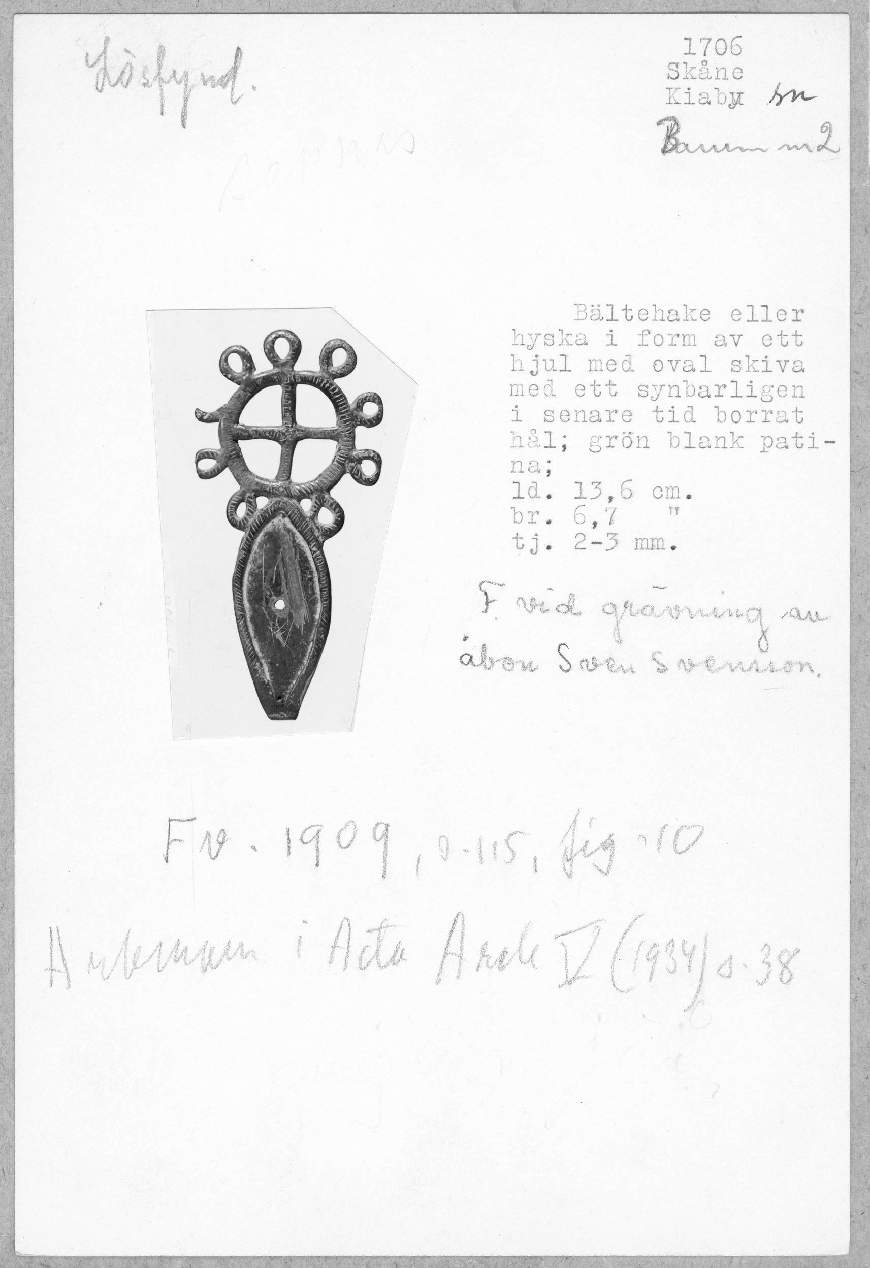 Bältehake eller hyska av brons i form av ett hjul med oval skiva med ett i senare tid borrat hål. Dekor på listerna av snedsgraffering