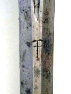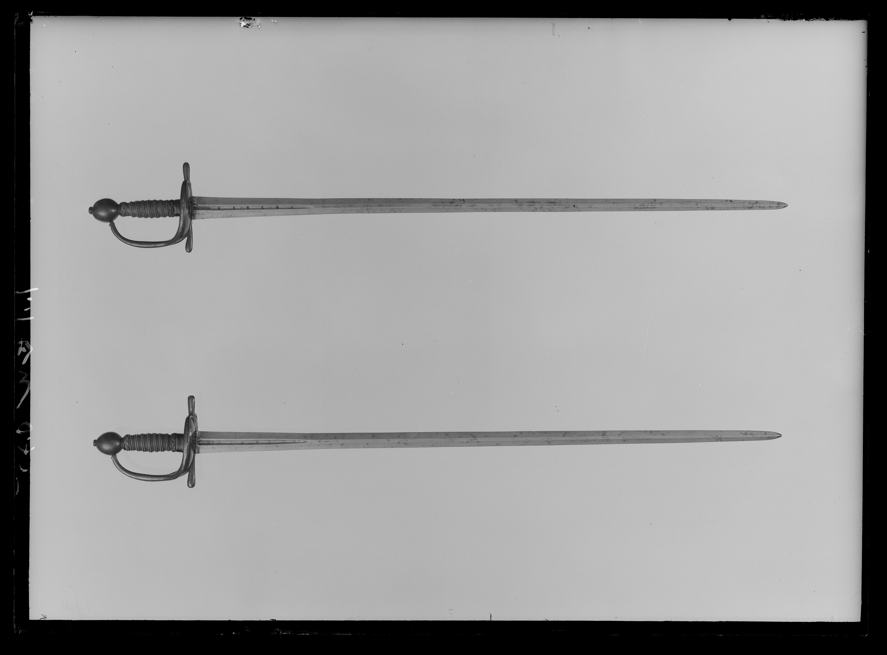 Modellenlig. Fäste av blånerat stål med sliten blånering, på inre parerplåtens ovansida punsat N. 6:. Kavellindning och kransar av mässingstråd av två olika tjocklek. Tvåeggad klinga med framåt avsmalnande plana åsar, på starka delen en 180 mm lång blodrand med inslagna bokstäver, omväxlande N O K R mfl, framför blodranden punsad, korsformig dekor. Vid klingbasen på båda sidor delvis synliga proberstämplar.