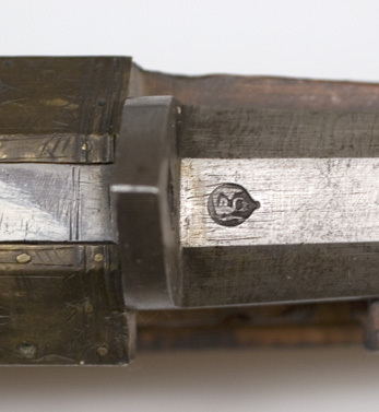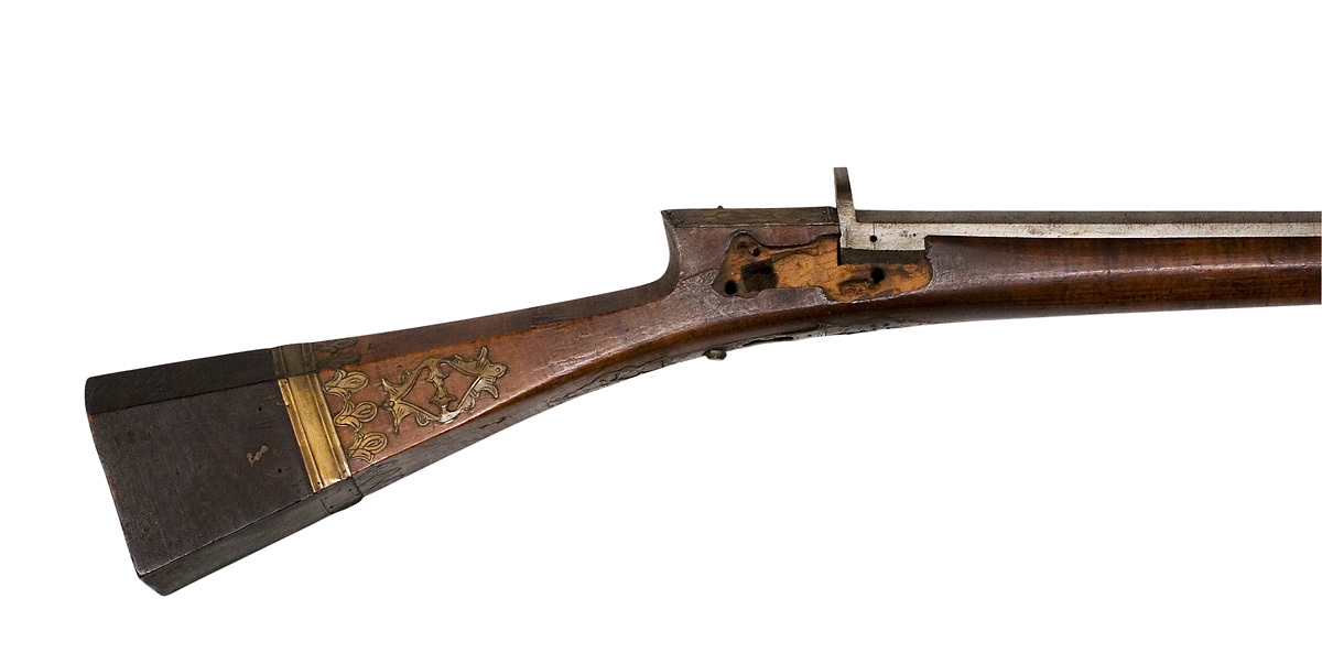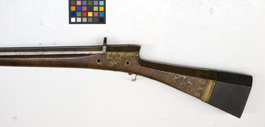 Åttsidig, slätborrad pipa av stål, mynningen något vidgad. Bak på kammarens ovansida rund stämpel med arabiska skrivtecken. Graverade tvärstreck på svansskruvbladet. Sikte i form av hål genom uppskjutande spetsig skiva av stål bak på pipan. Knoppkorn av mässing. På mynningens undersida graverade tecken. Fyra pipband av mässing, på ovansidan, vidgade, konturerade och graverade. Låset saknas. Hål för två låsskruvar. Brun helstock av trä. Rak, sexsidig, bakåt vidgad kolv med smal rygg, smal hals, skarp nacke. Kolvens bakre del av mörkare trä. Runt kolven profilerat band av mässing. Därframför treflikiga graverade blad. På sidorna genombrutna graverade mässingsbleck. Runt svansskruvbladet konturerat, genombrutet och graverat mässingsbleck, neddraget på vänster sida. Konturerade och graverade låsskruvsbrickor av mässing. Genombrutet, konturerat och graverat mässingsbleck runt avtryckarskåra och kryssskruv. Stockens framände av horn. Tillbehör: Laddstock av trä, 825 mm, lång med 118 mm lång doppsko av stål med knappformig avslutning.