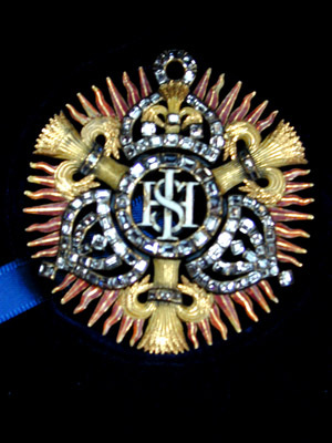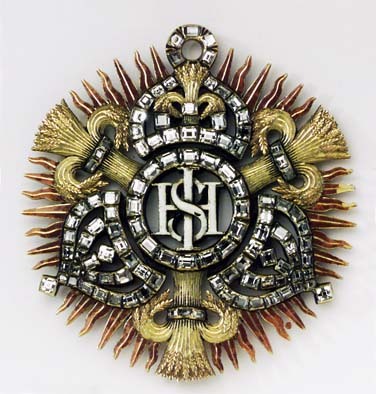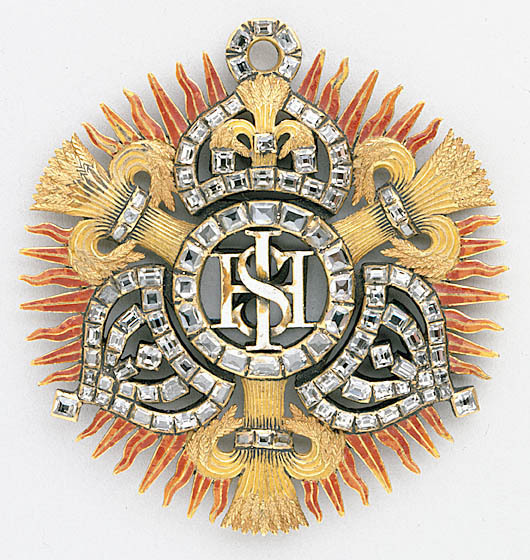 Ordenstecken, lika på båda sidor. Vitemaljerat, genombrutet namnchiffer I H S, omgivet av en ring med 16 taffelslipade diamanter. Därutanför tre slutna kronor, en och två. Den övre kronan har i stället för mittbåge en vasakärve av guld med en taffelslipad diamant på mitten och en på vardera sidan. Upptill på kronan en ring besatt med fem diamanter, på kronan i övrigt 17 diamanter. De två andra kronorna likadana med en rombiskt ställd diamant i stället för kors, på vardera kronan 29 diamanter. Mellan kronorna en vasakärve av guld, sammanbunden av band besatt med 3 diamanter. Mellan kronor och kärvar rödemaljerade, åsade solstrålar, varannan rak, varannan böljande, på vardera sidan om den övre kronan sex strålar, i övrigt sju. Ordenstecknet skänktes sannolikt till Boguslaw Radziwill (1620-1669) för att ha räddat kung Karls liv vid slaget vid Warsawa 1656. Två polska hussarer ska, enligt polsk historieskrivning, ha attakerat kungen varpå Radziwil dödade en och kungens livvakter den andre.Tecknet fanns 1913 i familjen Radziwills ägo på slottet Nieswies utanför Minsk (se Cederström). Excerpt ur Hedvig Eleonoras bouppteckning 1715, fotostatkopia HGK, NDt 1999-02-09): sid 25 Noch En annan Modele till samma(?) orden, som Konung Carl Gustaff ärnat uthgifwa effter Hennes Högst Sal. Maij.t egen annotation bestående af 3 Waser och 3 Cronor, inbundit JHS besatt med 220 st Taffelstenar, wärd 1000:-