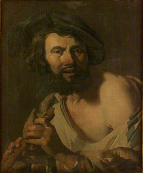 Bröstbild, fas vänster. Brunt hår och skägg, svart barett. Gulbrun mantel med blå band, höger axel lämnas bar. Med båda händerna håller han en flöjt. Brun fond. På duken daterat : "Ano 1625". Kilad spännram. Förgylld ram med pastellageornament. Ramlistens bredd 90 mm. På förgylld lapp fäst vid ramens framsida : "No 28 okänt". På spännramens baksida "H. Terbruggen" , med blyerts. Möjligen äldre, svartmålad ram bakom den nya. Oläslig text med blyerts på den nya ramens baksida. Man with a flute. This dated but unsigned painting has the same composition as the one know as "Man with a flute" (present location unknown) ) attributed to the joint workshop of Hendrick Ter Brugghen and Dirck van Baburen, which they supposedly shared in Utrecht during the early 1620s. Although, clearly the same in composition, this painting at Skokloster differs from the other in the expression of the face, most notably the left side, which could suggest that they were painted by different hands. The date on the canvas most likely excludes Baburen as the only artist, but connects the painting to a case of similar dated studio replicas like "Singer" by Baburen. The painting depicts a bearded man holding a flute looking straight at the beholder executed in a Baburen-like manner with all the characteristics of the Caravaggio inspired artists from Utrecht. According to Leonard Slatkes, the unsigned and not dated painting with the same composition called "Man with a flute" was probably part of a series representing the five senses of which it was "Hearing". The series also included the painting "Man with a pipe and jug". For further information regarding the painting referred to as "Man with a flute" see Slatkes 1965, Dirck van Baburen, Fig 47, Cat. D5, and Slatkes & Frantis 2007, The paintings of Hendrick Ter Brugghen, WTBVB 18, Plate 113.