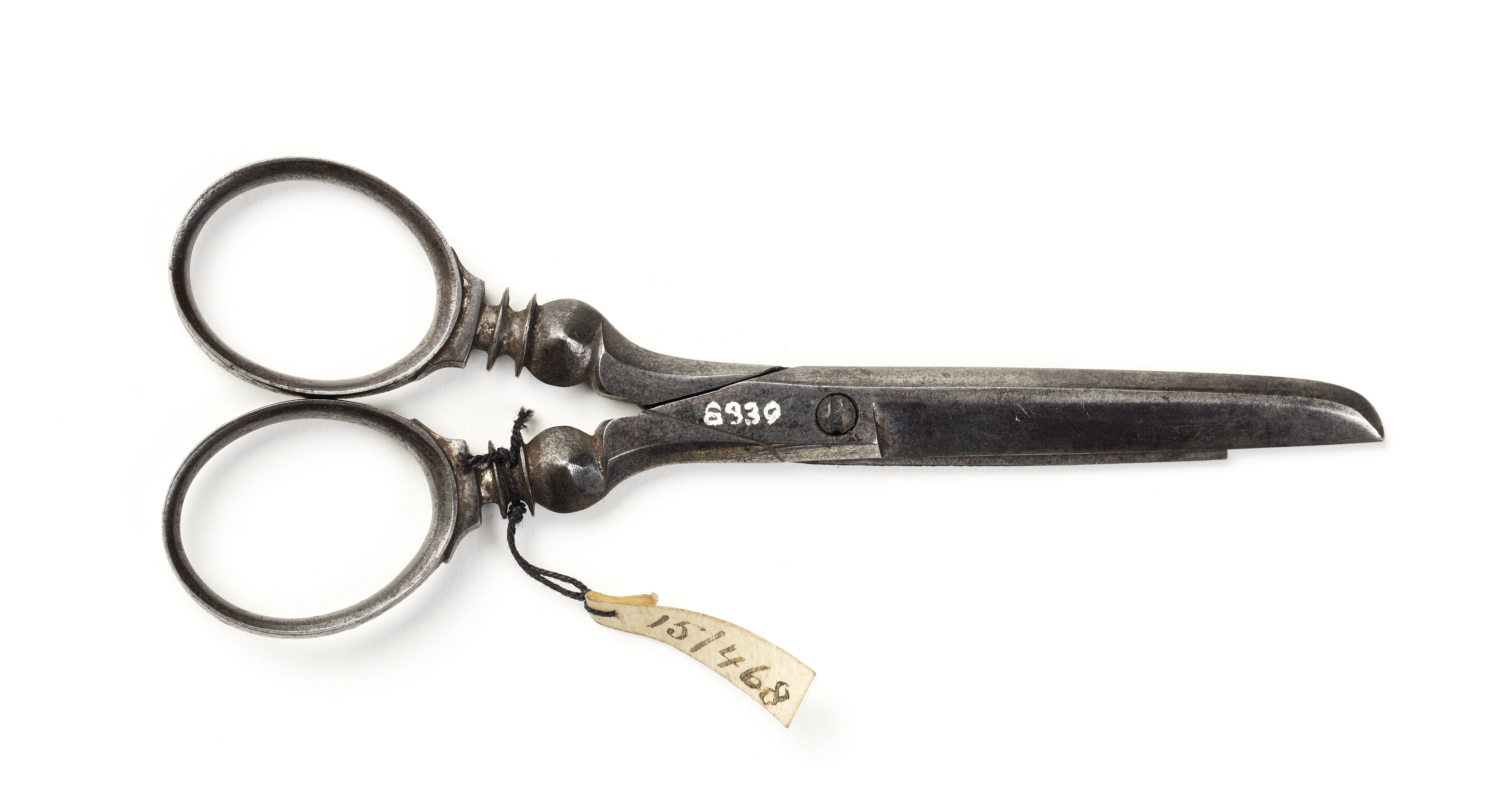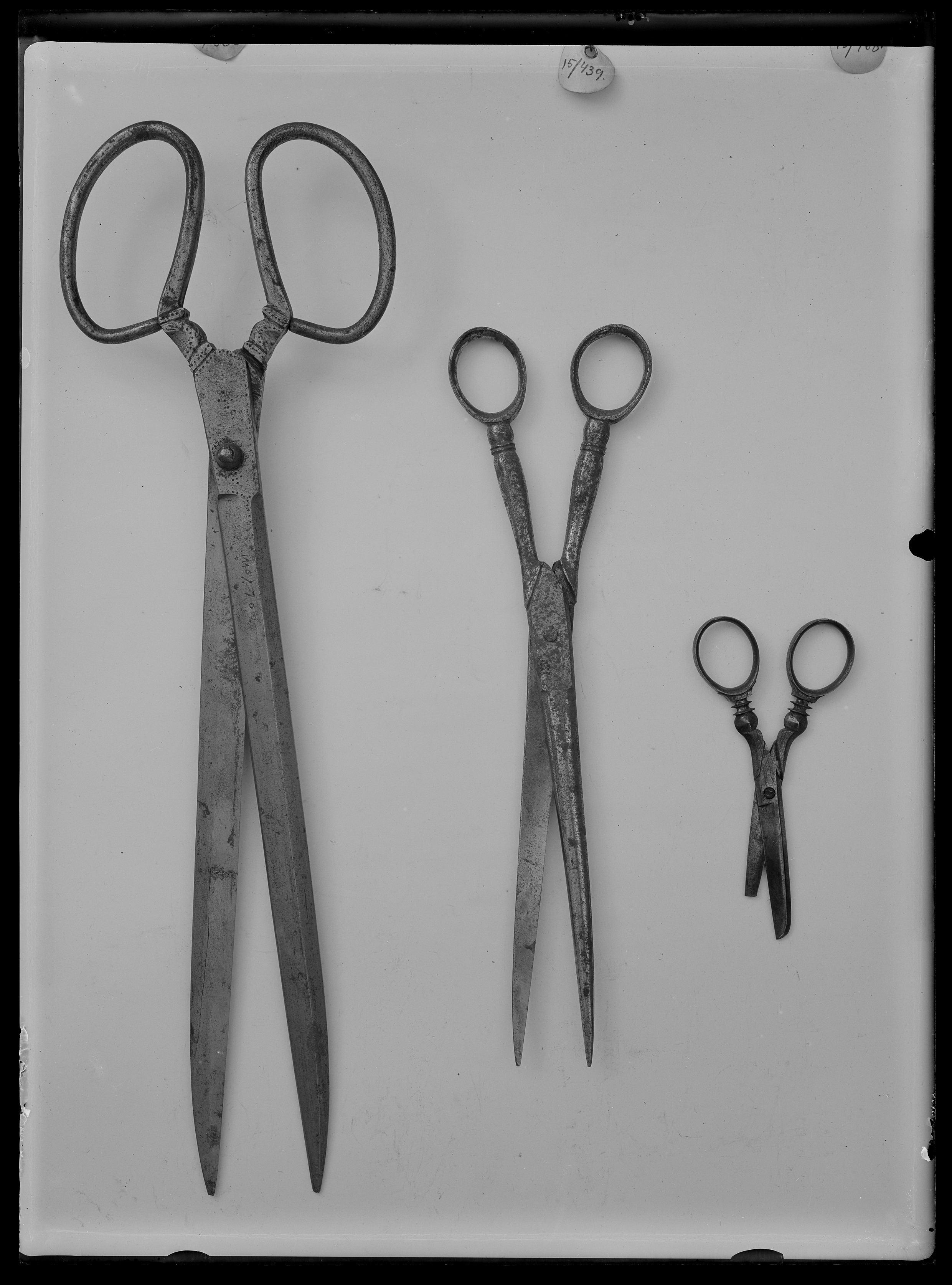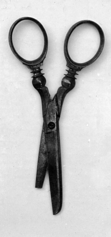 Sax med ett rakt, trubbigt blad och ett spetsigt. Enkel, hopskruvad led. Raka, profilerade skänklar med ovala fingeröglor.