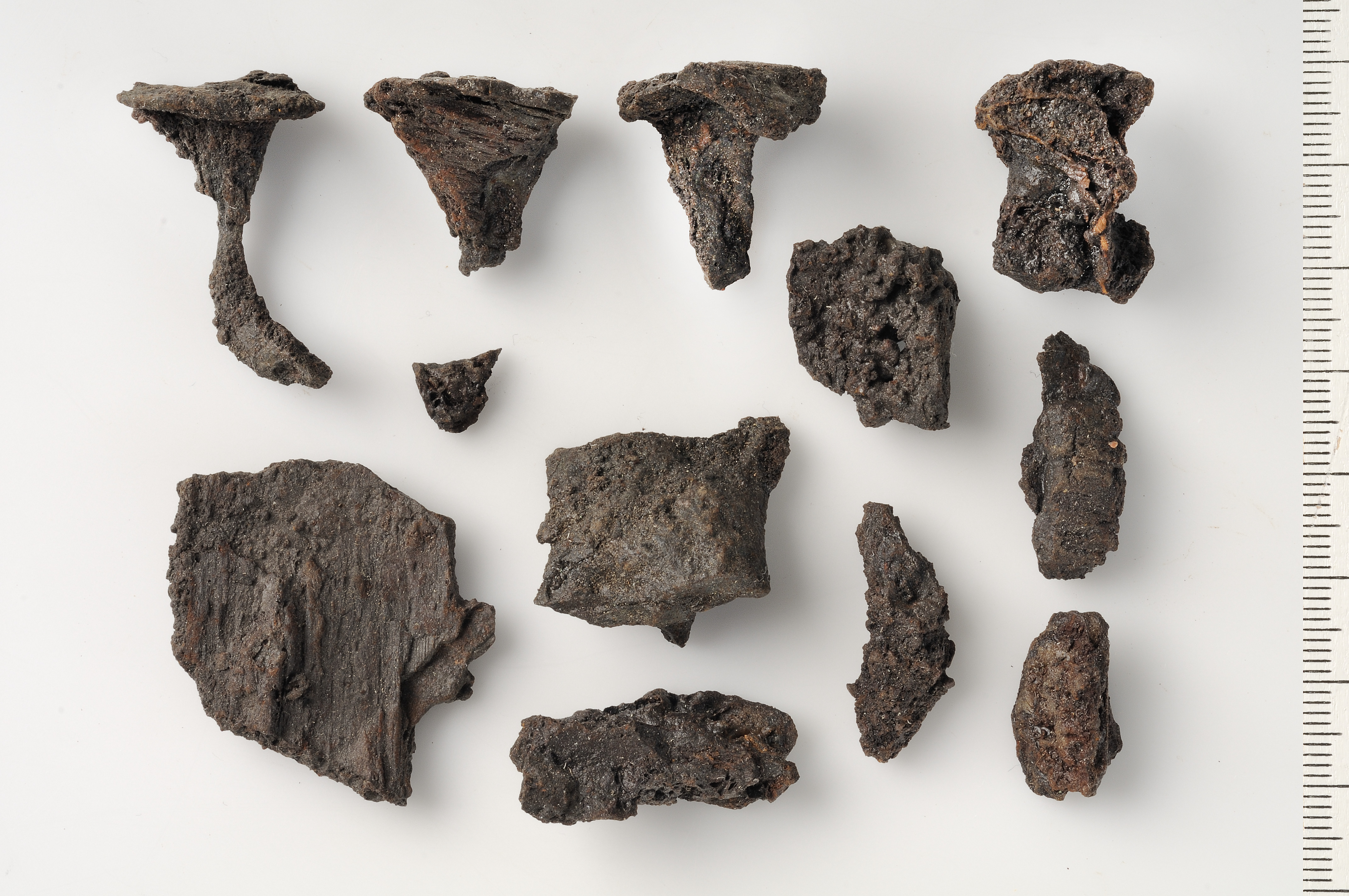 10 nit- och spikfragment samt 1 större, ev felplacerad, bit järnplåt med vidsittande trärester.