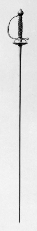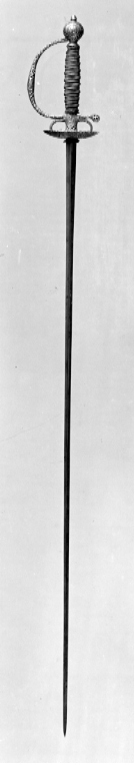 Fäste av stål med genombruten ornering. Knapp närmast klotformig, nitknapp hög, foprmad som en konturerad, stympad kon. Handbygel med ovalt tvärsnitt, överdelen intappad nedtill i knappen. Bakre parerstång med droppformig ytterände, böjd något nedåt-utåt. Fingerbyglar rundat böjda, ornerade med längsgåene smala räfflor. Parerplåtar njurformigt symmetriska, något skålformiga. På ut- och insidan av knapp, handbygelns mittparti kryssets överdel och båda parerplåtarna en oval medaljong med olika musikinstrument. Orneringen i övrigt bestående av genombrutet gallerverk och bårder av löst tvinnade band med genombrutna runda hål. Kavellindning av blånerad lan av stål och oxiderad lan av silver omväxklande med tämligen tjock spunnen ståltråd och kedjeliknande flätning av tunn silvertråd. Upptill och nedtill en flätad krans av tvinnad tunn silvertråd. Klinga rak, treeggad; inre sidan plan. Utan ornering.