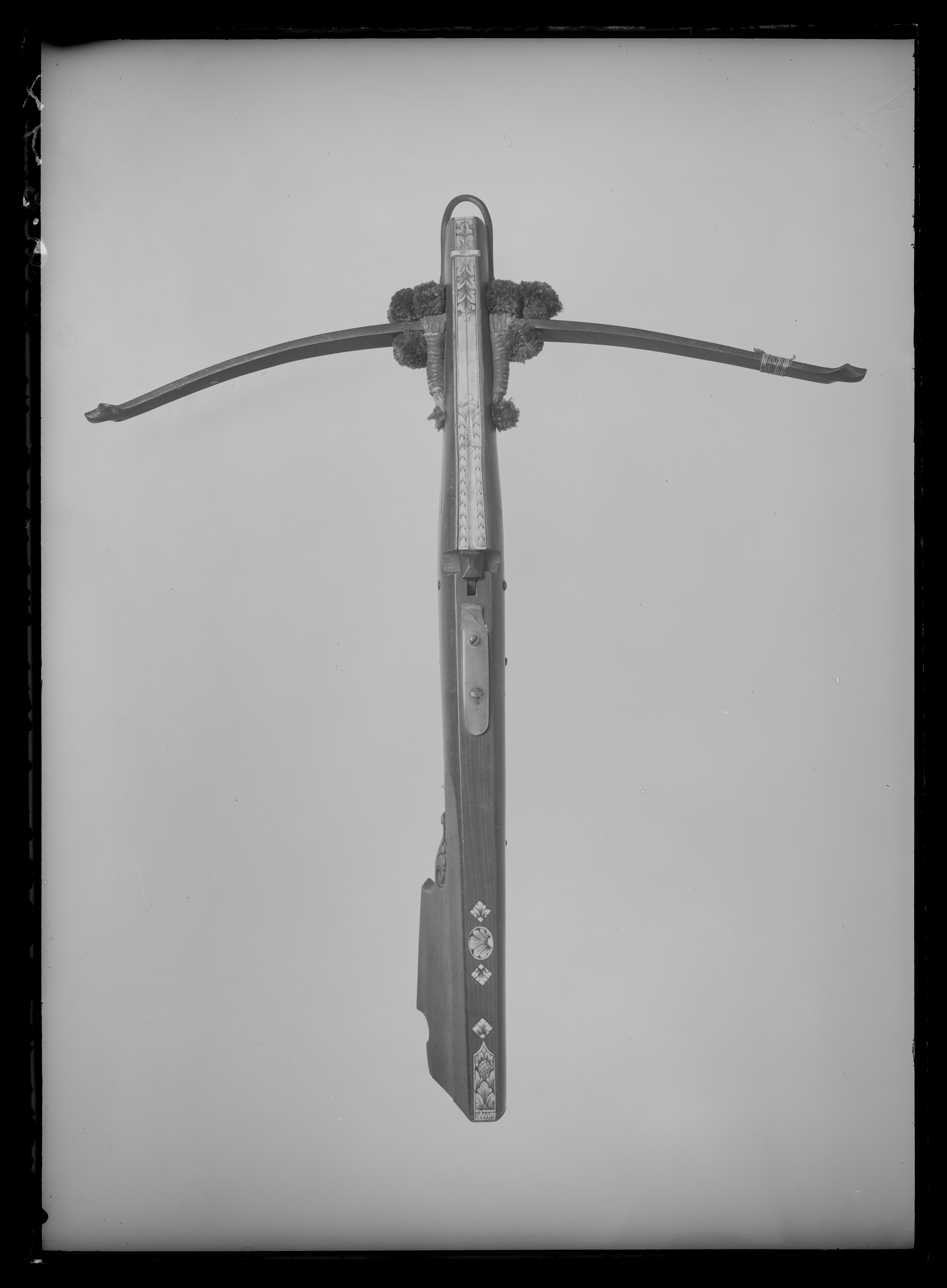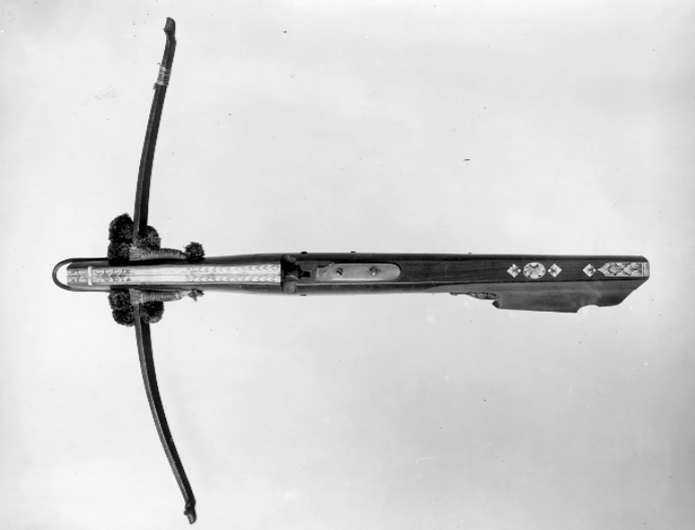 Båge av stål, fäst i hål i stocken med snörning av hampa(?). Snörningen prydd med runda tofsar av blått silke. På ena bågarmen flätad silkesnodd, troligen ursprungligen med tofs. Lås med nöt av stål och snälltryck. Stock av polerad mahogny med pilränna av graverat ben. Bakom låset är en avbruten del av ljust horn. Kolv av tysk typ med snidad bladvolut vid vingen. Bakplåt av horn. På vingen graverad rektangulär benplatta. Kolvryggen ornerad med graverade benplattor bl.a. romber och snäcka. Framtill på stockens undersida urtag för handen. Framtill på ovansidan inlaxat pilläge av ben. Bakåt utdragen varbygel av stål. I stockens framända bygel av stål.