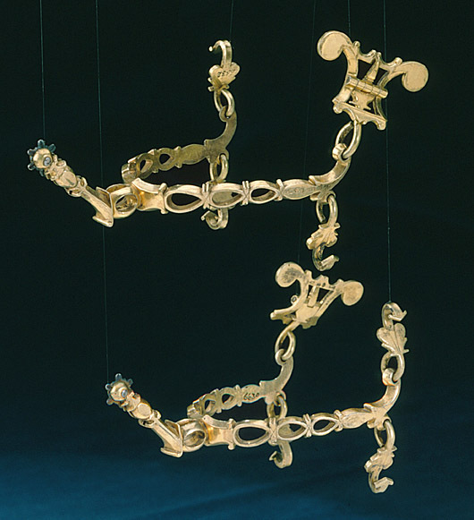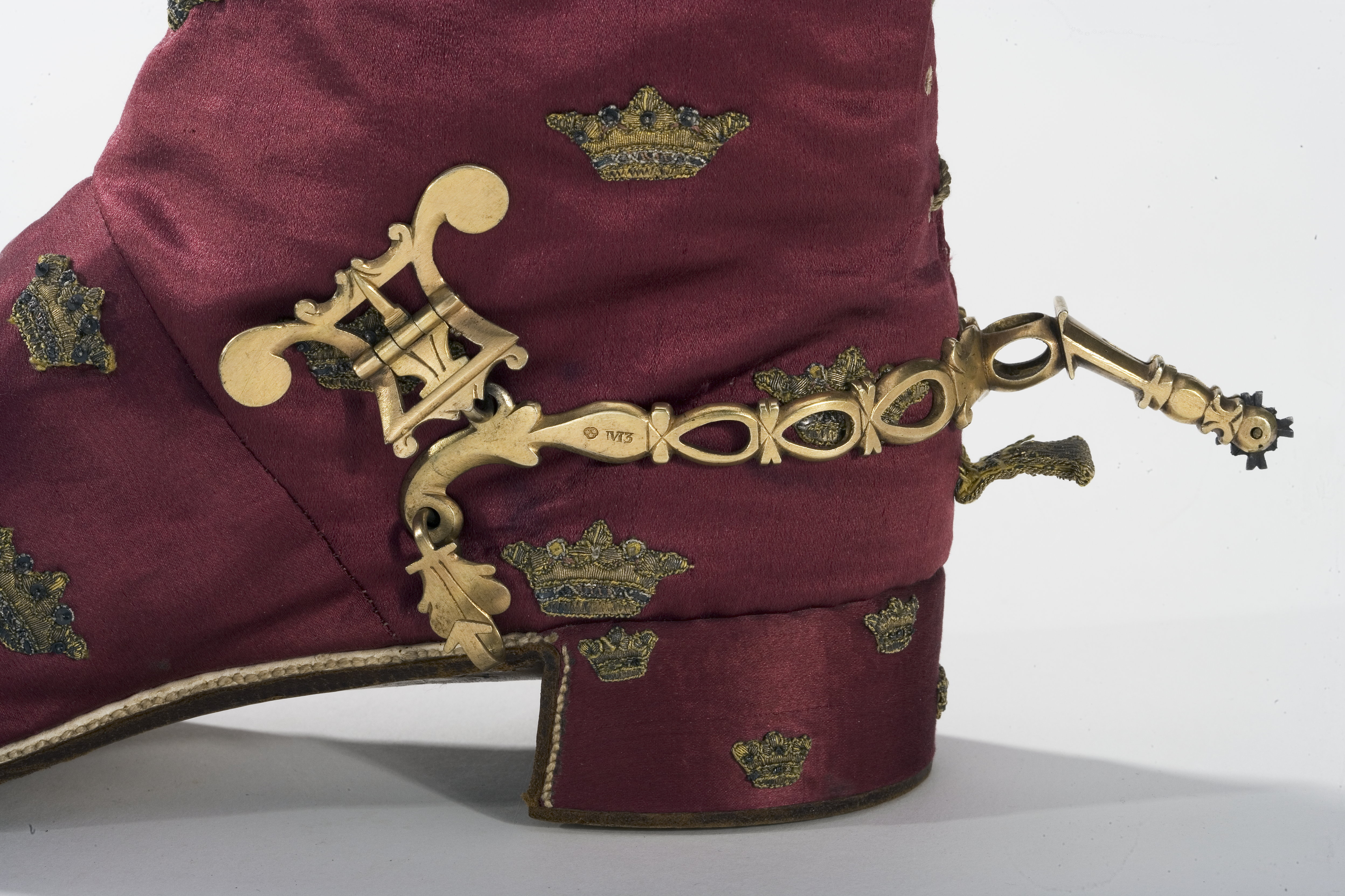 Sporre av förgyllt silver med genombrutna öglor. U-formiga skänklar med uppåtböjda ytterändar med öglor, i vilka är fäst 3 hjärtformiga krokar och en sölja med två utdragna, inrullade sidor. På söljan stämplar: CGB, H3 [M3], tre kronor (SS nr 1934, Carl Gustaf Blomborg, Stockholm 1818). Samma stämplar finns på skänkarna. Böjd sporrhals, l: 47 mm, med genombruten bas och rak arm med en klinga av stål med 4 trubbiga taggar. Upptagen i inv. 1867 tillsammans med Gustav III:s kröningsdräkt.