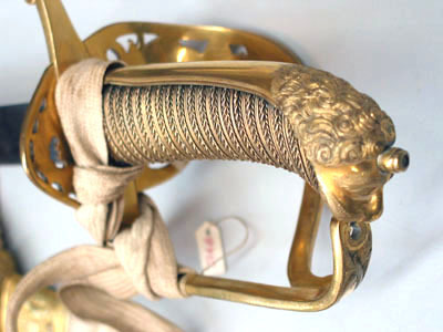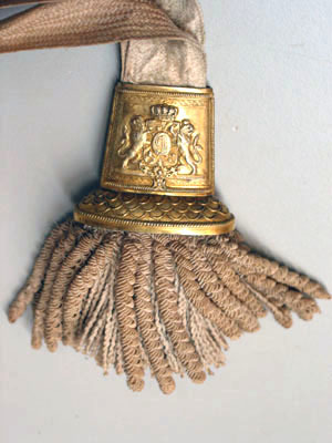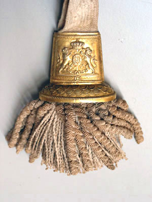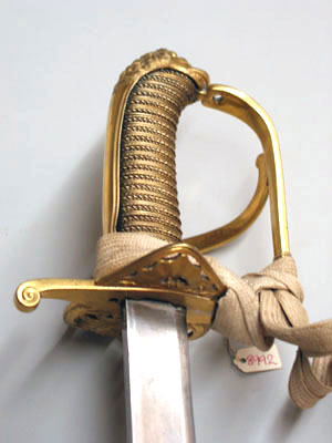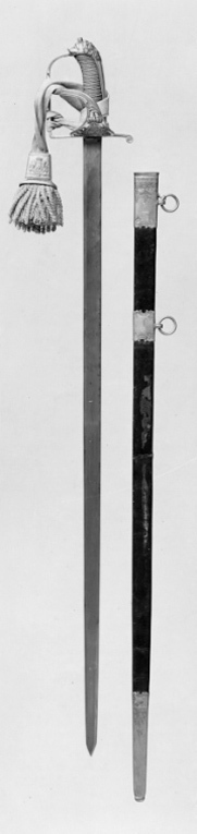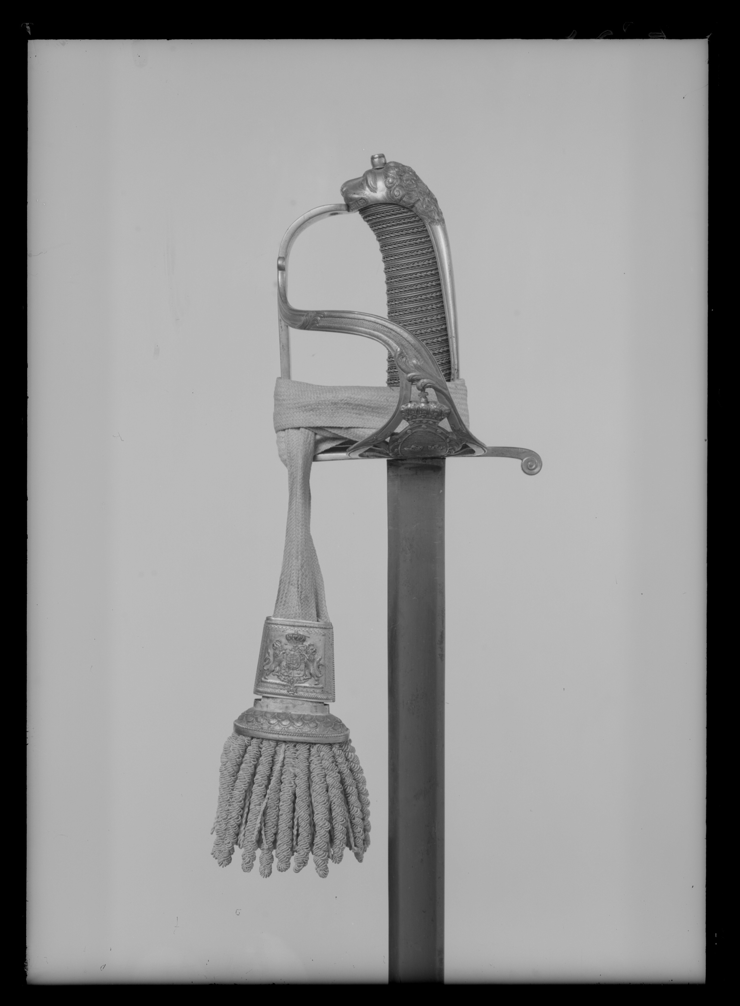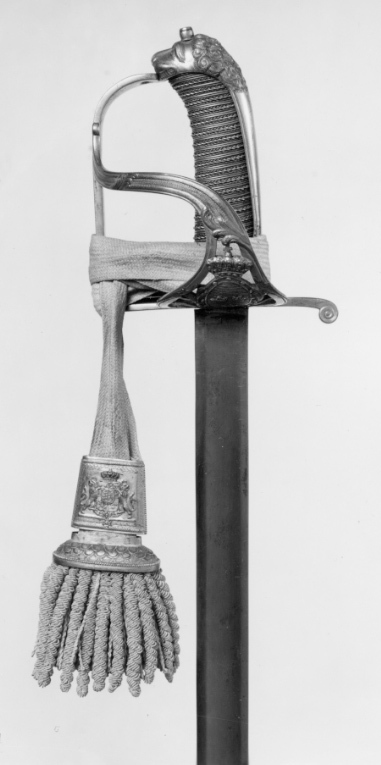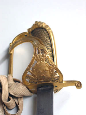 Sabelfäste av reliefornerat förgyllt silver med rak främre parerstång övergående i en rak handbygel, upptill böjd inåt och intappad i kappans framåtböjda överdel, formad som ett lejonhuvud som baktill övergår i en slät konvex ryggskena. Från kryssets utsida utgår en nedtill bred, parerplåt som uppåt avsmalnar och övergår i en s-formad sidobygel anslutande till handbygelns överdel. Parerplåten nedtill genombruten, i mitten en krönt oval trekronorssköld, som på sidorna är omgiven av palmblad. Parerplåten och sidobygeln med släta kantbårder och glest belagd med akantusblad. Kaveln lindad med förgylld silvertråd. Klinga rak, eneggad utom vid den ca 190 mm långa spetsen, som är tvåeggad. Utan ornering.