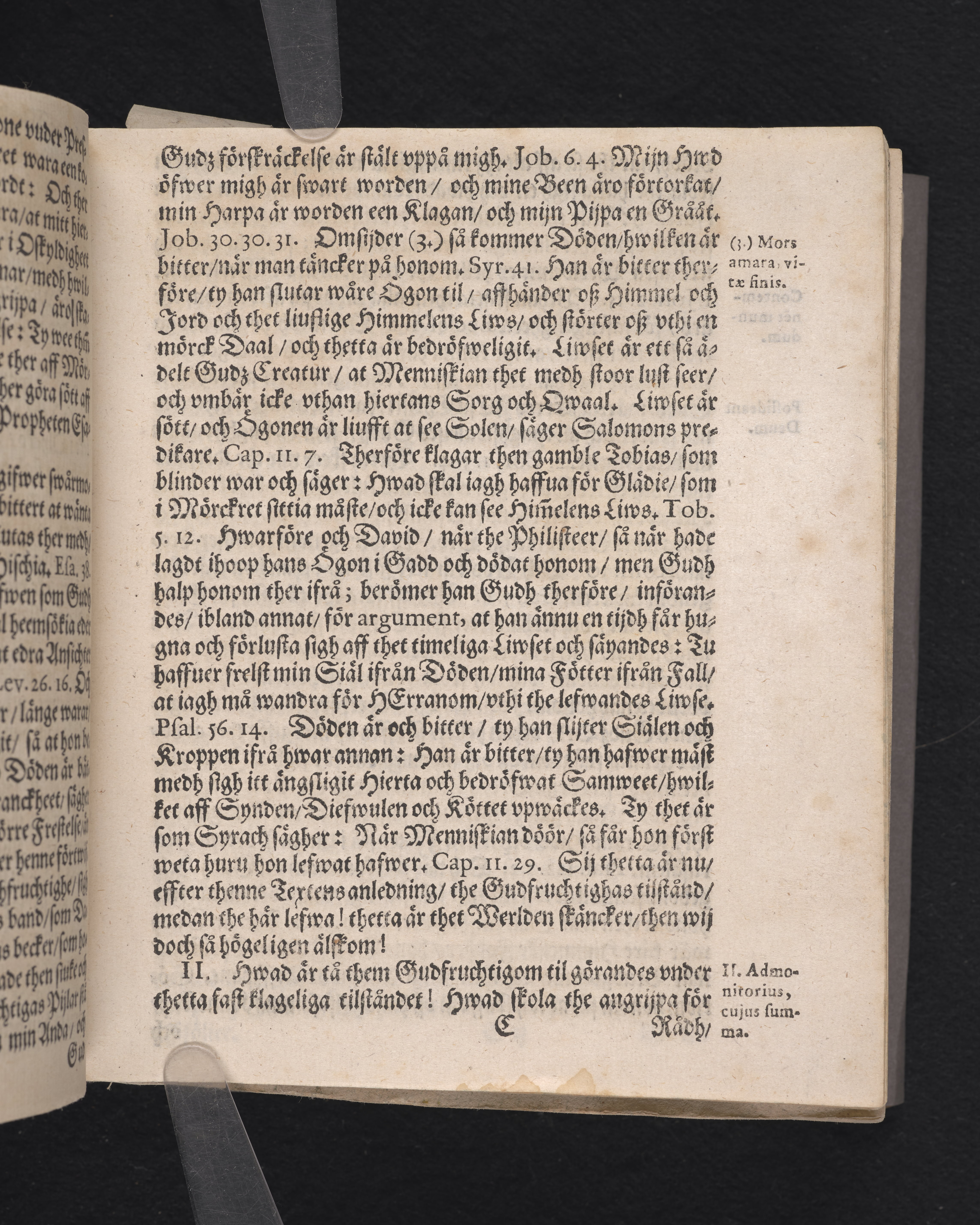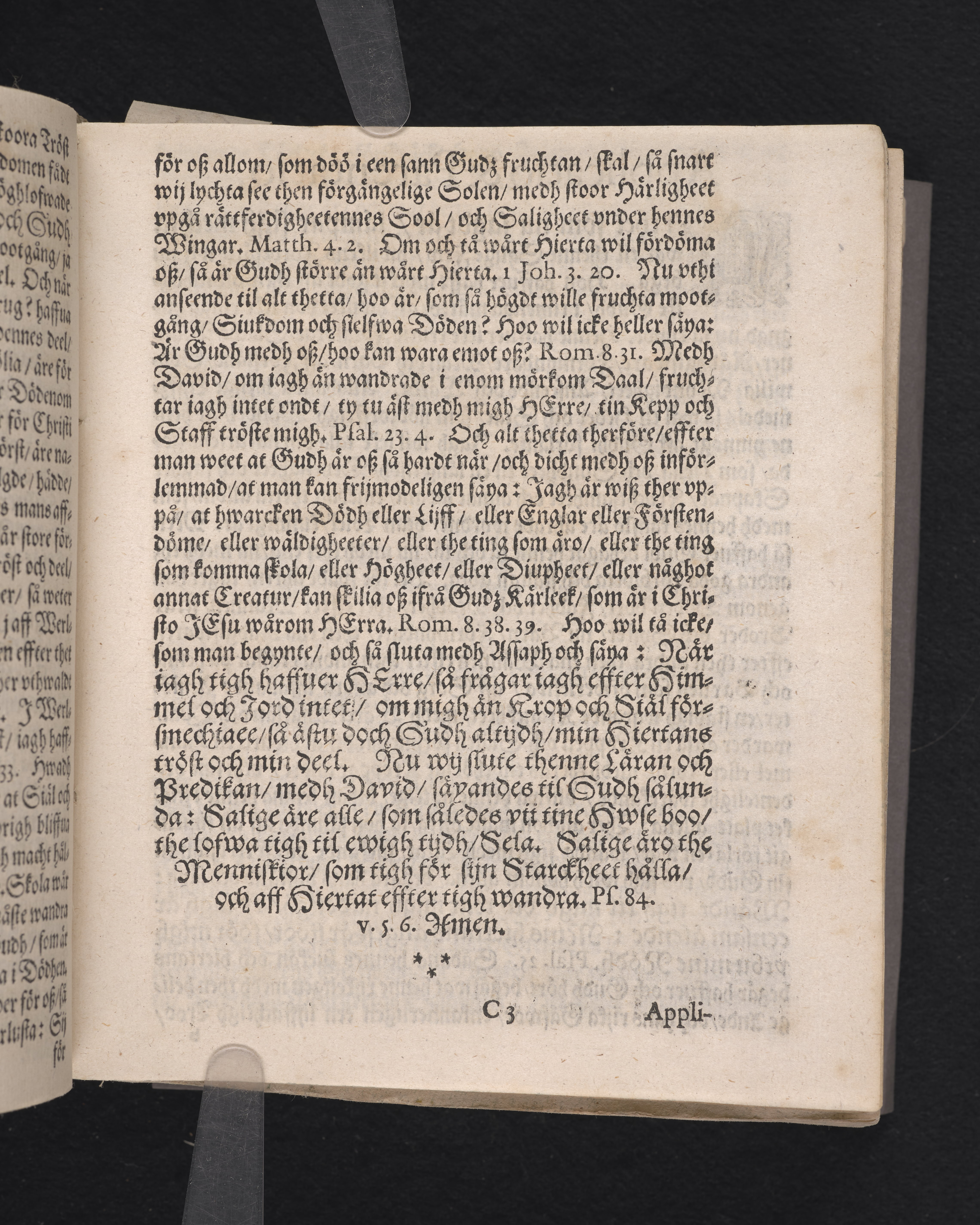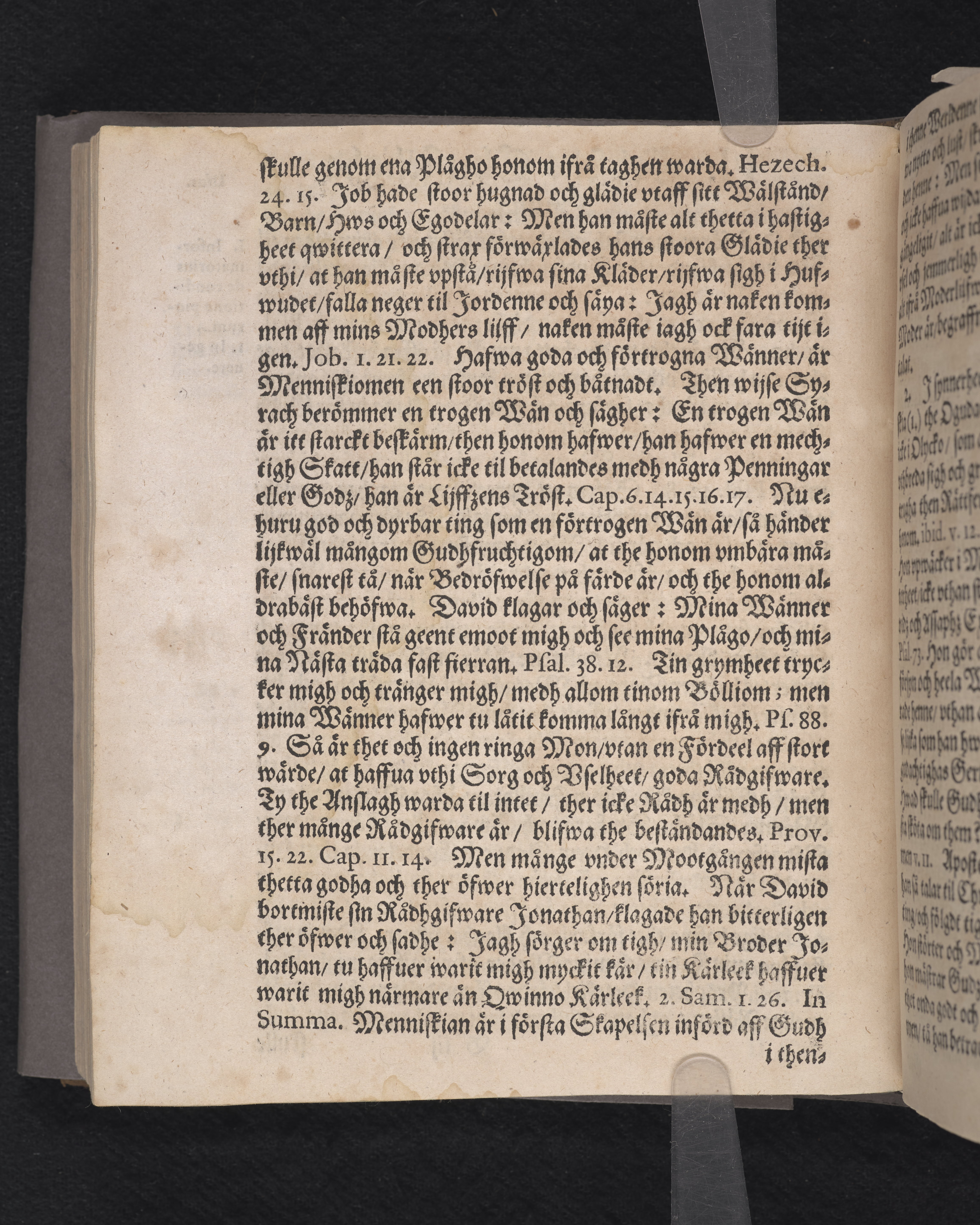 Helskinnsband av svart får, fast rygg. Stickade kapitäl. Snitten skurna, stänkfärgade i blått.