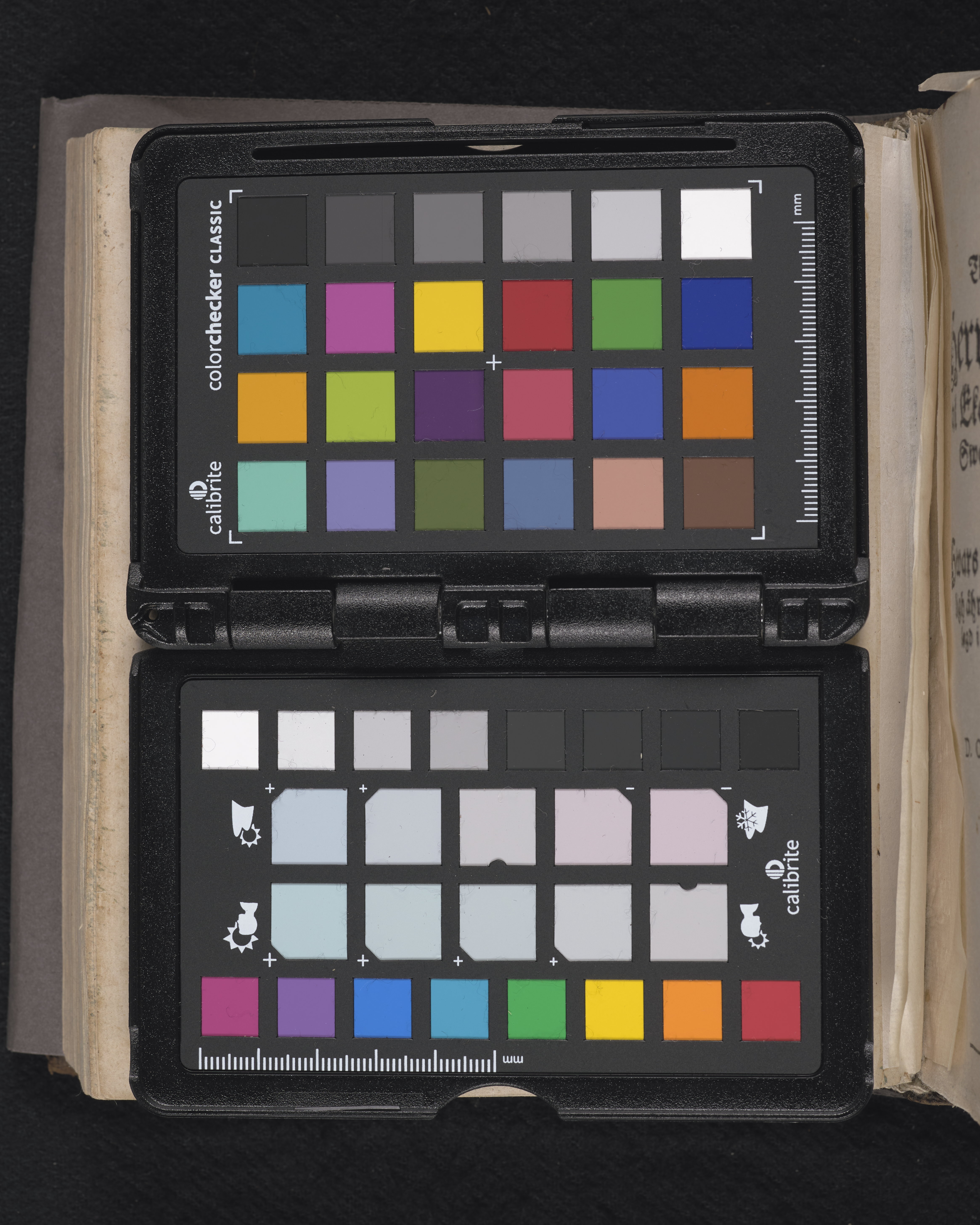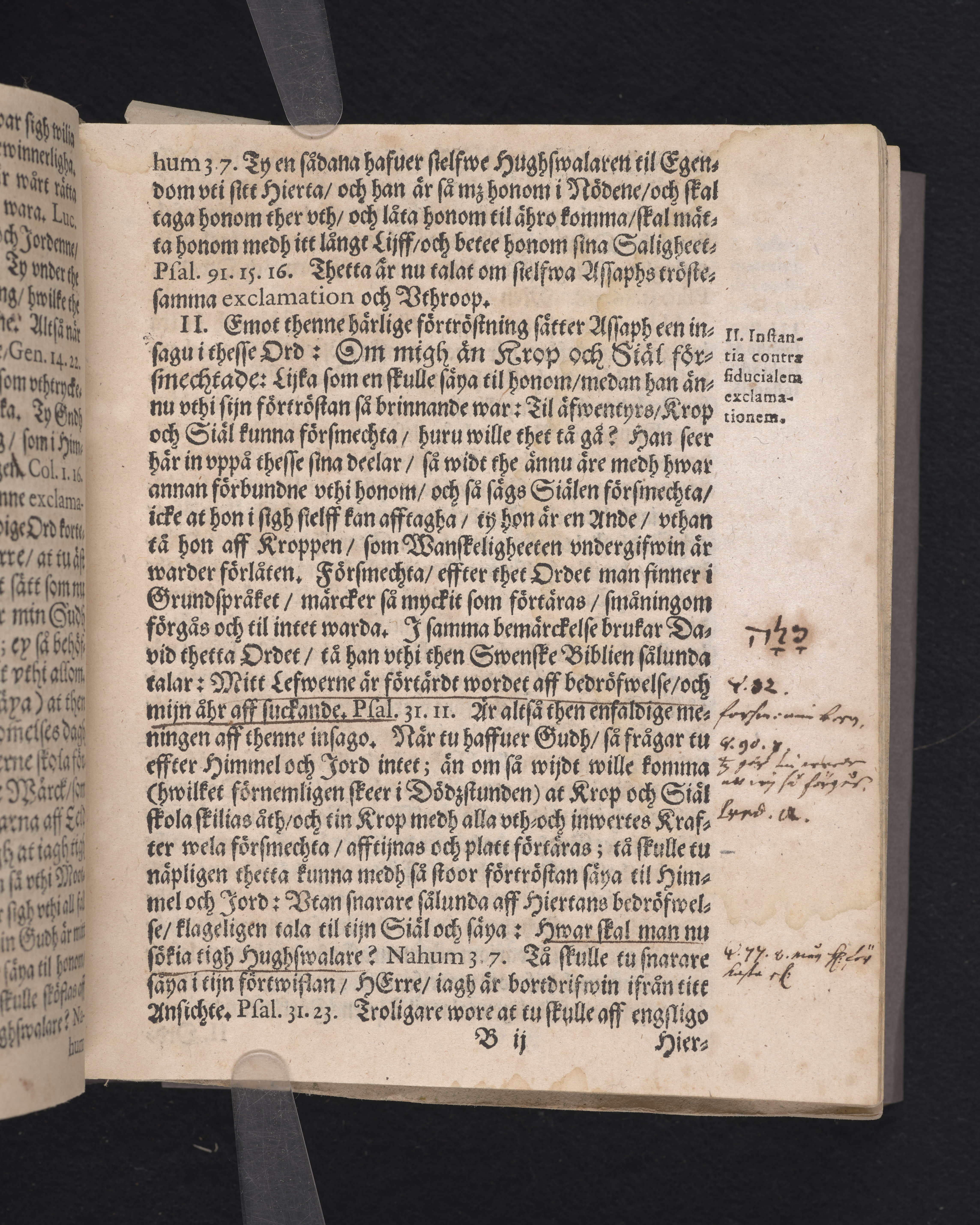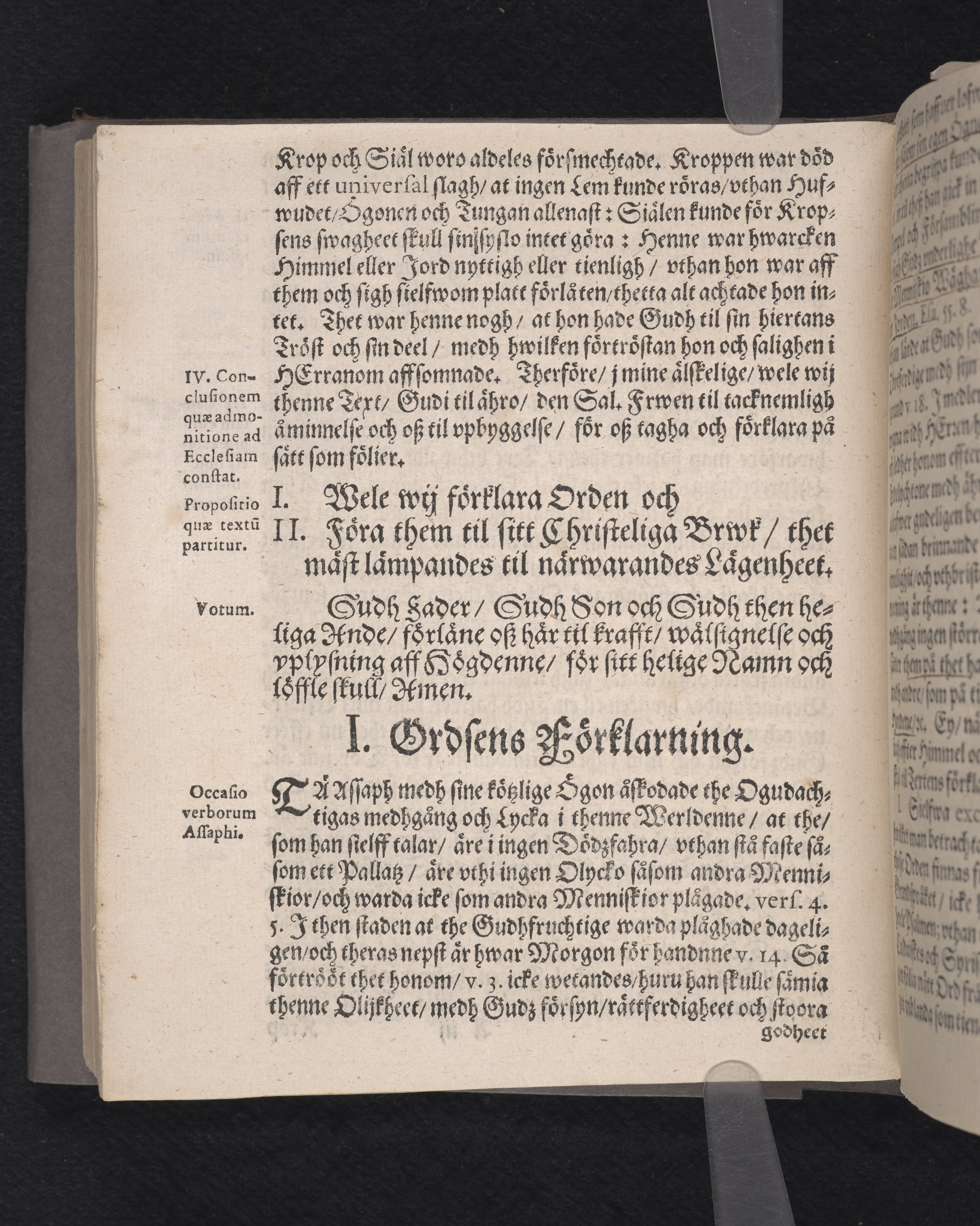 Helskinnsband av svart får, fast rygg. Stickade kapitäl. Snitten skurna, stänkfärgade i blått.