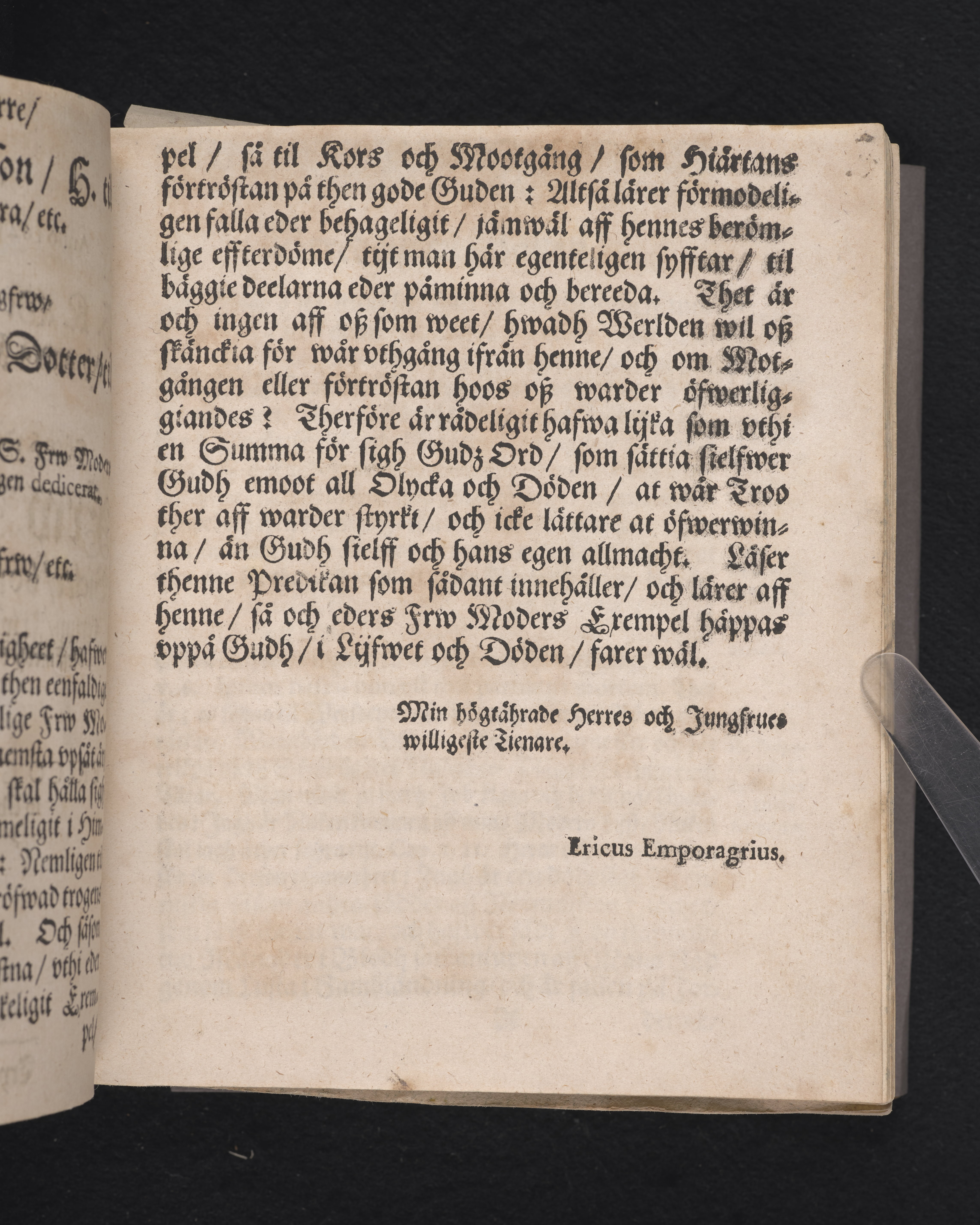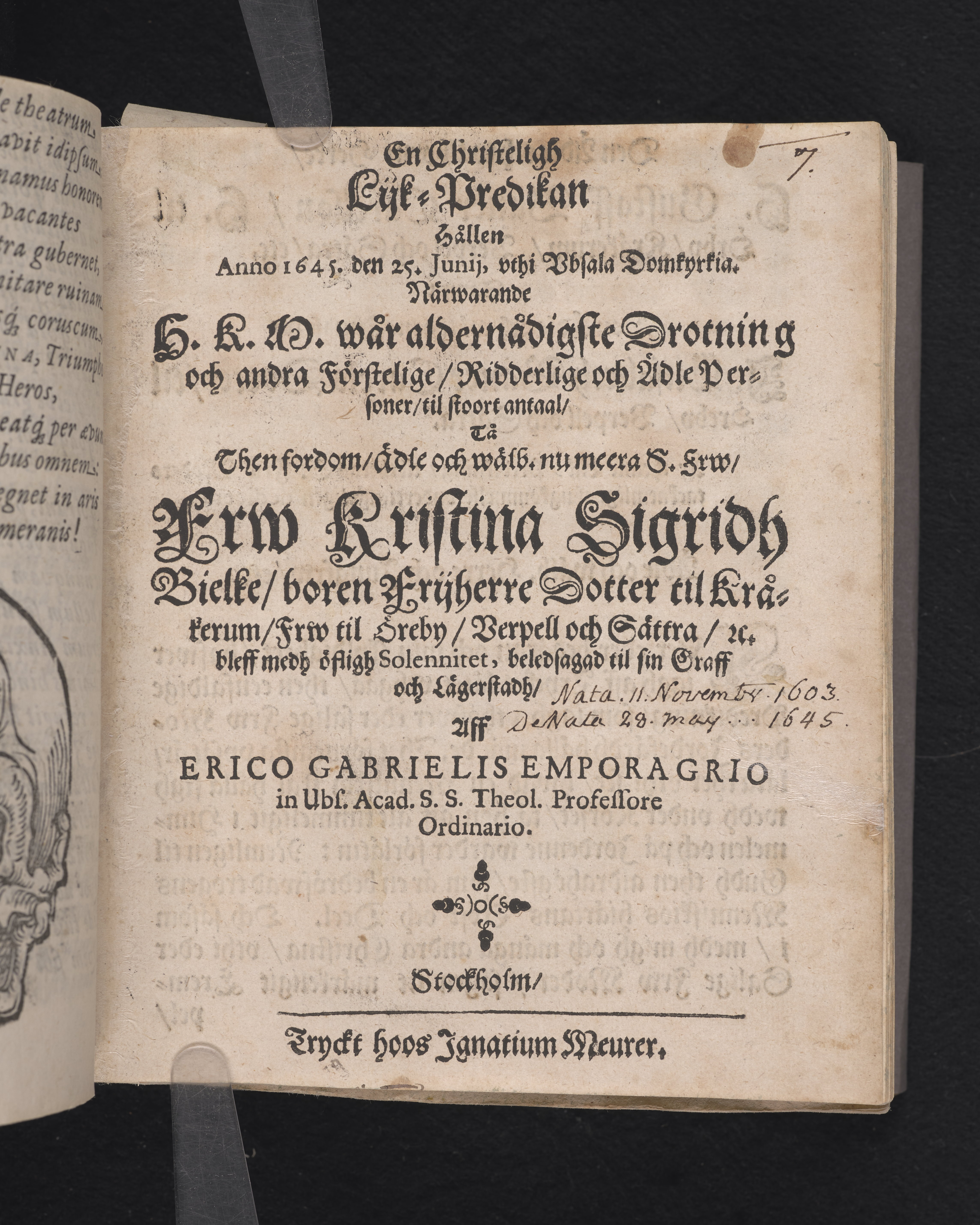 En christeligh lijk-predikan hållen anno 1645. den 25. Junij, vthi Vbsala domkyrkia ... tå then fordom, ädle och wälb. nu mera s. frw, Frw Kristina Sigridh Bielke, boren frijherre dotter til Kråkerum ... bleff medh öfligh solennitet, beledsagad til sin graff och lägerstadh, aff Erico Gabrielis Emporagio ... Stockholm, tryckt hoos Ignatium Meurer.