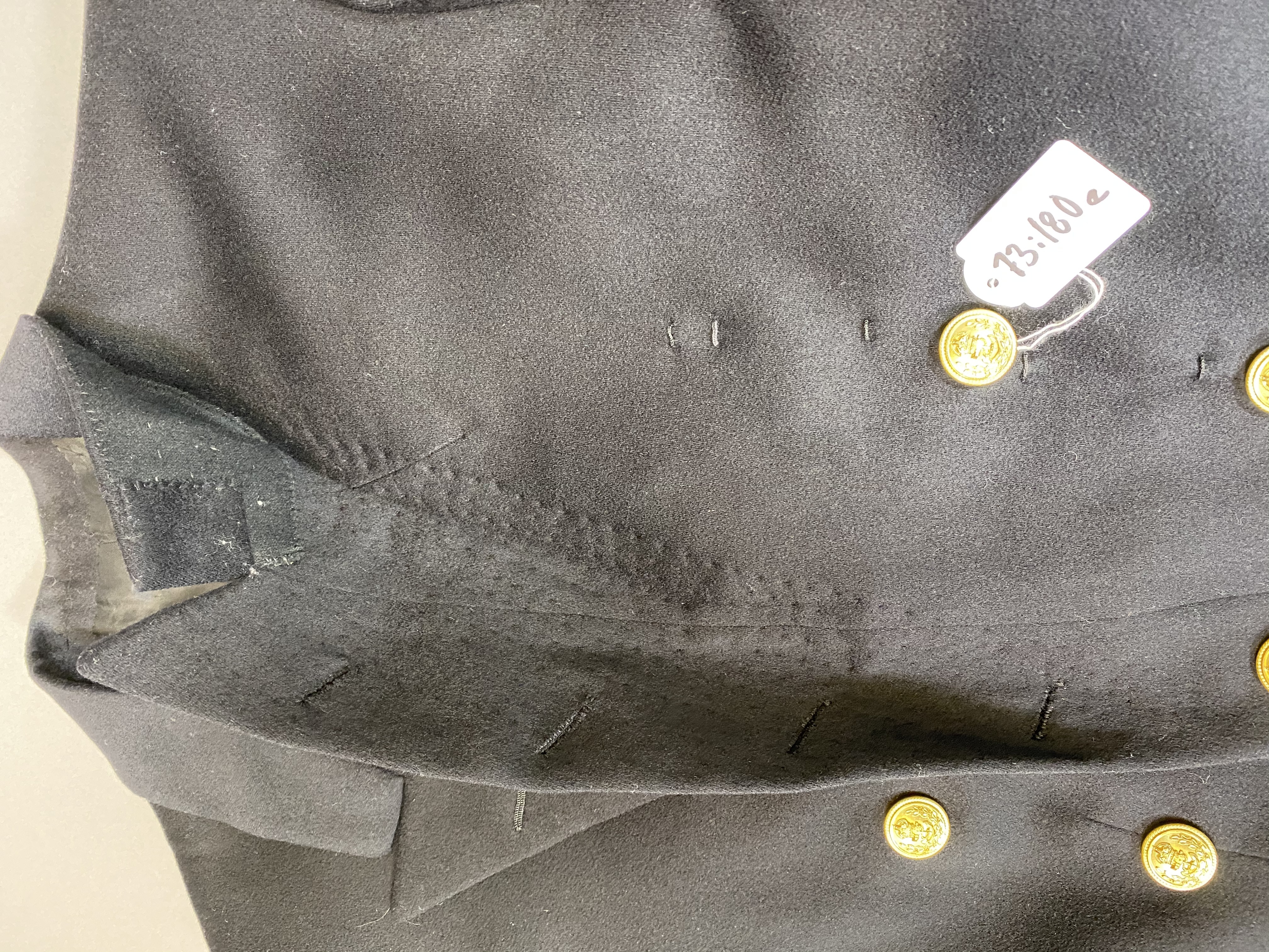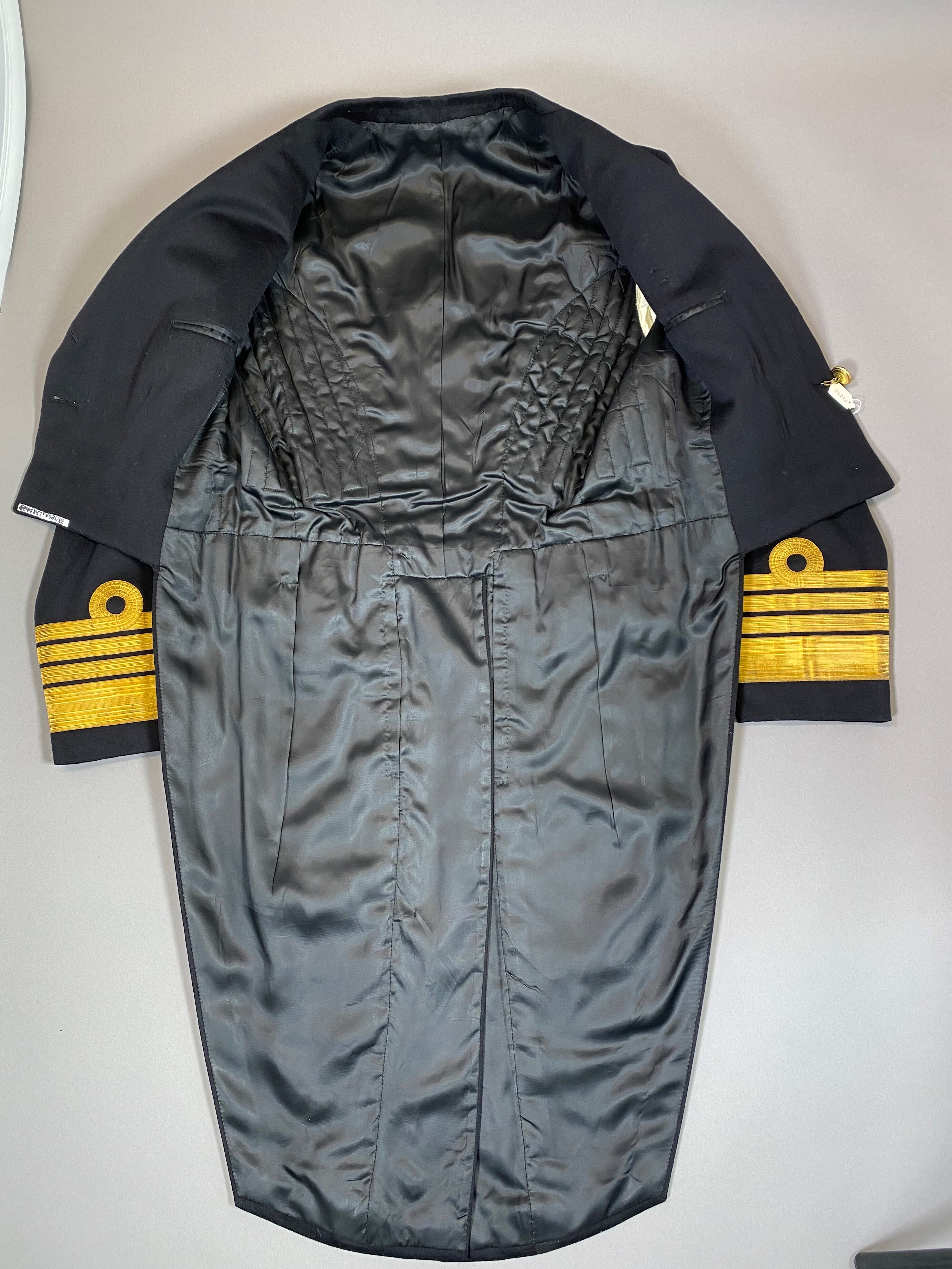 Frack av svart kläde med fällkrage. På vardera framstycke tre fasta knappar av förgylld mässing med krönt ankare och bladkrans. Längs vardera framkant sex knapphål, varav tre på slagen. Fracken hopfästes med lös dubbelknapp av samma typ som nämnts. På vänster slag två tryckknappar. På vänster framstycke sex tränsar. Ryggen sydd med livsöm. Ryggstycket sytt i tre våder. Sprund till livsömmen, på vardera sidan sprundet ett sytt motveck. I motveckens nederkanter en knapp vardera av nämnd typ, i dess överkanter likaså en knapp vardera. Spetsiga ficklock, b: 190 mm, med tre påsydda svarta snören. Vid varje snöres nederkant en knapp av nämnd typ. Isydda ärmar med gradbeteckning, längst ned: en 45 mm bred samt tre 18 mm breda guldgaloner varav den översta på ärmens utsida är lagd i en ring med diam: 53 mm. Foder av svart siden. Framstyckena fodrade med svart kläde. Ärmarna fodrade med vitt siden. I vardera framstycke en innerficka. I höger ficka en etikett: "Gieves // L.4.55.89=76153 // H.M. King Gustav Adolf." I vardera skörten en med vit bomull fodrad ficka. Sydd hos Gieves, England.