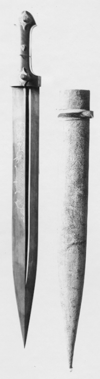 Balja på utsidan klädd med svärtat läder (får), på insidan med ljusbrunt skinn. Upptill med ringformigt beslag med på utsidan tresidigt tvärsnitt, av stål med rankdekor av påslaget guld, vid ena kanten ringformig hållare för bäranordning. Nedtill stöt + kula av ben.