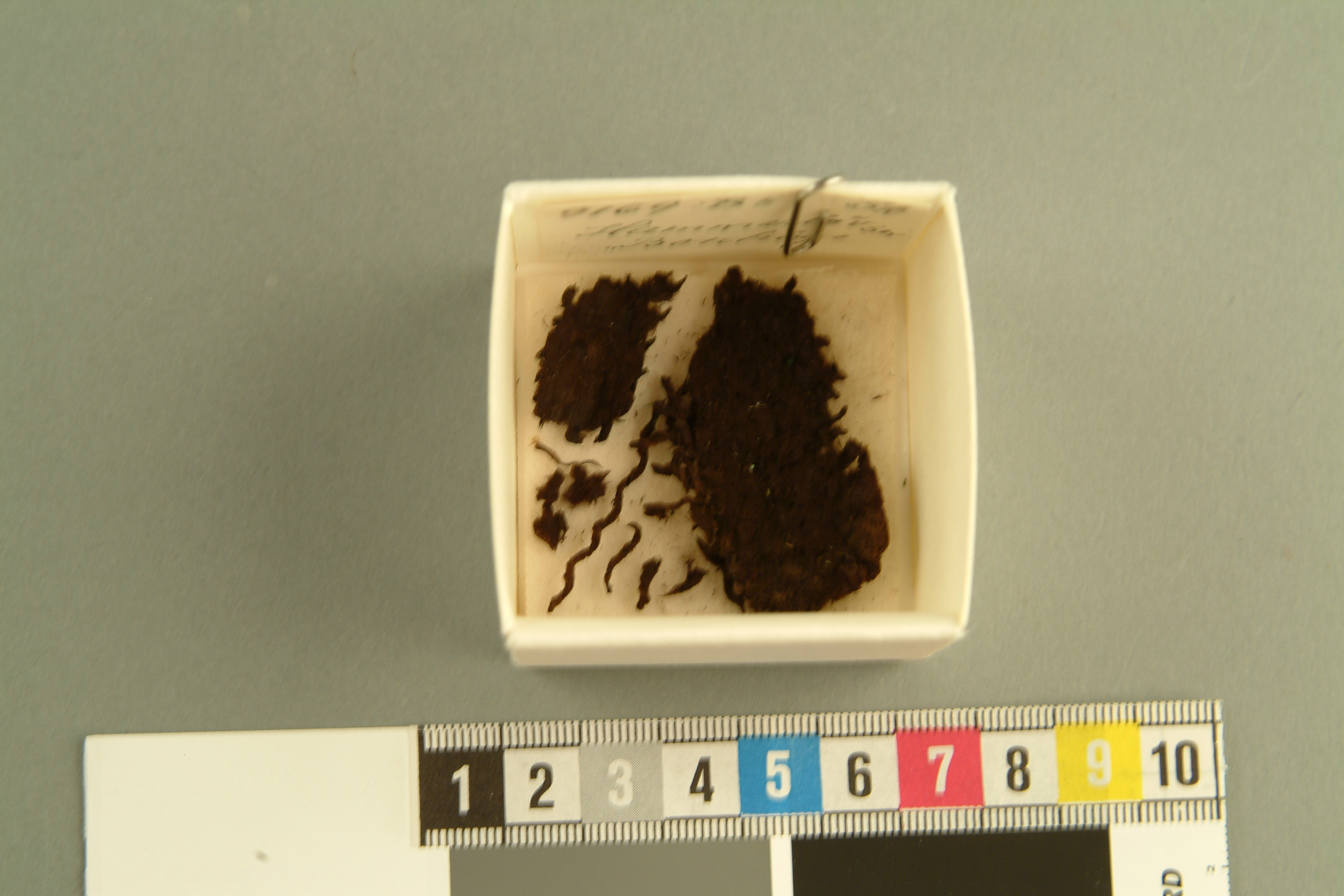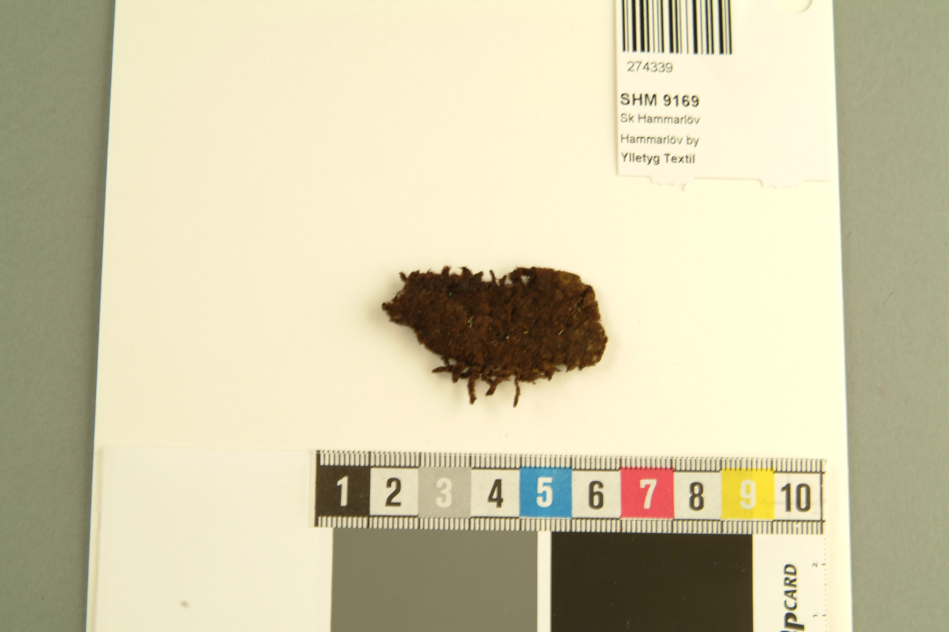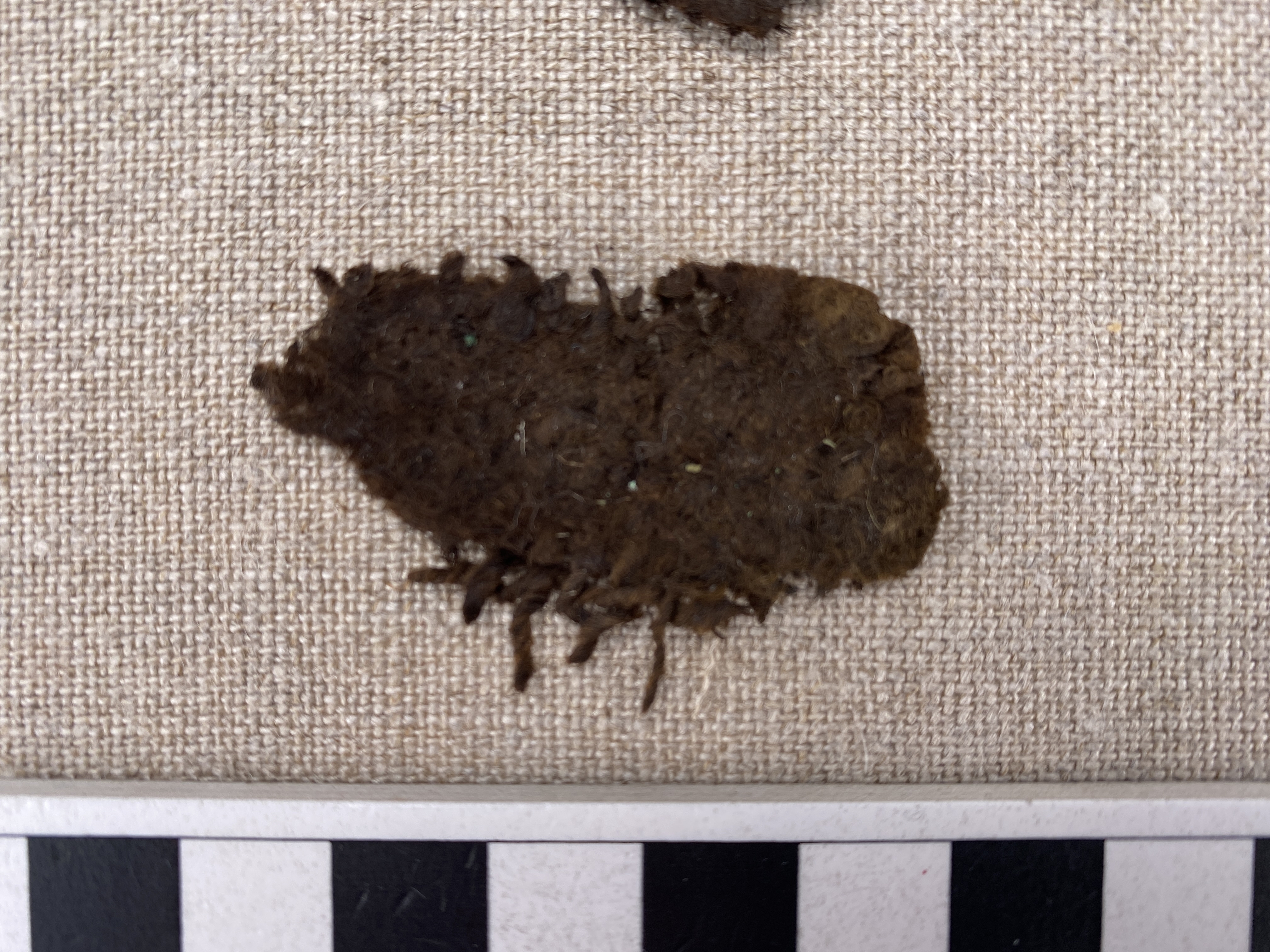 Fragment av ylletyg, tuskaft. Amica Sundström 2007: Fiber ull / ull. Spinnriktning S / Z. Trådantal 5 / 4. Garndiameter - / -. Bindning tuskaft. Fragment av ylletyg vävt i tuskaft.