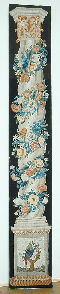 Ljusgrå kolonn virad med blommor i flera färger mot brunsvart fond. 916:1 På sockeln på vilken kolonnen vilar bild av pelikan vilken föder sina tre ungar med sitt eget blod. Färger i grått och vitt. 916:2 På sockeln på vilken kolonnerna vilar bild av papegoja sittande i ett träd. Klara starka färger. Broderierna monterade på träramar. På den ena ramen vid ena kanten skrivet med bläck otydliga siffror. Frankrike? 1600-tal.