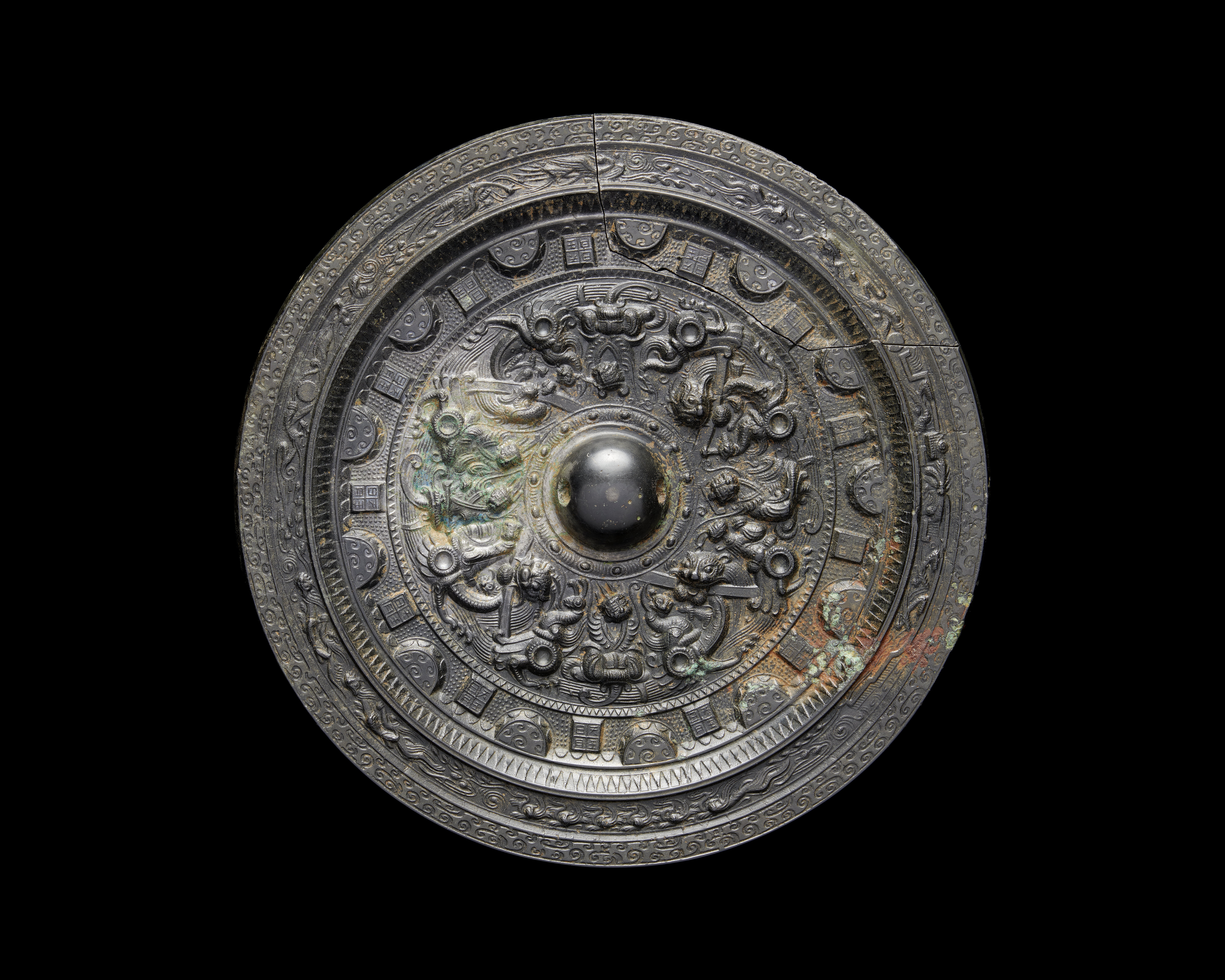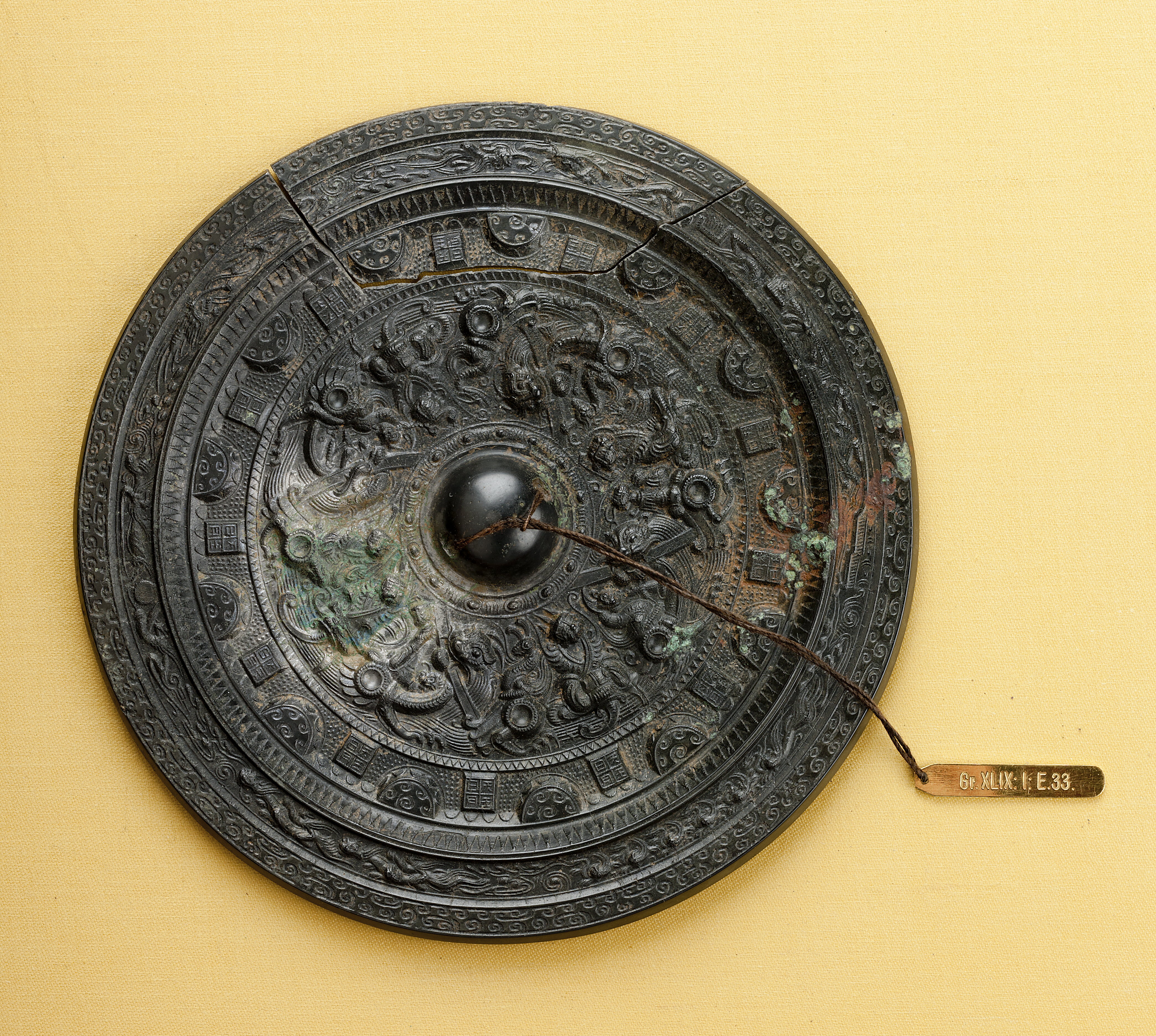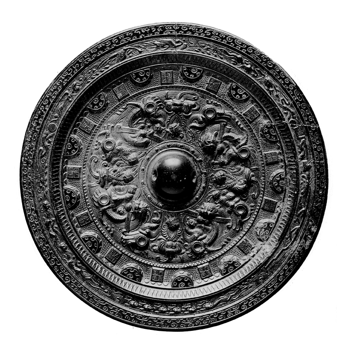 TILLÄGG: Spegel (jing) med mytologiskt motiv daterad till Östra Han dynastin. Denna välgjutna spegel har invid knoppen försetts med bilder av gudar och andra himmelska varelser som interagerar med olika typer av varelser som bixie - en varelse vars namn har innebörden "avvärja ondska". Bården som följer på detta centrala motiv gestaltar halvrunda tak och tegelliknande former mellan inskriptioner med tecken som kan översättas till: "Himmel, Kung, Sol, Måne". Nästföljande smala bård har ett triangelliknande mönster som skulle kunna tolkas/läsas som ljusstrålar. Efterföljande bård gestaltar bevingade odödliga som interagerar med mytologiska fåglar, drakar och andra varelser. Den yttersta bården utgörs av ett helt abstrakt mönster som ramar in spegelns mytologiska och himmelska kontext. Under Han dynastin (206 f.v.t. - 220 e.v.t.) uppstod en odödlighetskult i landets elit. Bilder av odödliga och gudar blev vanliga teman för bronsspeglarna. Tack vare skriftliga källor kan vissa gudomar identifieras.