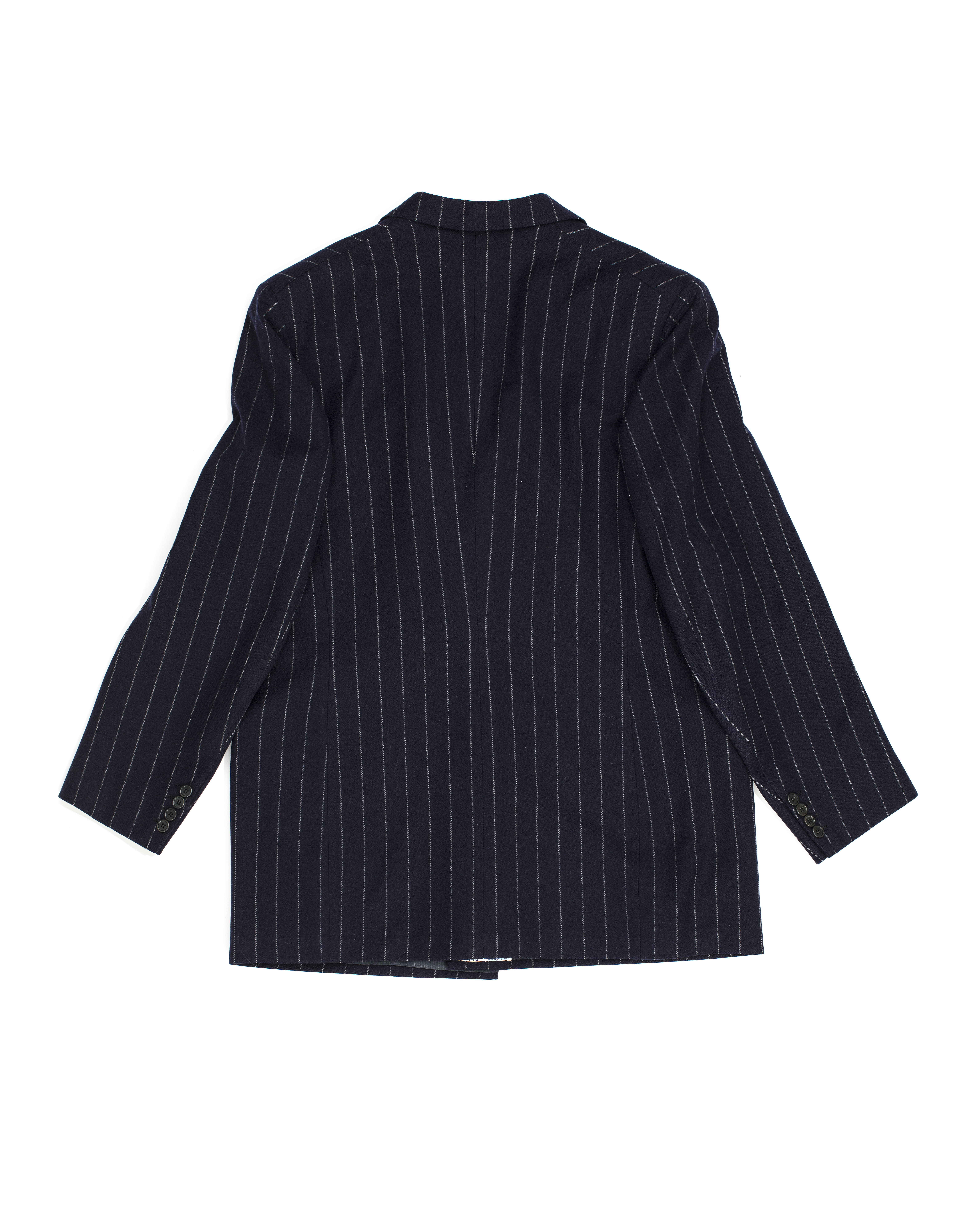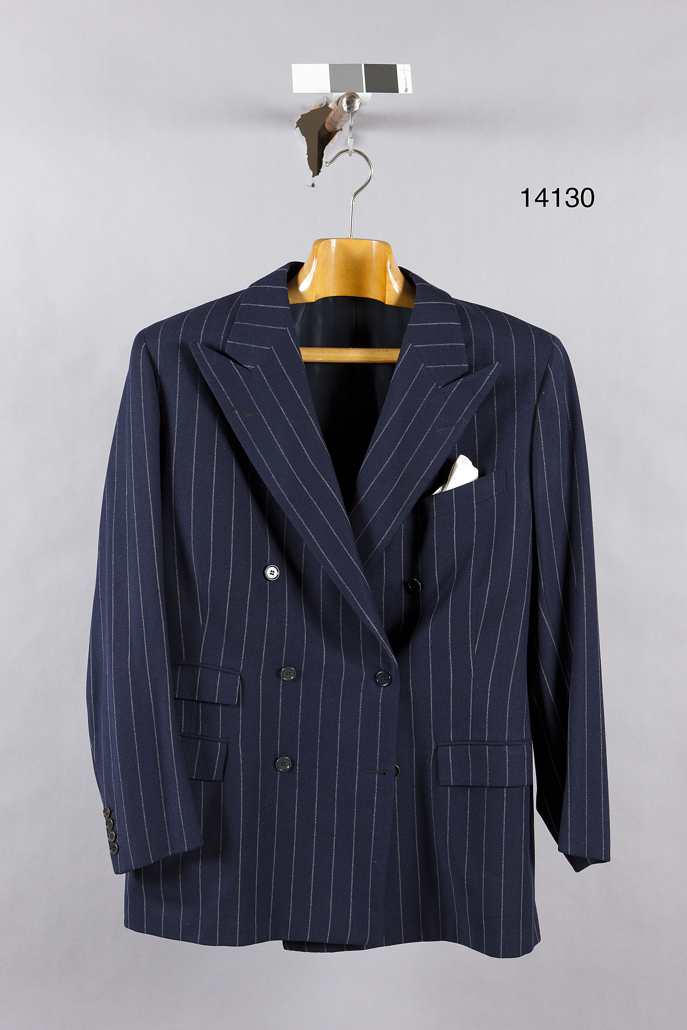 Kavaj av mörkblått ylle med smala vita ränder, dubbelknäppt med breda slag båda med genombrutet knapphål. Tre knappar i vardera raden mörkblå, av plast. Två fickor nedtill med lock, ovanför den högra en mindre med lock. En bröstficka. Nedtill på ärmarna fyra små knappar lika föreg. samt fyra knapphål. Foder av blått siden, i ärmarna vitt med täta smala grå ränder. Två innerfickor, den högra med firmaetikett: "AB NORDISKA KOMPANIET // STOCKHOLM // S-t No 2770 d 28-2 1945 // H.K.H. Kronprinsen".