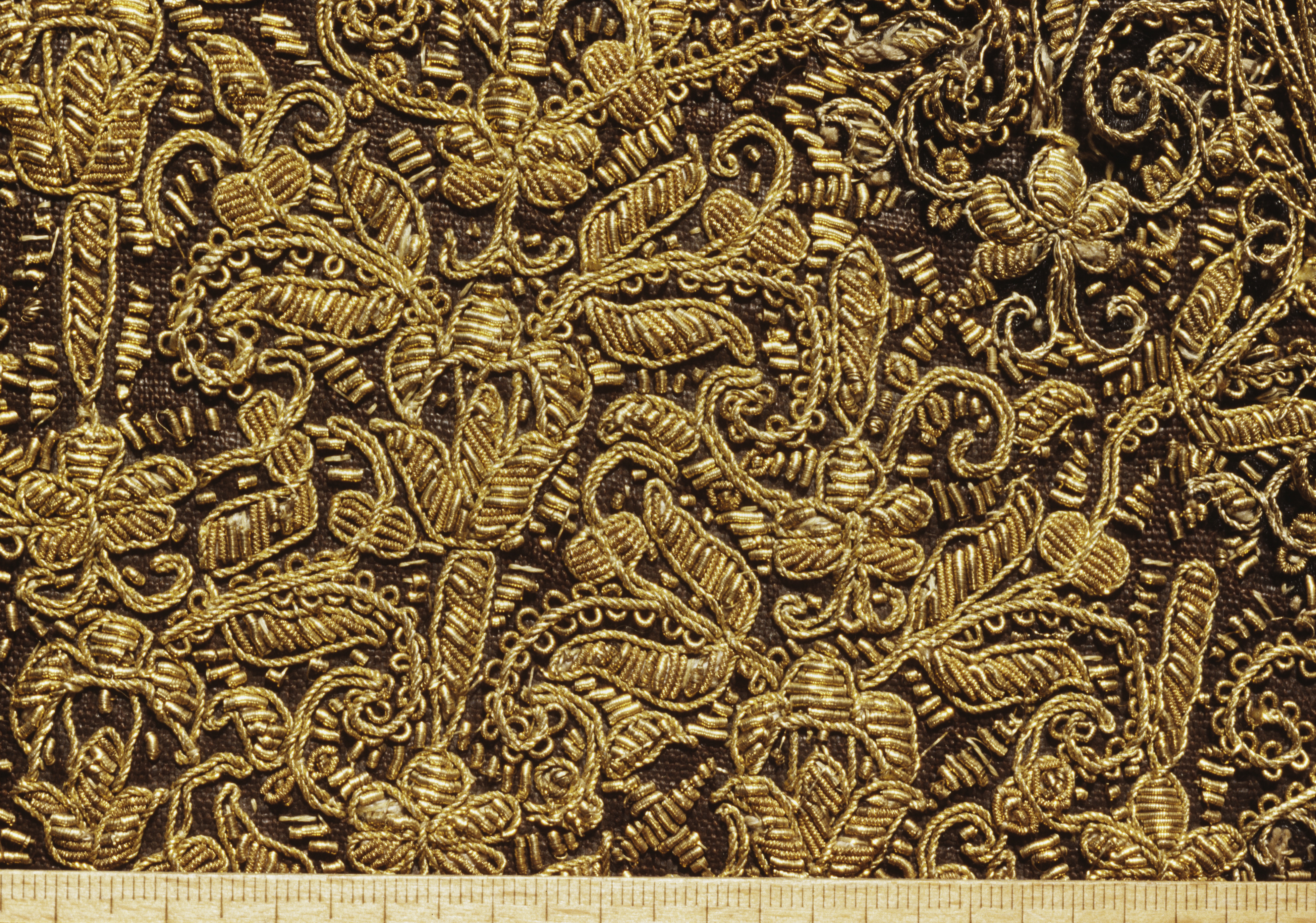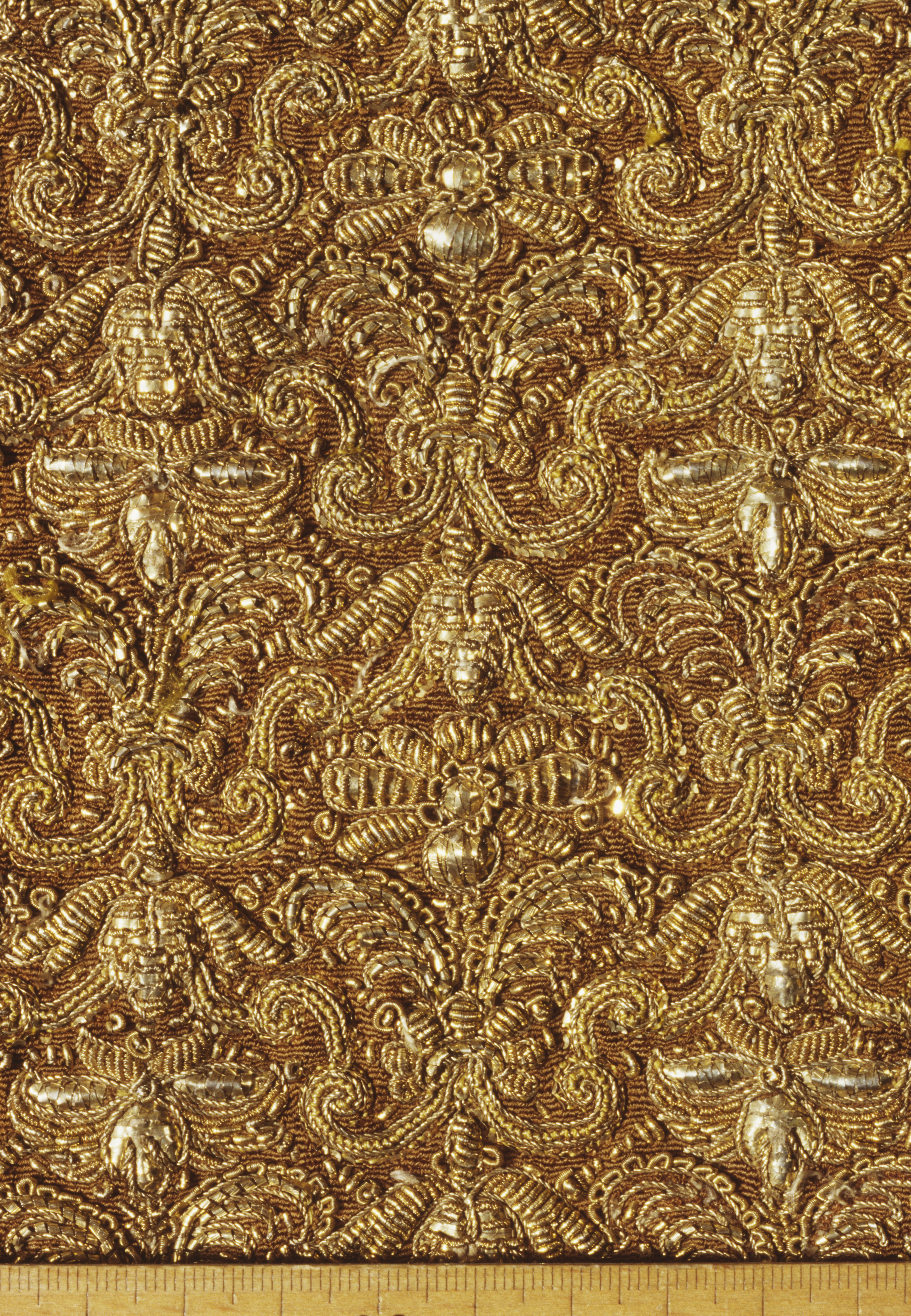 Helt guldstickad gåva av änkedrottningen Hedvig Eleonora. Deponerad 1873.