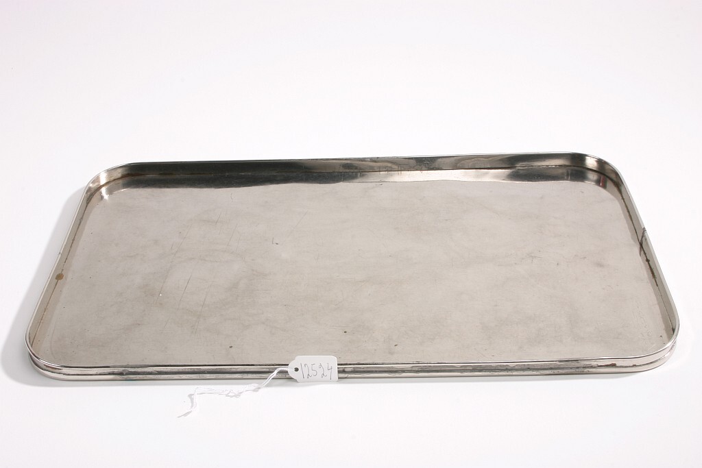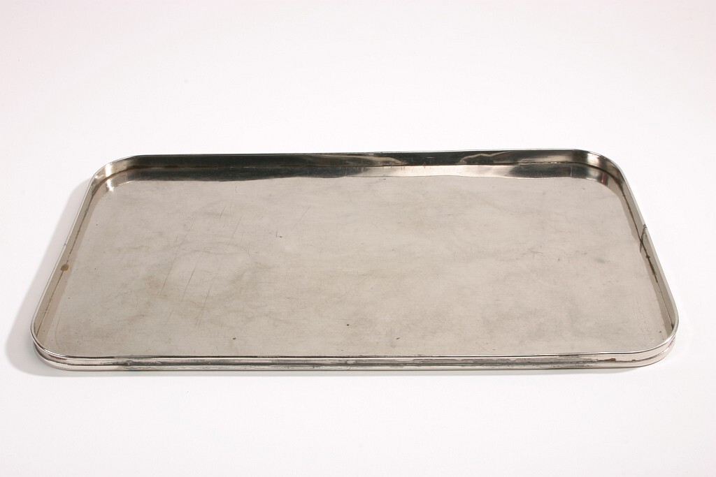 Rektangulär bricka av förnicklad koppar. Rundade hörn samt en vinkelrätt, uppstående 12 mm hög kant.