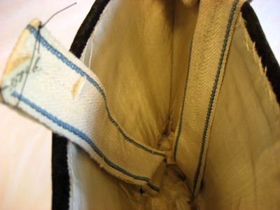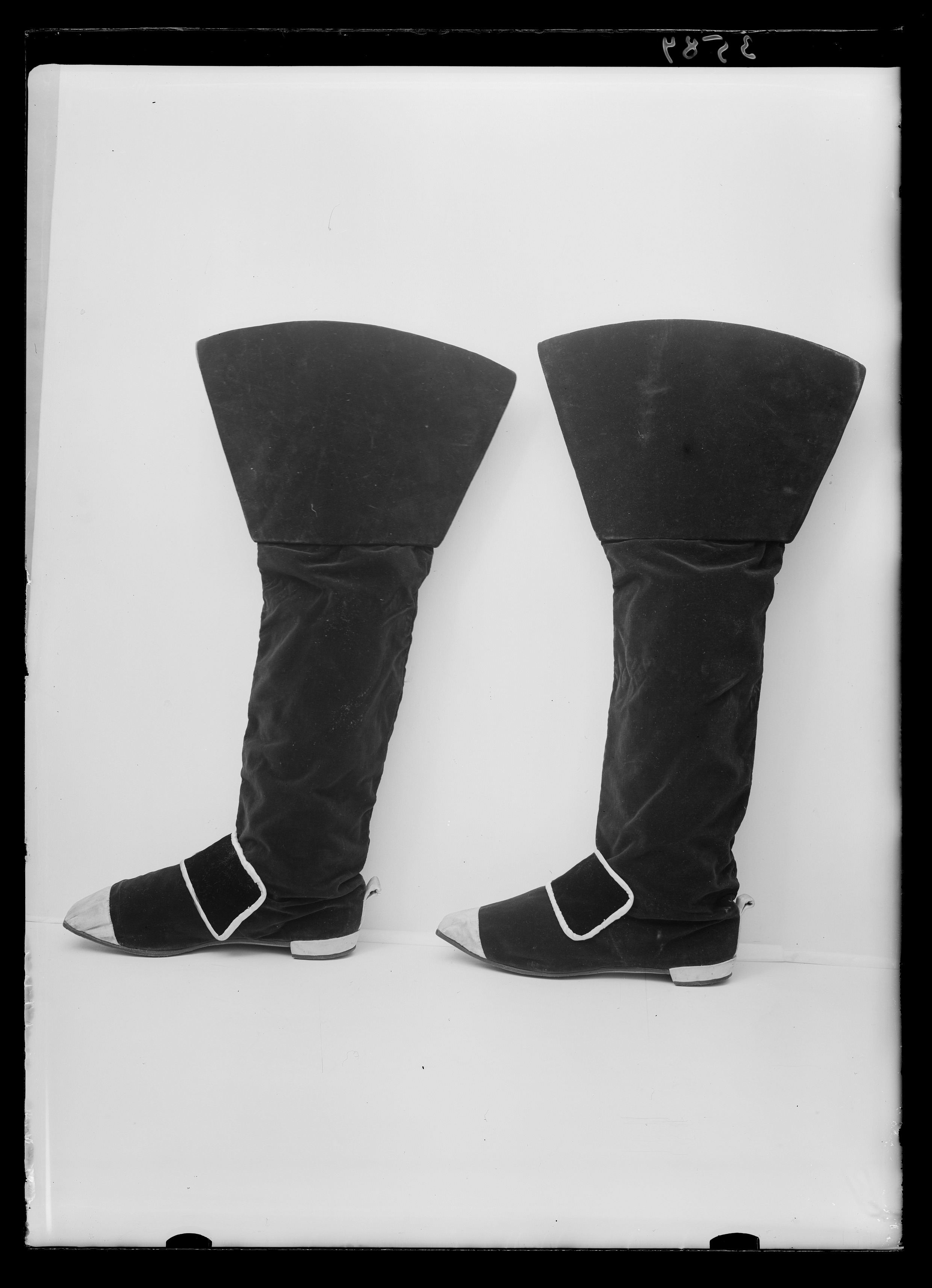 Stövel tillverkad i mjuk svart silkessammet bestående av fot och långt skaft som avslutas med en krage, som är förstärkt inuti således att den står ut något från benet. Kragen är stärkt med kraftigt läder och fodret med vitt siden. Själva skaftet är fodrat med kraftigt tyg av linne. Kragens omkrets är 670 mm. Vid klacken finns en liten stropp av siden som bildar en ögla. Själva klacken är beklädd med vit siden. Sulan av läder, 15 mm tjock och har fem hålsstämplar, en under tån, två vid svanken samt två vid hälen. Sulan har en dold söm. Till stöveln tillhör ett sporrläder sydd av svart sammet och fodrat med vitt atlas. Den är 63 mm lång och 72 mm bred. Tåformen är tvär och välvd och sulan har en mer fotliknande form.