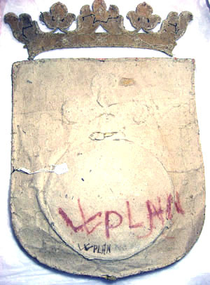 Vapenskölden har ett bottentyg av gulröd sidenatlas, kantad av en tjock snodd av smala silverlan och beigefärgad silkestråd virad runtom en silkeskärna. Ytterst kantas vapnet av en beigefärgad silkestråd trädd genom små öglor av silvertråd. Mitt på skölden är riksäpplet applicerat. Det är broderat i hög relief av silvertråd som ursprungligen varit förgylld. Tråden är nedsydd med stygn av vit silkestråd. På äpplet är broderat en vågrät och en lodrät bård av silvertråd, 48 respektive 42 mm bred. Bården kantas av en snodd av smala silverlan och silvertråd virade runt silkeskärna samt av en smal snodd av silvertråd och ett smalt band av silverlan och beige silkestråd. På bården är broderat sammanlagt sex ovaler och romber av förgylld tråd och förgyllda lan. Samtliga kantas av silvertråd runtom en silkeskärna samt av kantiljer av silvertråd som ursprungligen varit förgylld. Runtom är broderat små kärnor av kantiljer av silvertråd, ursprungligen förgylld. Äpplet kröns av ett kors av silvertråd nedsydd med stygn av vit silkestråd, 140 x 170 mm. Korset kantas av ett smalt snöre av silvertråd. Korsarmarna framställs som liljeformade blad med halvmåneformade avslut av silverlan samt kantiljer av silertråd. Vid änden vid tre av de fyra korsärmarna är broderat en blomma av små kantiljer av silvertråd. Mellan korsarmarna sticker fram en blomma med blad och stjälk . I korsets mitt är broderat ytterligare en blomma av kantiljer av silvertråd. Skölden kröns av en grevlig krona av silvertråd som visar enstaka spår från förgyllning. Kronan har en 30 mm bred kronring av silvertråd nedsydd med stygn av vit silkestråd i ett schackrutigt mönster kallat gaufrure. På kronringen är påsytt fem små ovaler och rektanglar av silverlan runtom vilka är virat blå och röd silkestråd. De kantas av förgyllda kantiljer och små kärnor av kantiljer av silvertråd. Kronringen kantas nederst av ett smalt vävt band av beigefärgad silkestråd och silvertråd utdragen i små öglor. Upptill kantas kronringen av en snodd av silvertråd och gul och vit silkestråd virad runtom en silkeskärna. Från kronringen utgår fem spetsar av stiliserade blad och liljeliknande former broderade med silvertråd, ursprungligen förgylld, medsydd med vita silkesstygn. Dessa kantas av smala snören av silvertråd. Mitt på vardera blad är broderat en stående rektangel av silverlan runtom vilka är virat grön och röd silkestråd, kantade av smala snoddar och av små prickar av kantiljer av silvertråd. Några små droppar av svart silkestråd är broderade på vardera blad. Vapnet är fodrat med beigefärgad linnelärft och skölden är även klädd med gulnat papper. I nedre kanten av skölden en påskrift med röd färg: "WPLAN" och därunder med svart bläck: "WPLAN" samt med blyerts "No 6...".