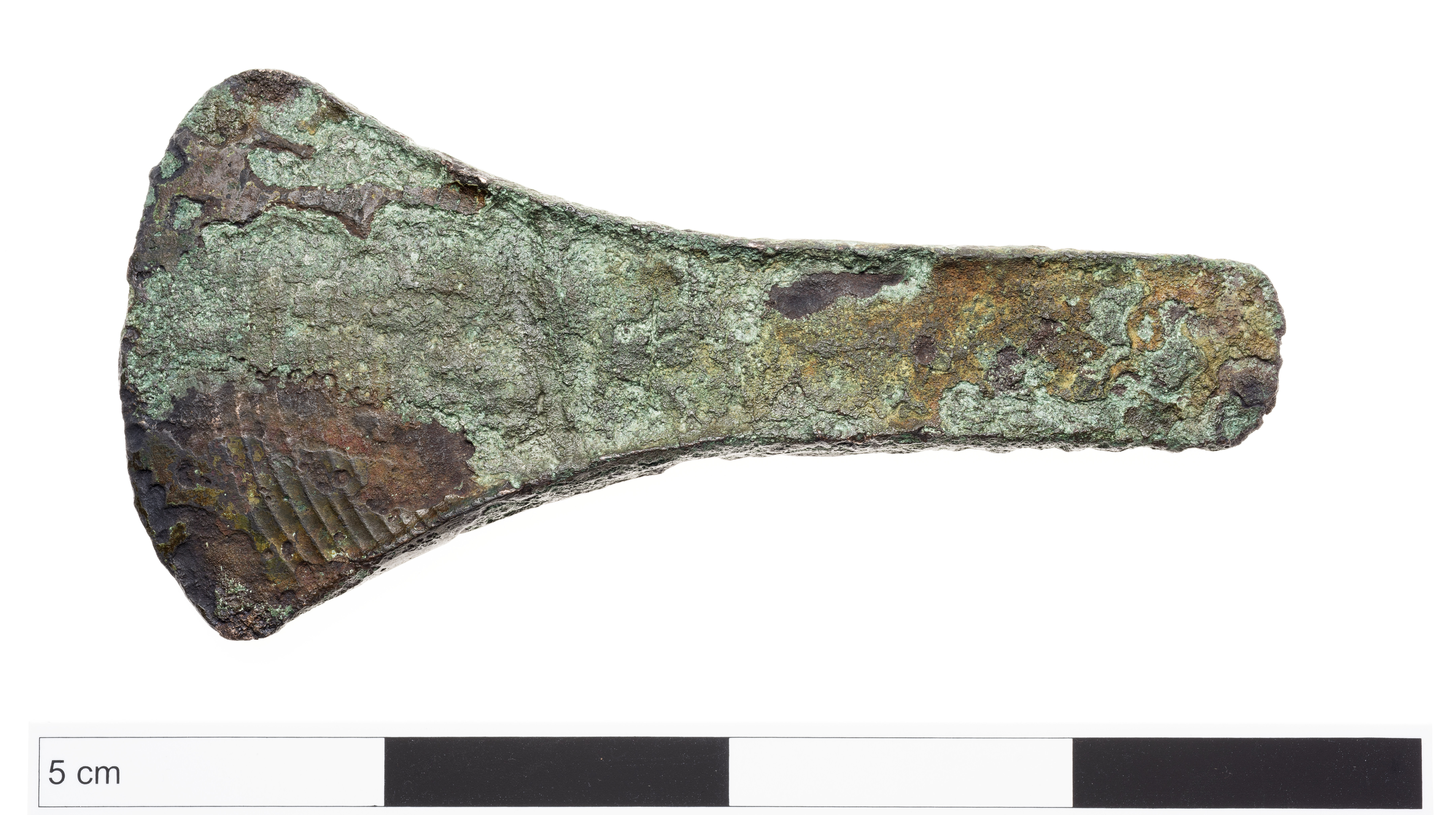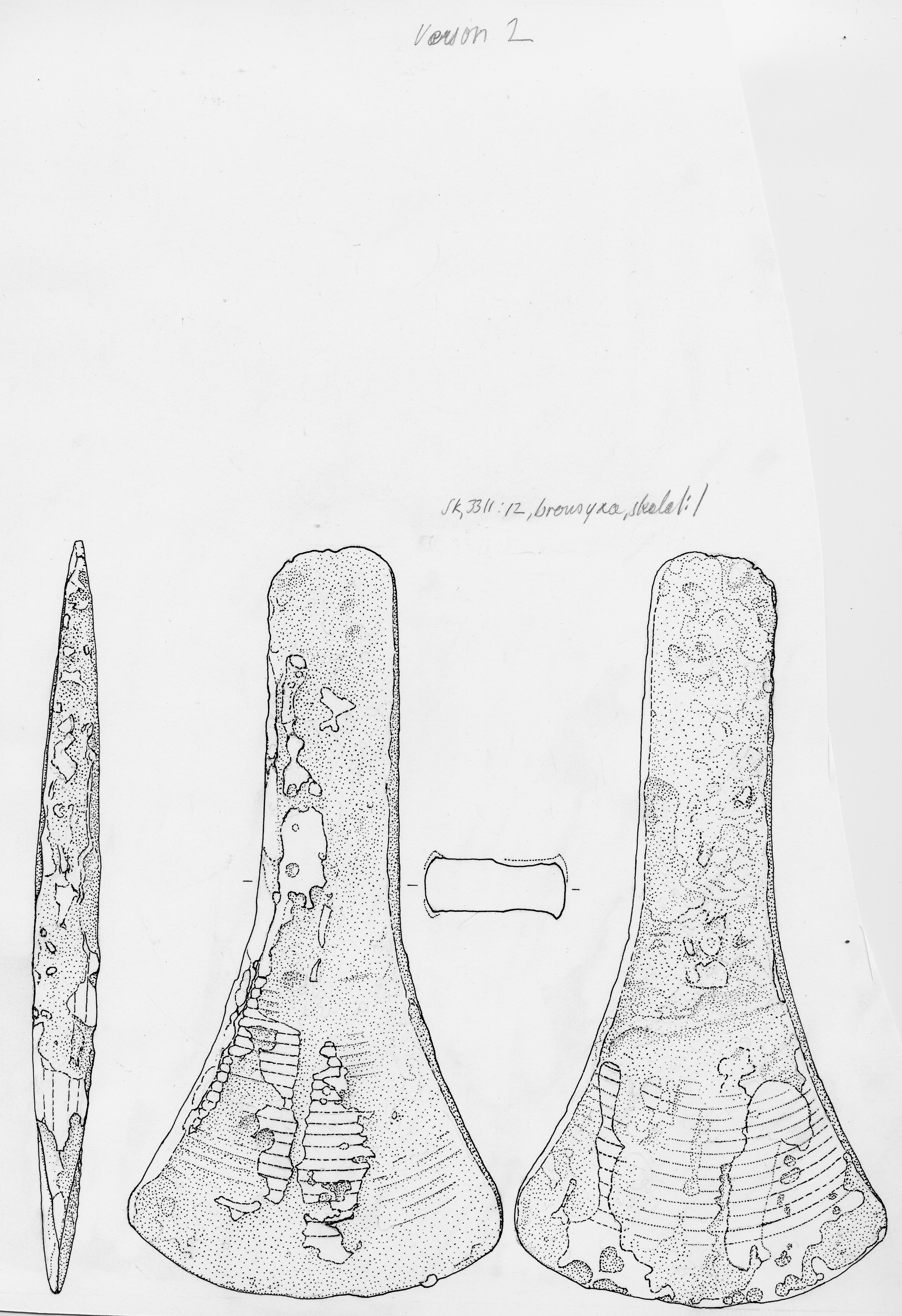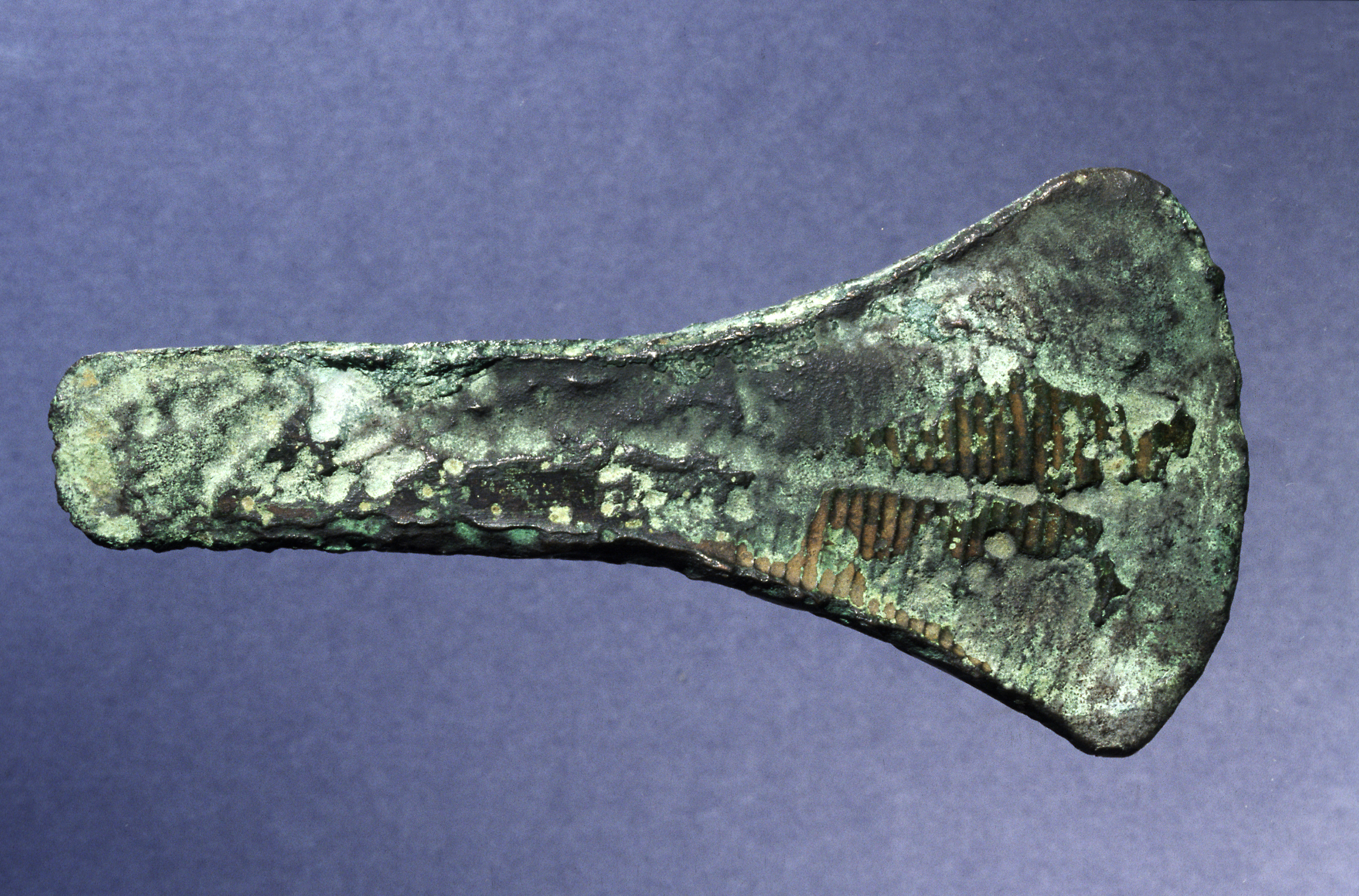 Kantyxa av brons med relativt svagt utvecklade kanter. Eggpartiet är på båda sidorna försett med inpunsade parallella linjer.
