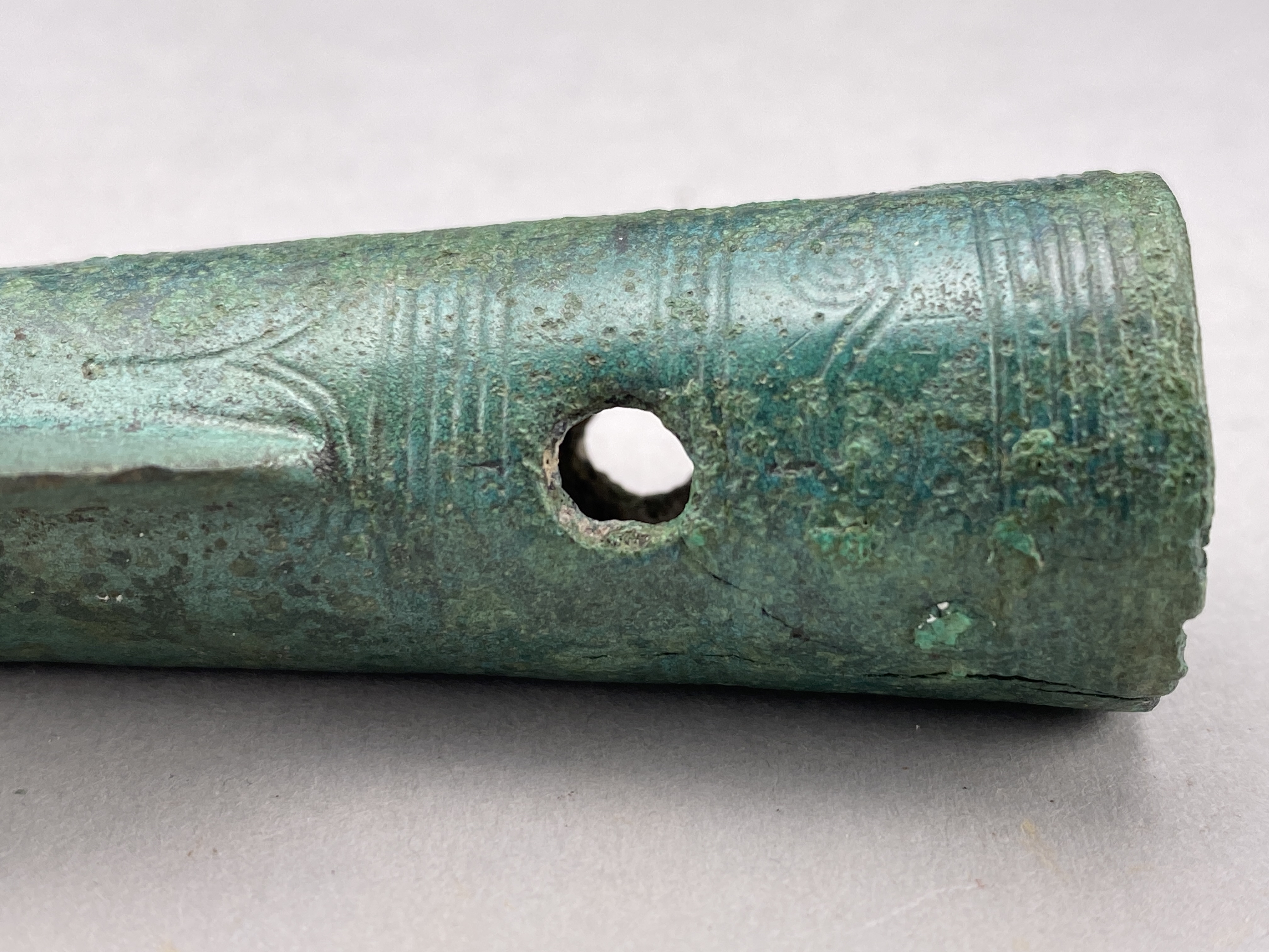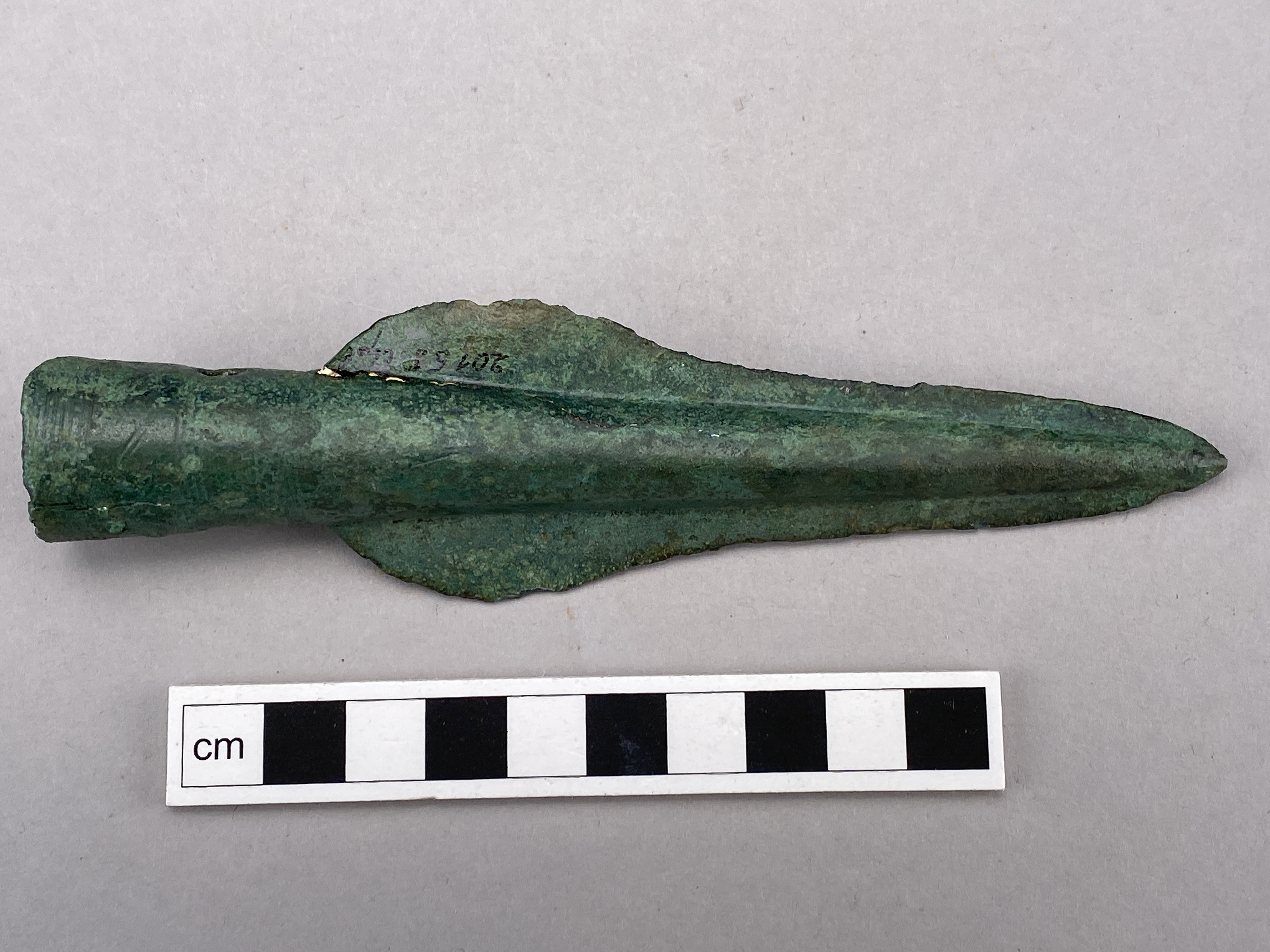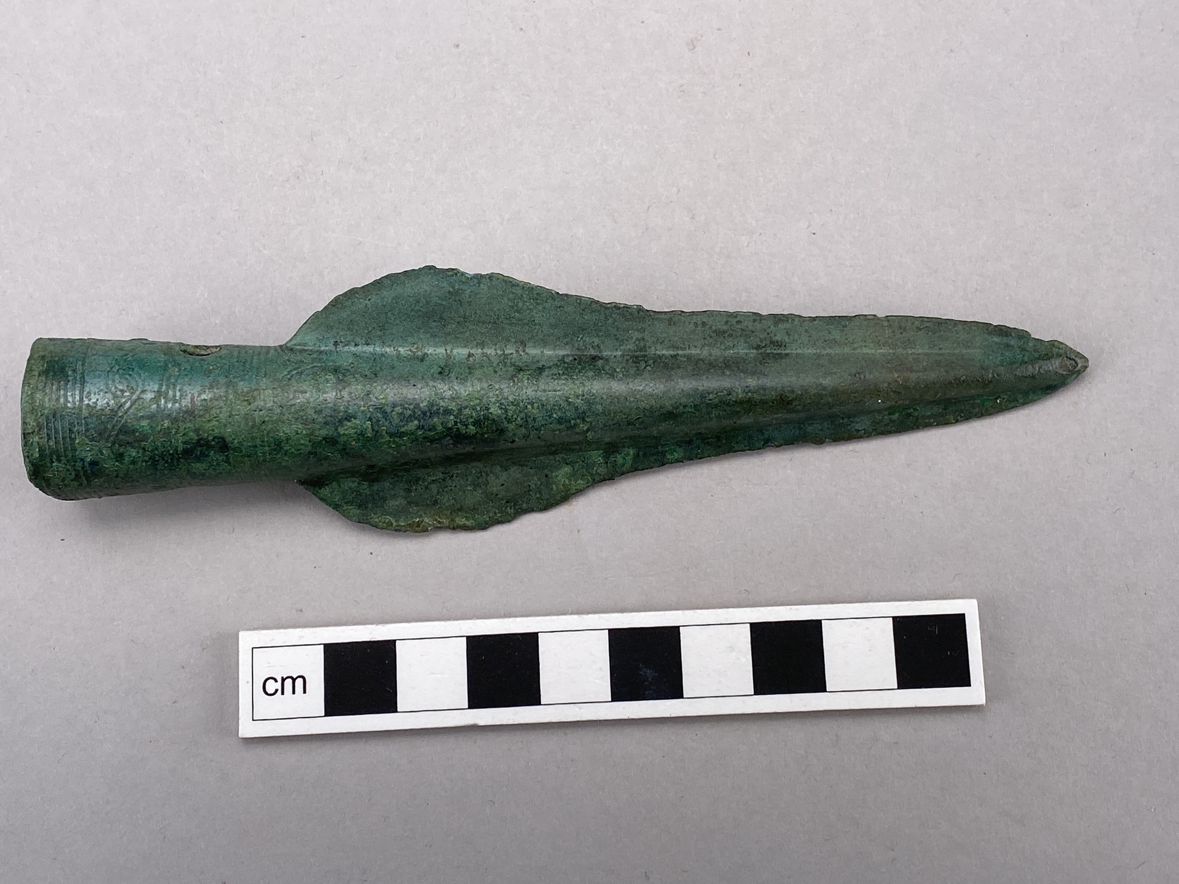 Spjutspets av brons, holken är ornerad med inpunsade spiraler och linjer. Två nithål.