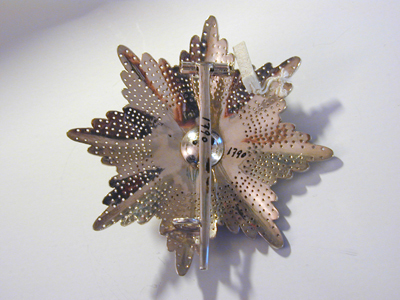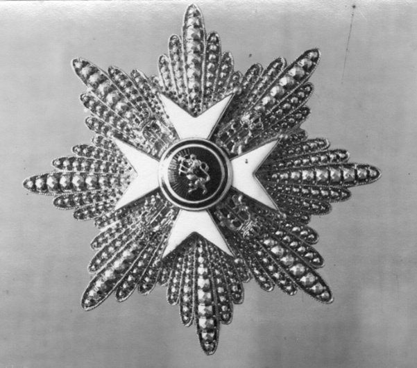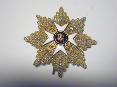 Åttauddig, flinkerad strålstjärna av silver, belagd med ordenskorset, ett vitemaljerat maltesrkors av guld, kulor på spetsarna, mellan korsarmarna krönta anglosachsiska O:n av guld. Välvd medaljong, täckt med röd genomsynlig emalj, därpå fäst krönt guldlejon med guldyxa i framtassen, vi-blå-vit kantbård. På baksidan säkerhetsnål och rund mutter för fästning av korset.