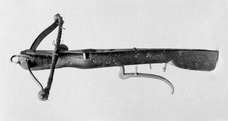 Båge av stål, fäst vid stocken med snörning av hampa. Sträng av mångdubbelt snöre. Lås med nöt av stål och snälltryck. Hävstångsavtryckare av stål. Stock av brunt trä. Rundad med antydan till vinge och anslag. Pilränna av ben och stockens ovansida i övrigt inlagd med benplatta. Benskoning framför låset. Framtill i snörningen ären oval stålbygel fäst.