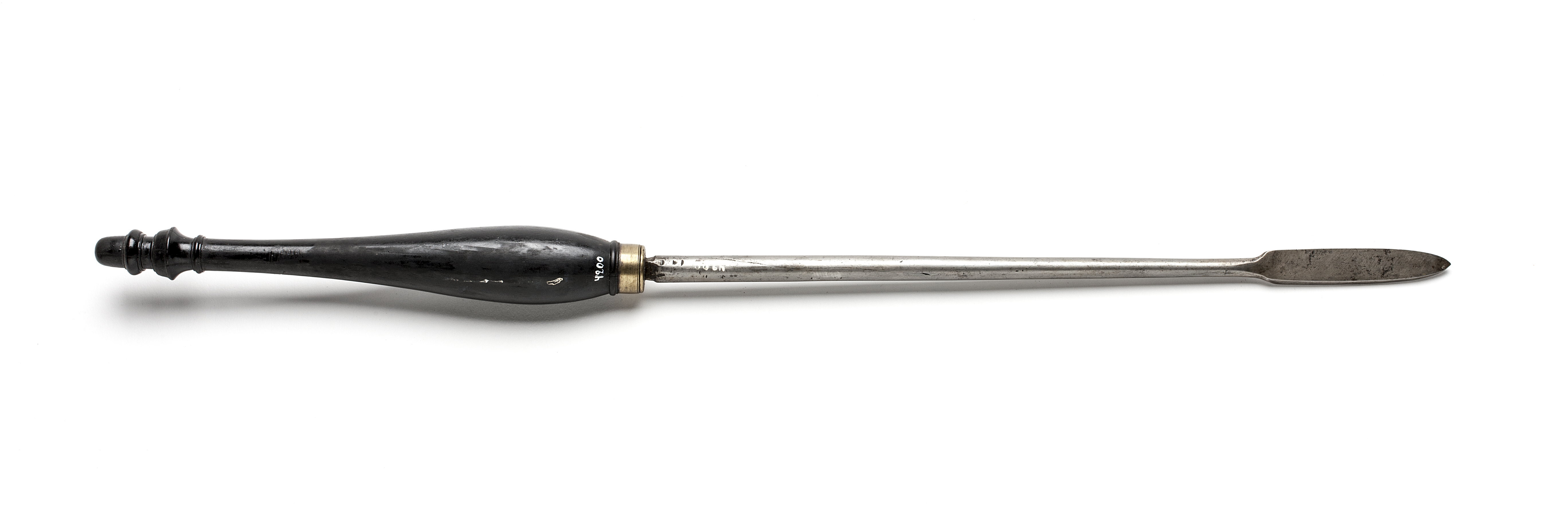 Rund klinga med parallellepipedisk genomskärning. Två lätt rundade sidoeggar, vilka möts i en spets. Svarvat skaft av ebenholts med profilerad ände, mässingsring. Stämplat på klingan: sjuuddig stjärn.a