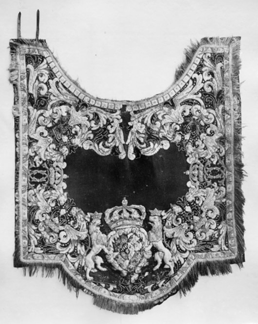Handhästtäcke, ur en svit om 30 st med svenska riksvapnet och Karl XI:snamnchiffer.