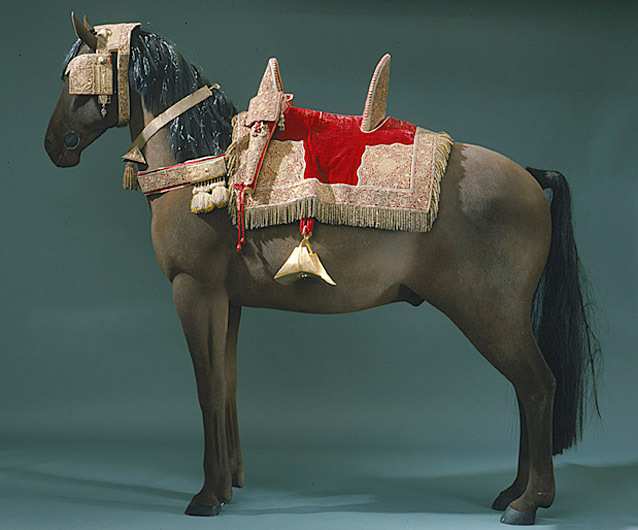 Huvudlag av röda saffianremmar, b 24 mm, på utsidan klädd med vävt band av rött silke och guldtråd samt en tunn, ljusblå kant. (enl.7941) Beskrivning enl. 9115. Huvudlag av rött läder med yttäckande broderi med guldtråd och paljetter i form av rankor. Sidostycken b: 48 mm med upptill halvovala, genombrutna beslag av förgylld mässing med löst hängande, bladformiga beslag. Nedtill 120 mm långa, genombrutna, graverade beslag, dekor i form av urna omgiven av rankor och blad. Rosetter i form av halvsfäriska, genombrutna, runda beslag. Käkrem med rektangulär sölja, upptill i ett stycke med nackremmen, främre kanten konturerad och med två likadana beslag som rosetterna. Tillbehör: Tygel, vävt band av guldtråd och rött silke med konturerade, svarvade beslag av elfenben, från vilka utgår röda silkesnoddar. Halsrem av rött läder, på utsidan med broderat rutmönster av guldtråd. Nedtill två triangulära skyltar med rankbroderi, fodrade med röd sammet samt pompong av guldtråd med tofs av guldbuljoner.