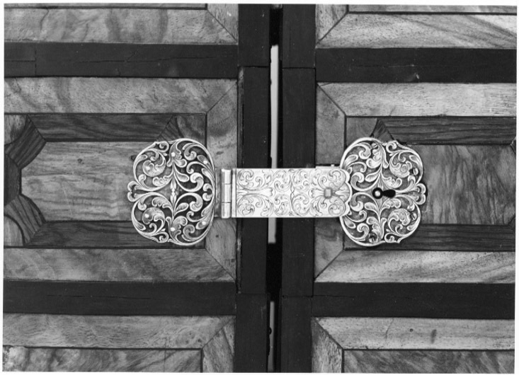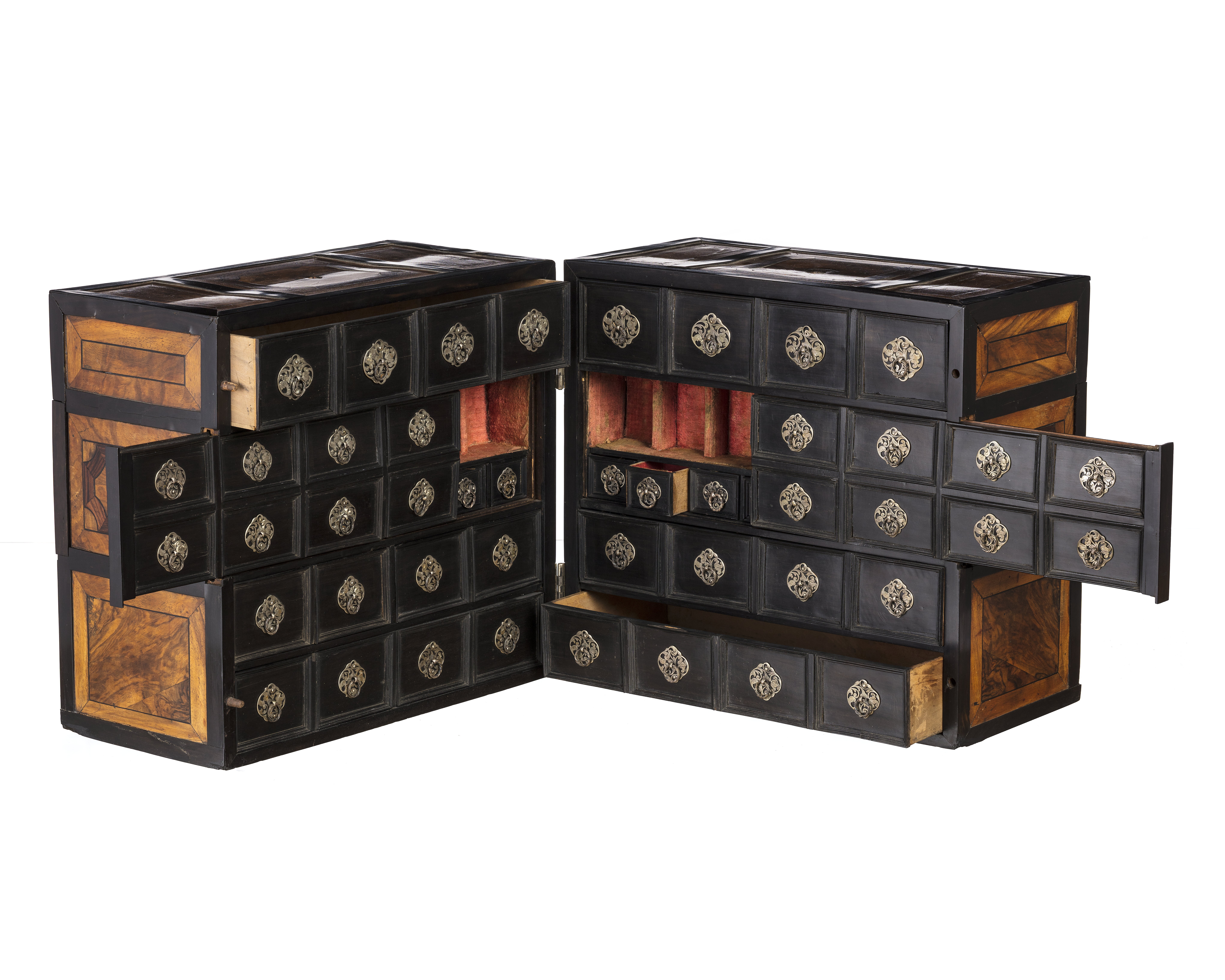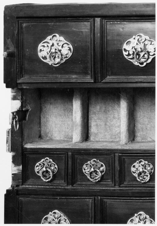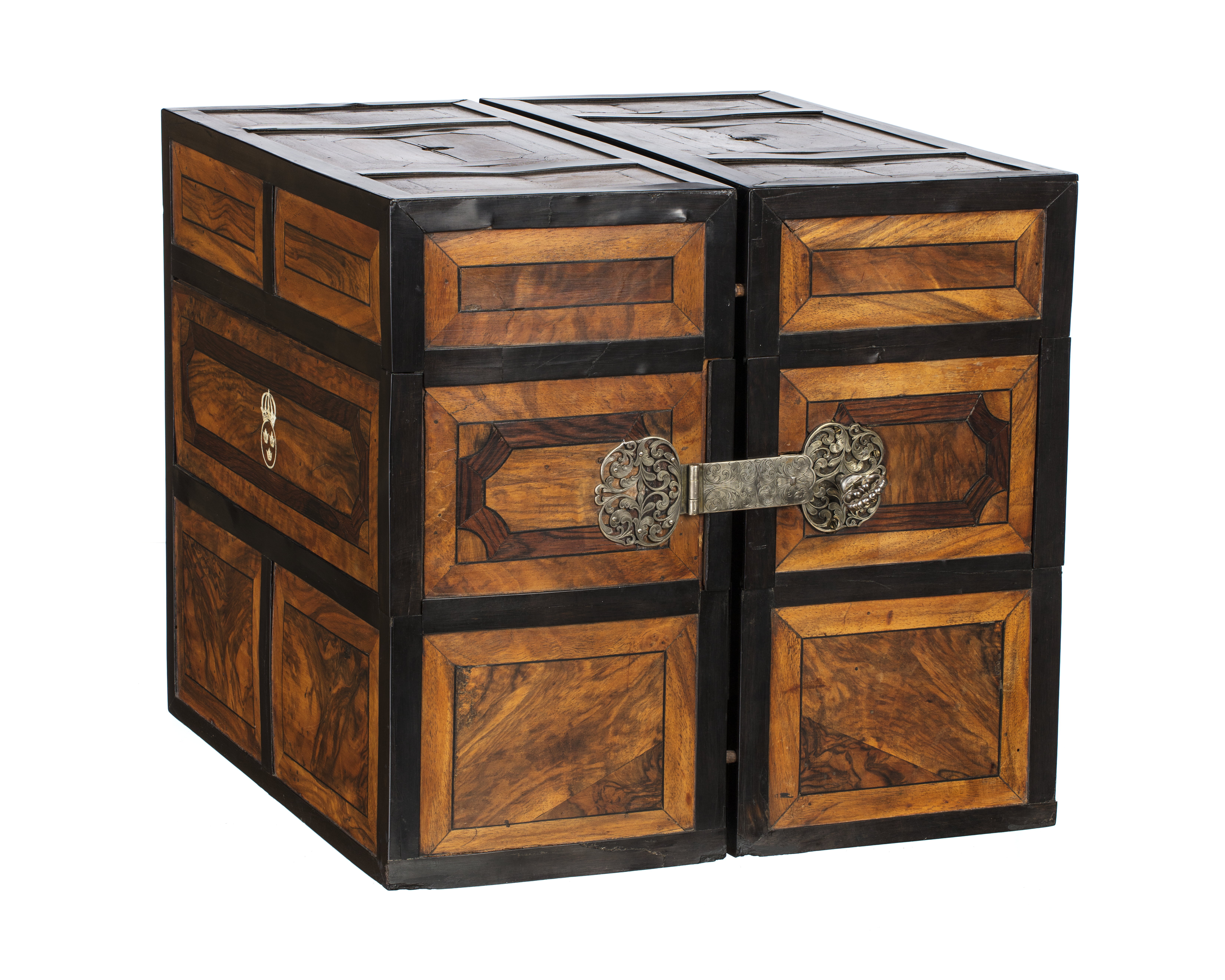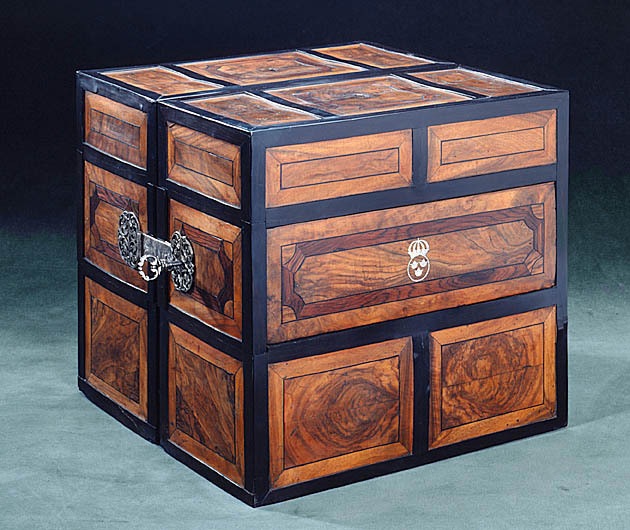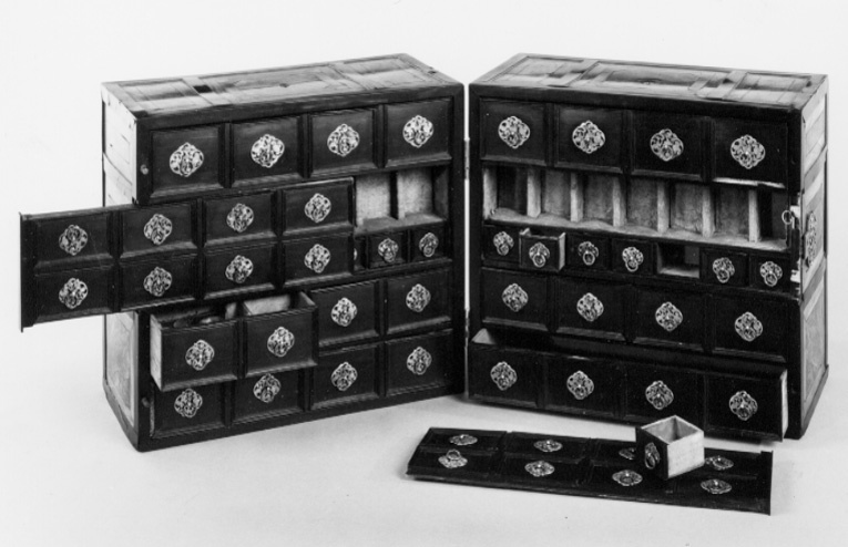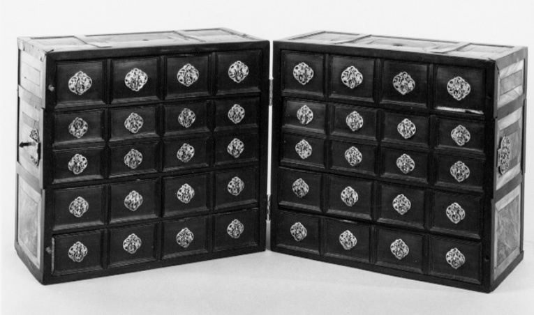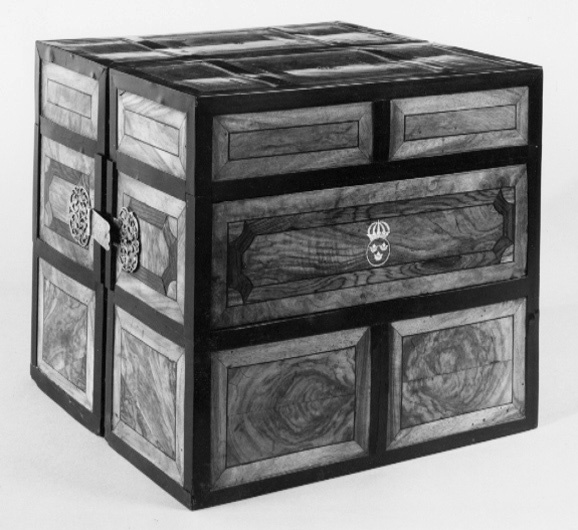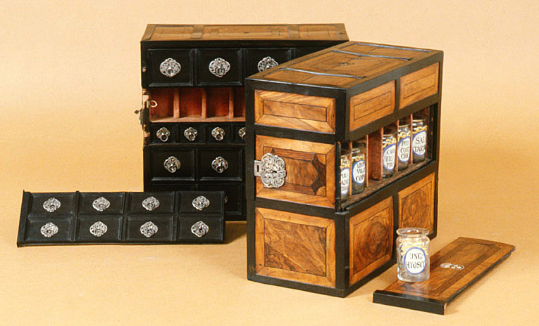 Tillhört Fredrik I, Sverige 1720-1751. Apoteket består av två lika stora delar, tillsammans bildande en kub. Utvändigt inläggningar av ebenholts, valnöt och jakaranda i rutmönster, där omramningarna är av ebenholts. Ramarna delar varje sida i tre fält. På bredsidorna ett bredare mittfält och två mindre fält över och under, mittpå mittfältet det svenska riksvapnet inlagt med ben, en rund ring och däri tre kronor, ringen krönt av en kunglig krona.Två gängjärn av silver på ena kortsidan och på motsatta sidan ett knäpplås av stål. Gångjärns- och låsbeslag av silver i form av genombrutna rankverk. Mitt på vardera skåphalvans ovansida ett runt hål efter ett bärhandtag. Insidorna helt fanerade med ebenholts och visar vardera 20 lådfronter med profilerade kantlister och genombrutna lådbeslag av silver och dragring av spiralvriden silvertråd. Lådorna står 4 i bredd och 5 i höjd, översta raden är större och har större beslag. Vardera mittpartiets två lådrader är blindrader, vars frontskiva kan avlägsnas och visar på vardera sidan sju fack och sju små lådor med beslag. Facken är klädda med röd sammet, lådorna med rött siden. Bakom h. sidas tre lådrader finns tre lådor och bakom v.sidans fyra lådor, varav två klädda med rött siden och en med fackindelning. På utsidan av varje halva sex lönnfack klädda med röd sammet. En skjutspärr av mässing dras ut, varigenom mellersta fälten kan dras bort från lönnfacken.