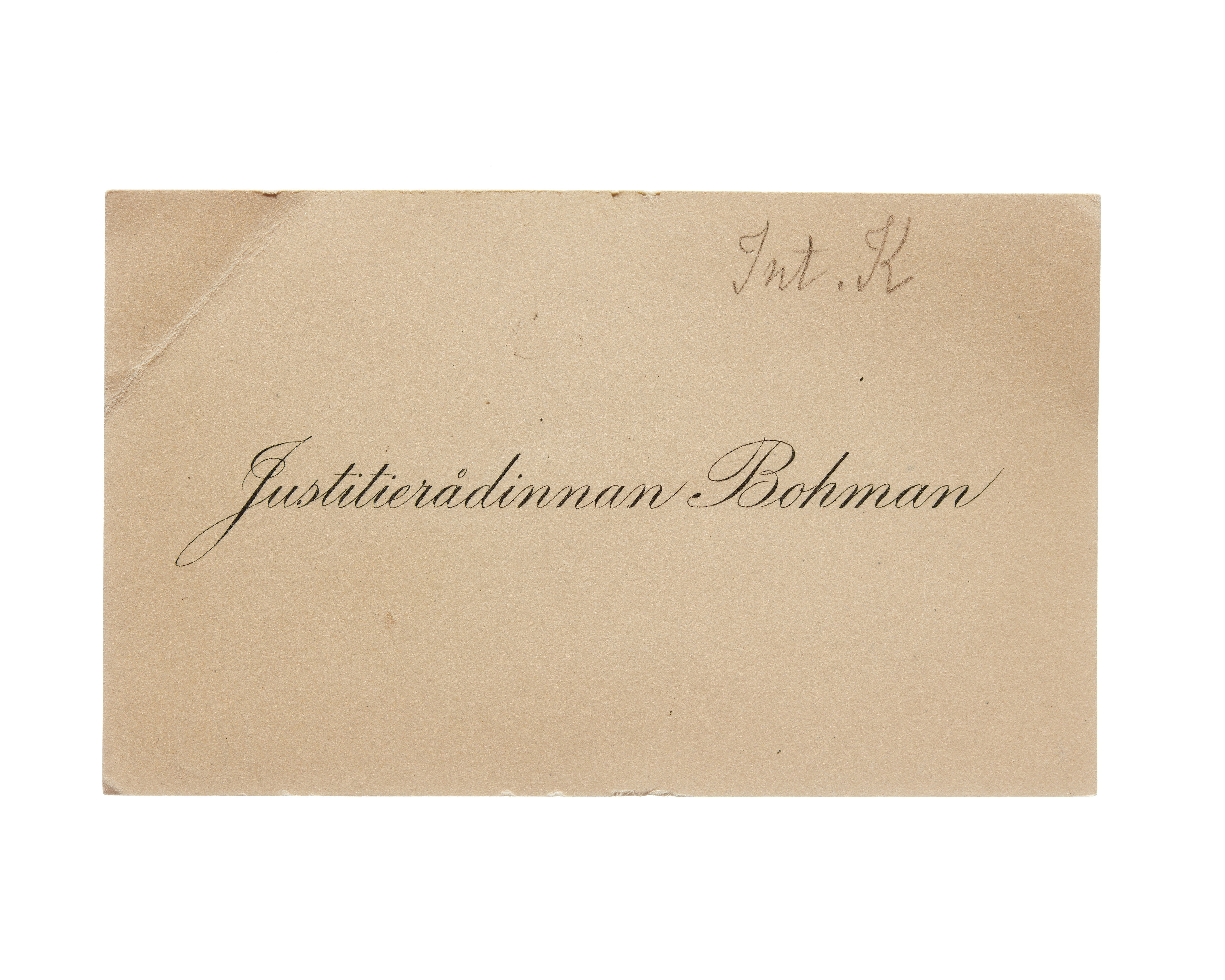 Ett visitkort från Justitierådinna Kerstin Bohman f. Ruffel. Daterat 1911, vikt i övre vänstra hörnet. Överlämnat i samband med Internationella kvinnoförbundets kongress i Stockholm 1911.