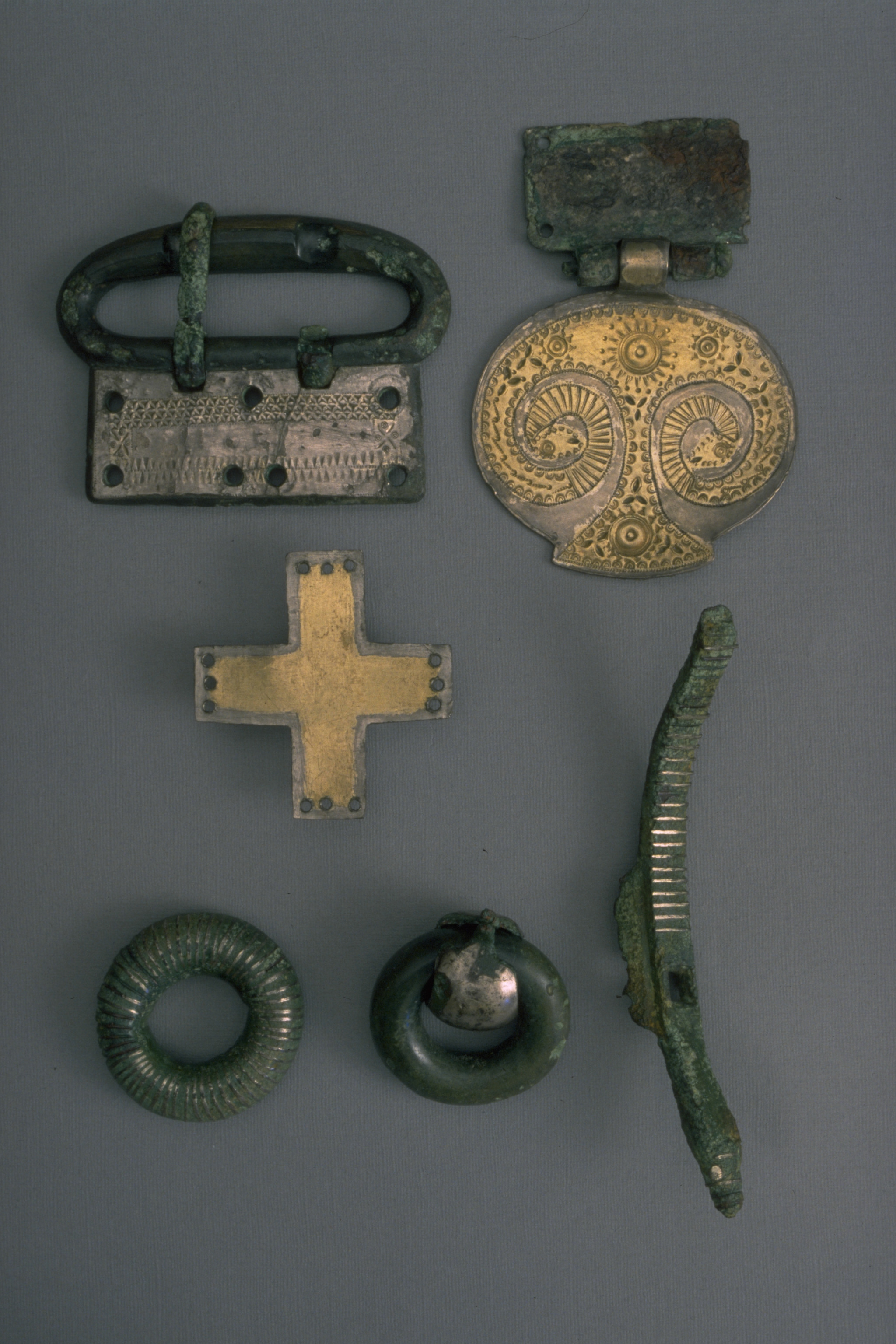Remsölja av brons som har haft två nålar, av vilka den ena är avbruten och saknas. Söljan är belagd med en tunn, fyrkantig silverplåt på vilken det finns spår av förgyllning och sirater.