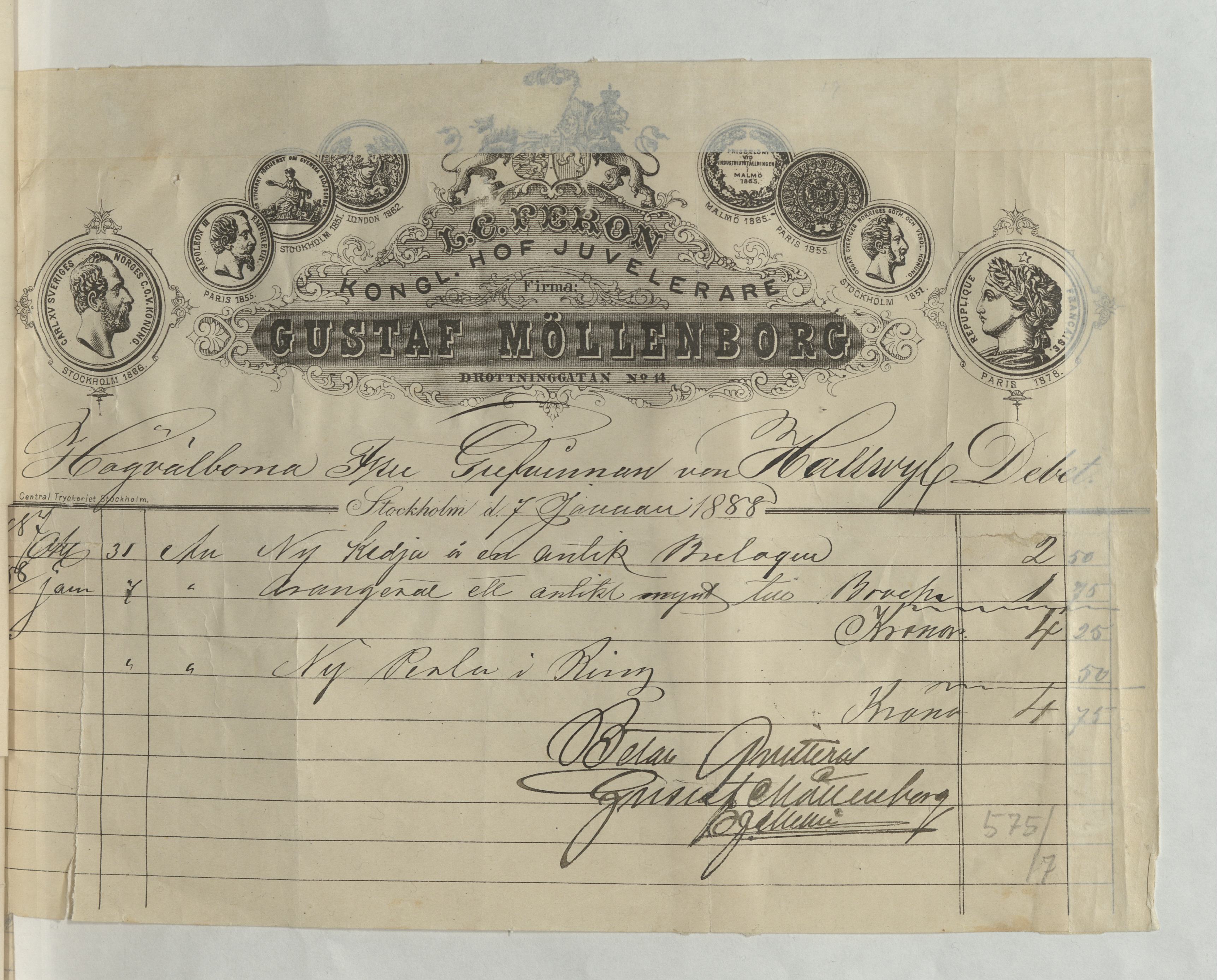 Kvitto från Gustaf Möllenborg, Juvelerare, 1888