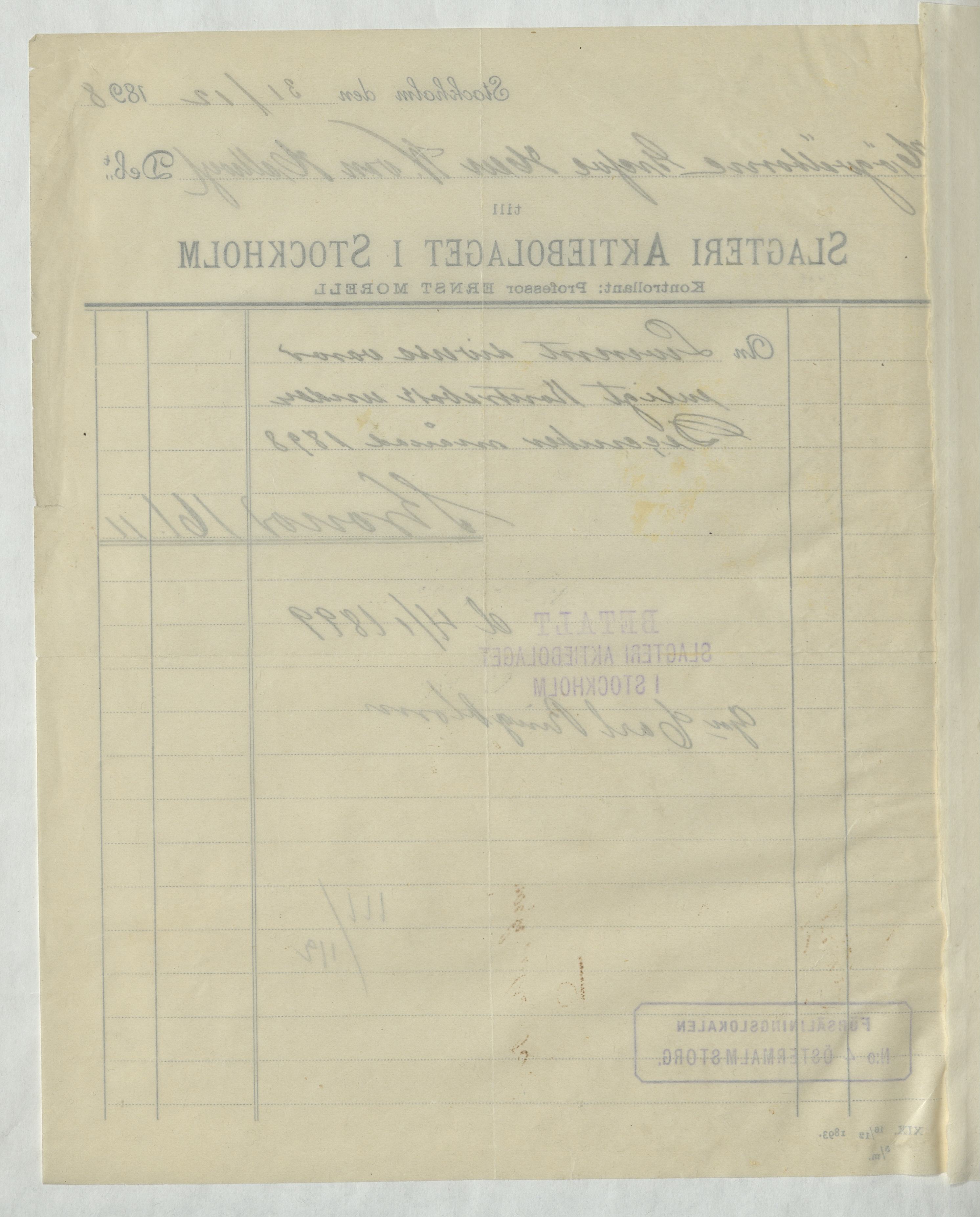 Kvitto från Slagteri Aktiebolaget i Stockholm