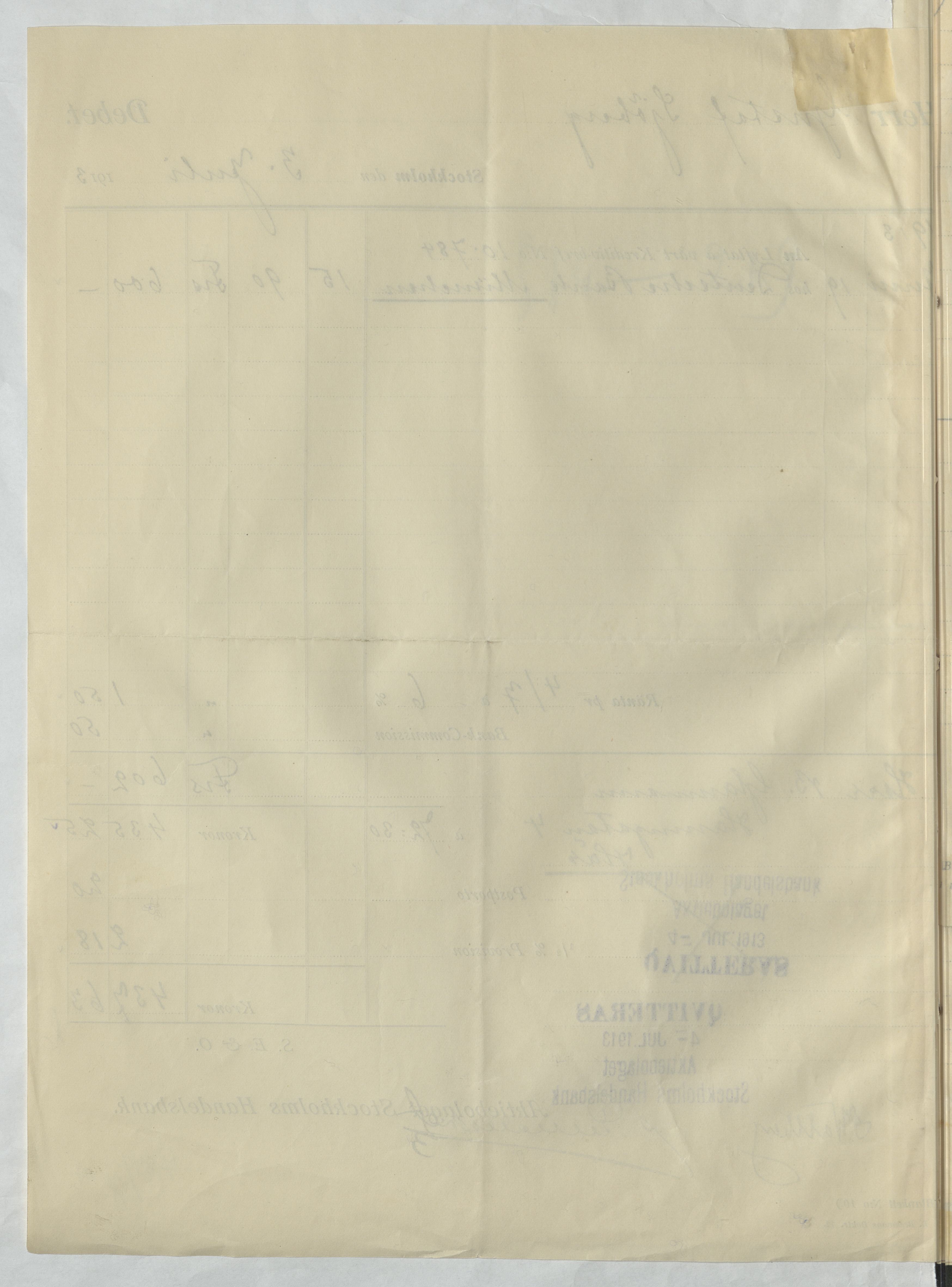 A. Anhalt und Wagener Nachf. Berlin B. Bayerischen Vereinsbank, München C. Boucicaut, Aristide, Paris D. Erikson, L. E. Spannmålshandlare E. Loewe, M. Innsbruck F. Mallet, Frères & C:ie, Paris G. Munktells Mekaniska Werkstads AB H. Passavant & Comp. Basel; Knörr, Frédéric & fils, Lucerne: Anhalt & Wagener, Berlin (på samma räkning) I. Schultess Erben, Zürich J. Sjöberg, Gustaf, Operasångare K. Stametz & C:o, I. H. Nachfolger, Wien L. Upp- och Afskrifnings-Besked och andra verifikationer