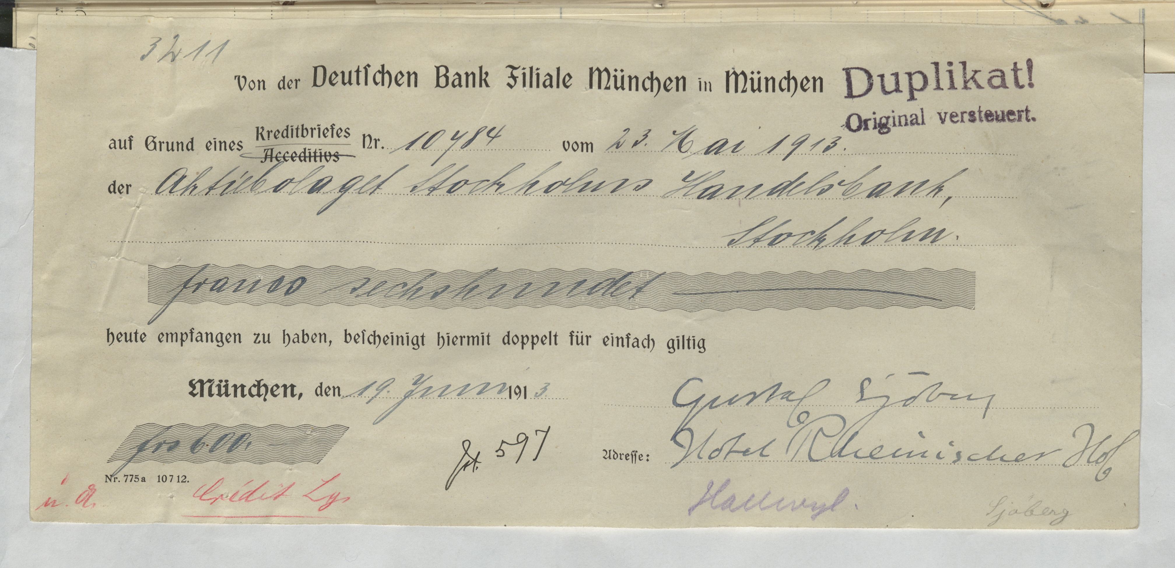 Kvitto från Aktiebolaget Stockholms Handelsbank rörande Sjöberg, Gustaf