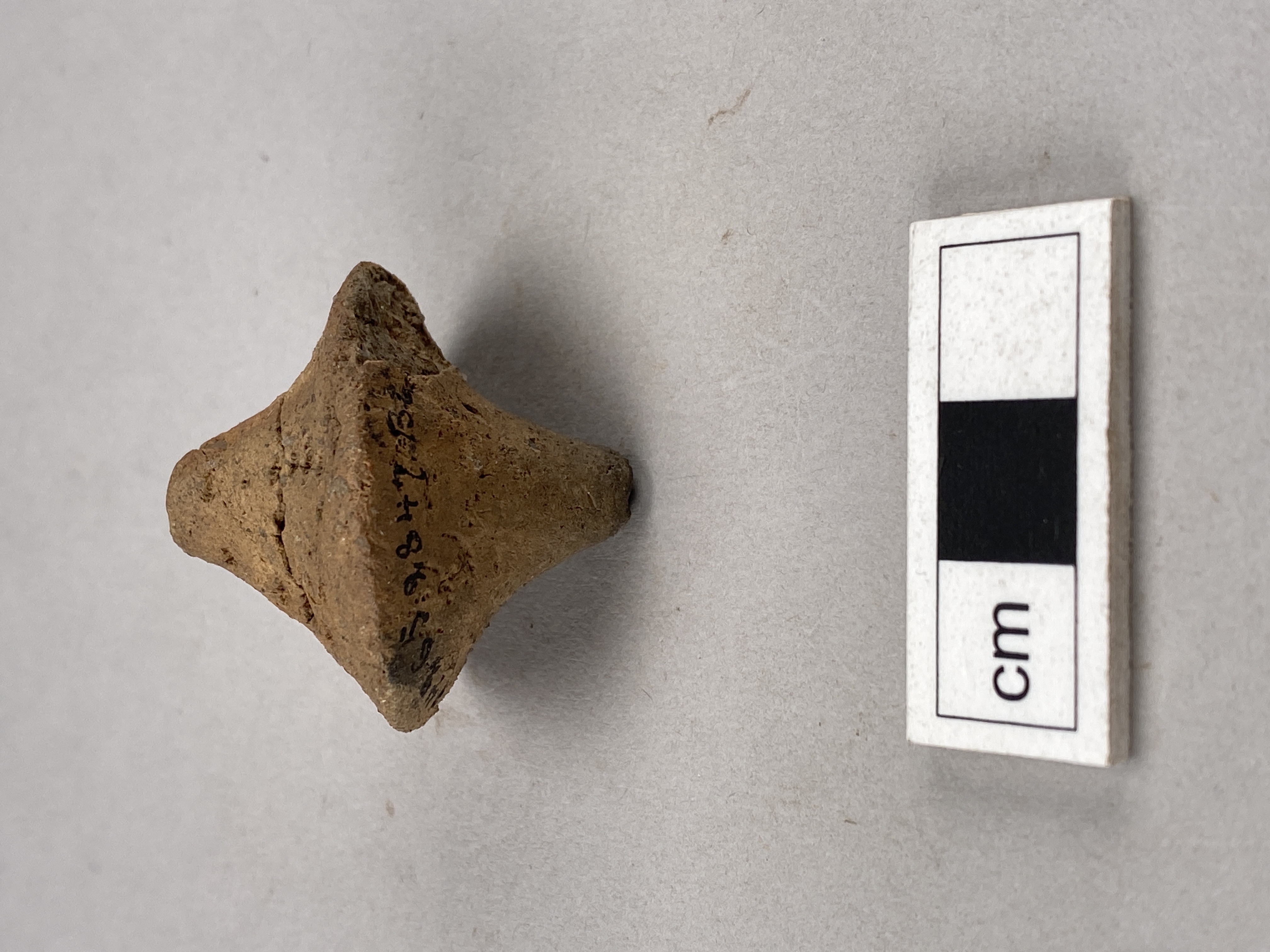 Bikonisk pärla. Dekorerad med rader av små stämpelintryck på båda sidor. Mindre skador och urfallna partier både vid ena ändan och centralt, flera sprickor. Fast bergartsmagrat gods.
