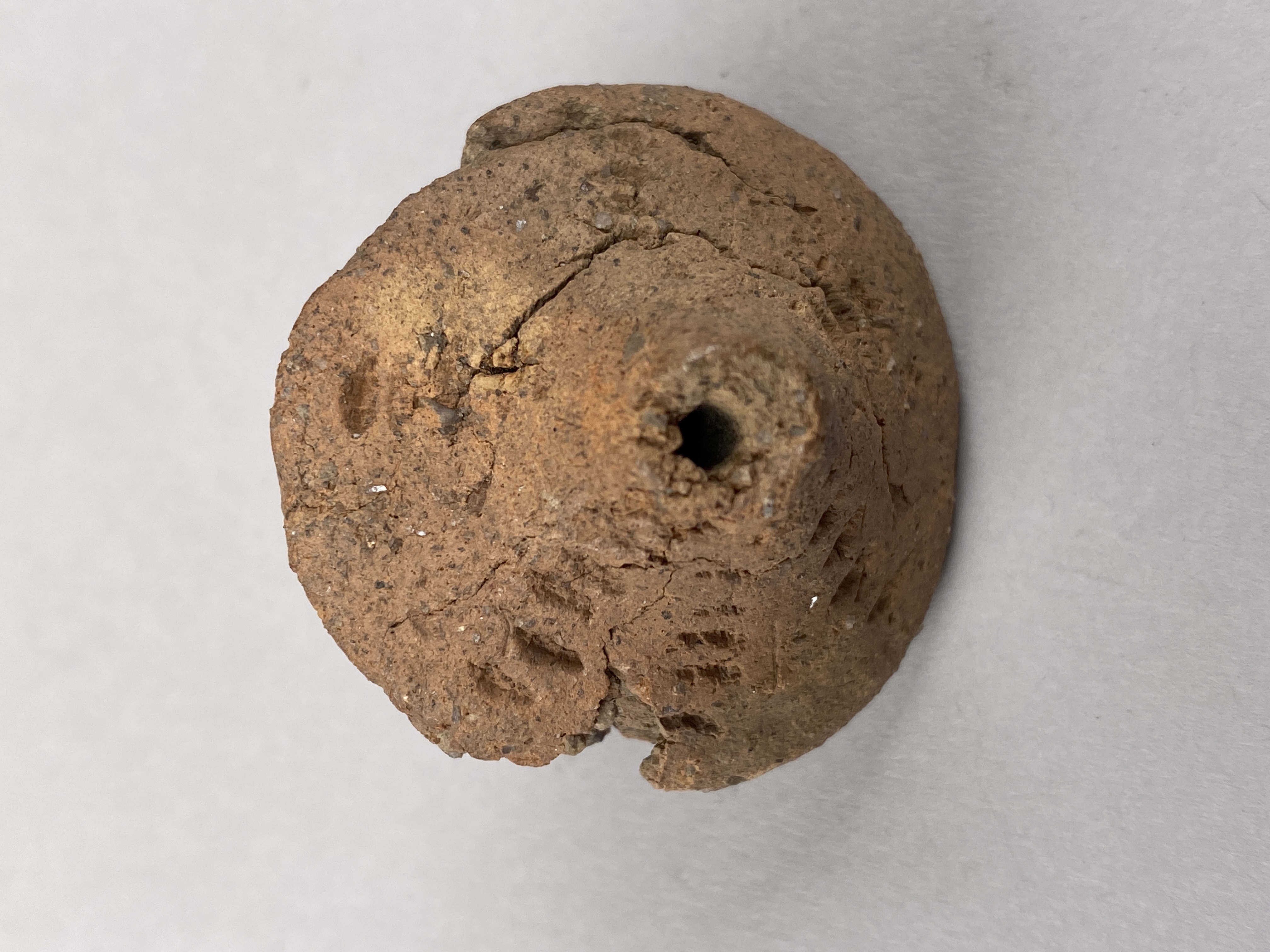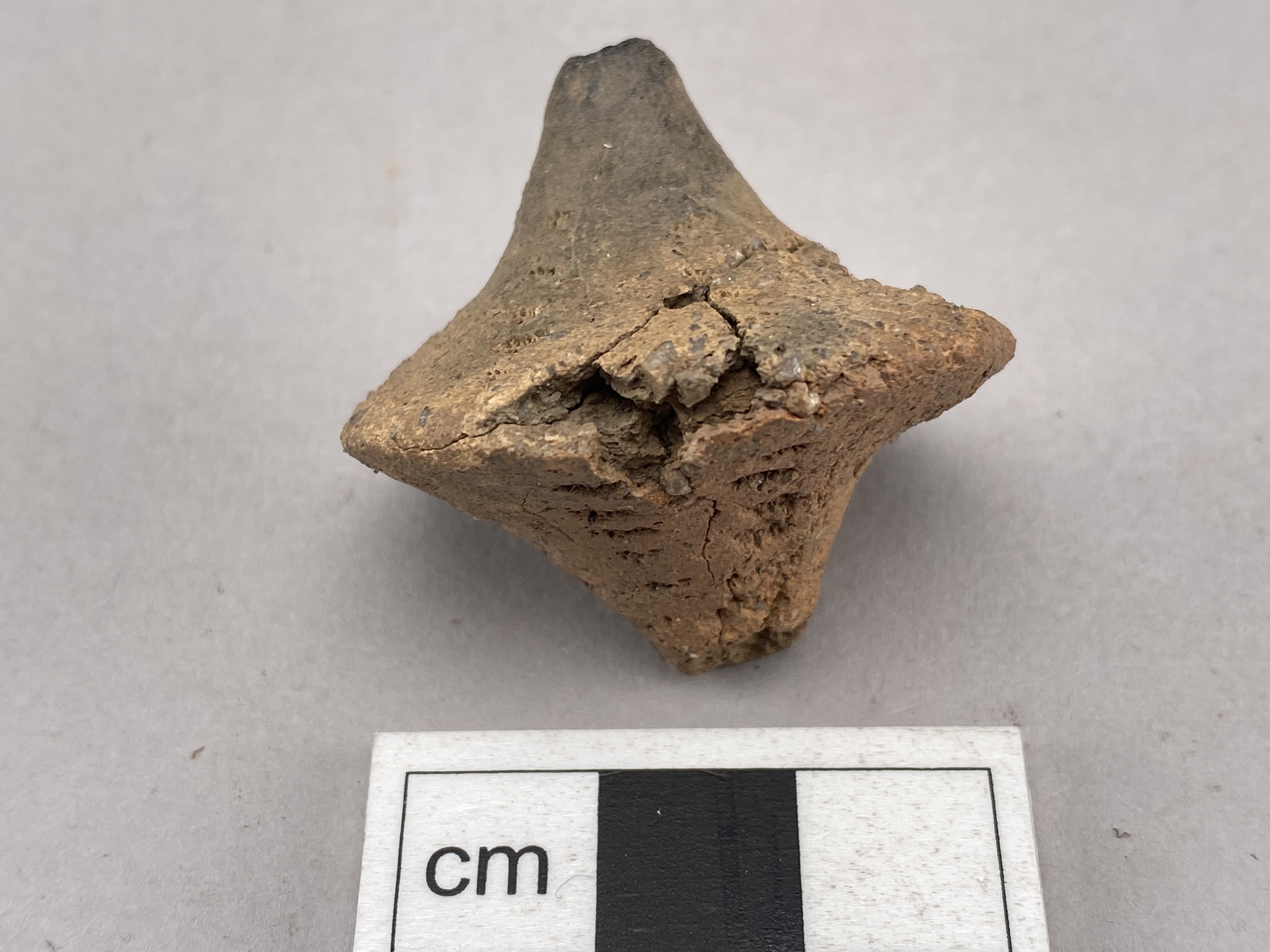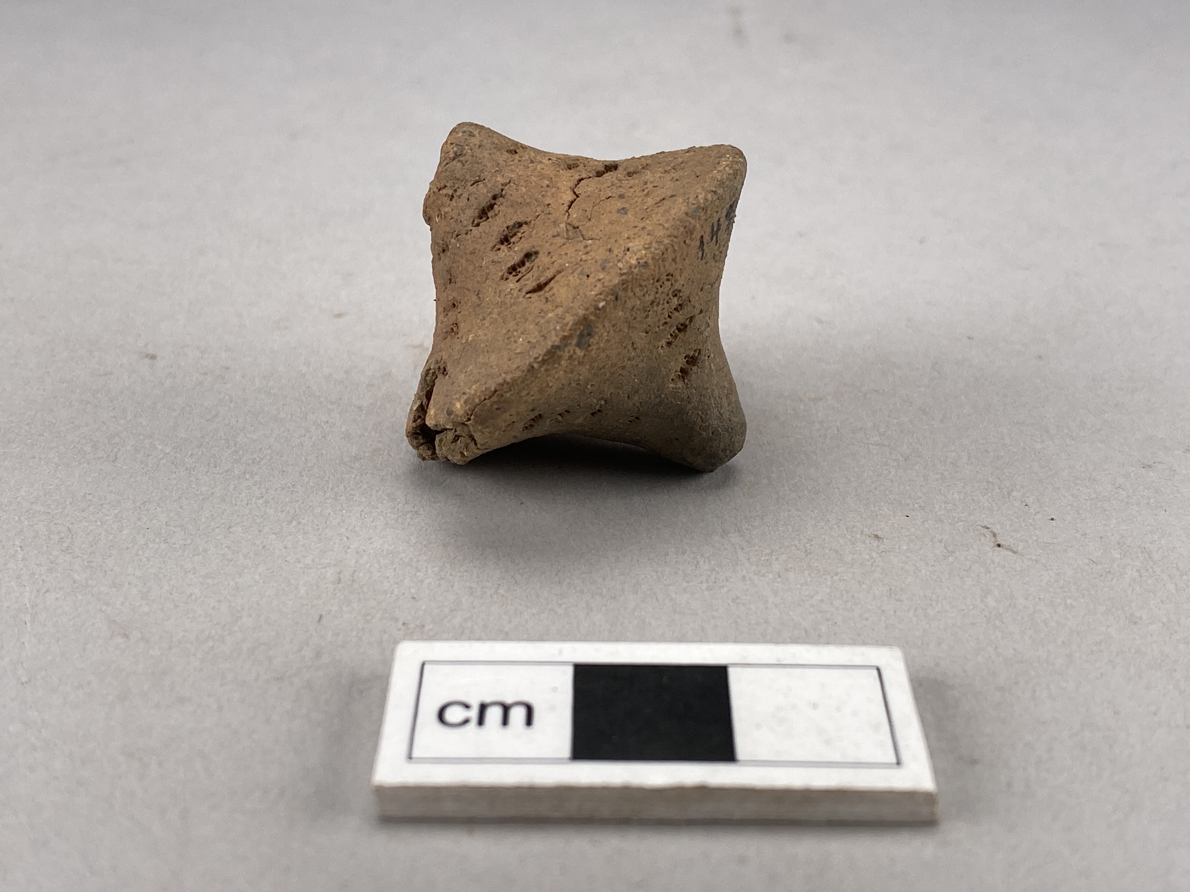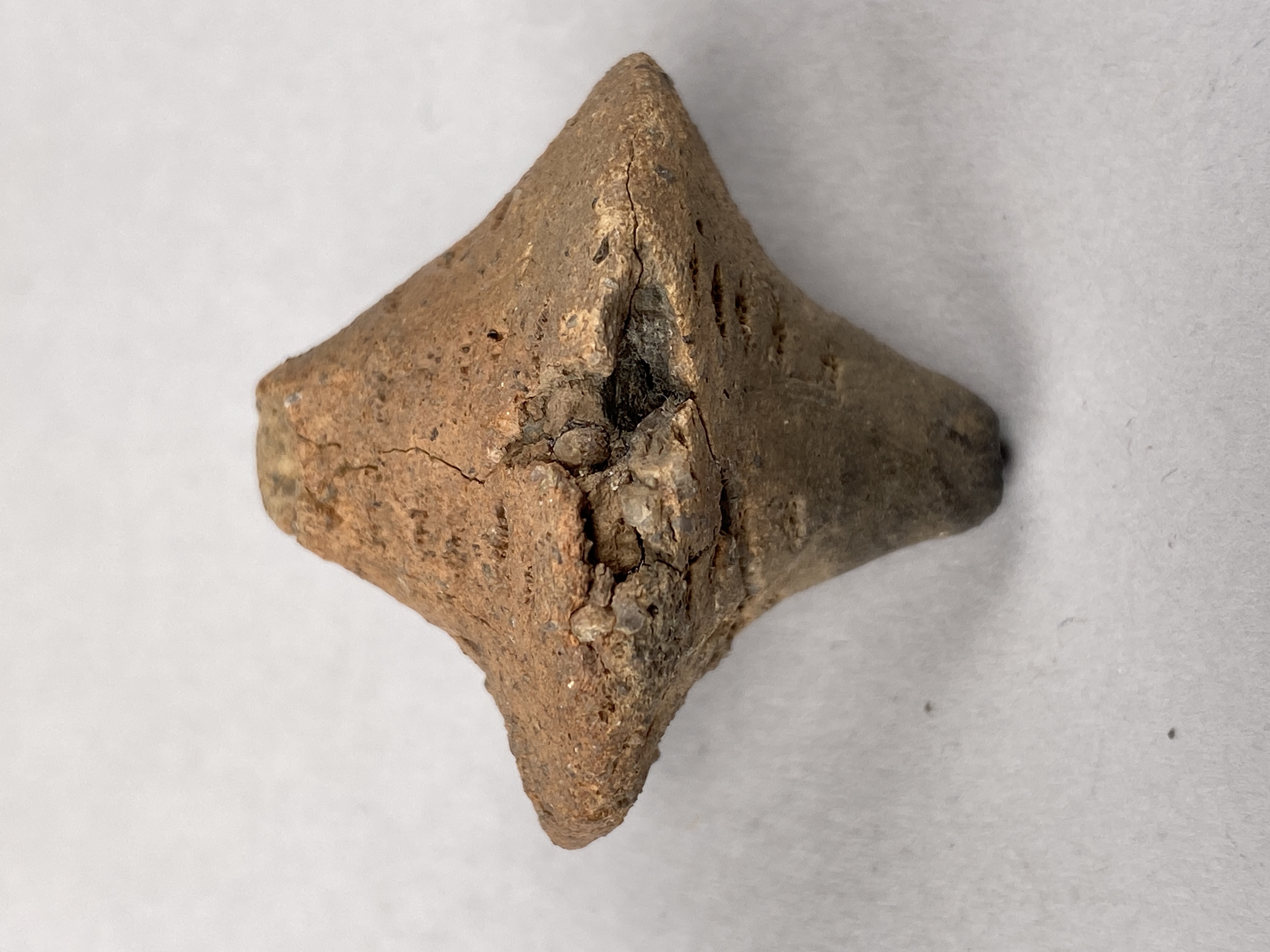 Bikonisk pärla. Dekorerad med rader av små stämpelintryck på båda sidor. Mindre skador och urfallna partier både vid ena ändan och centralt, flera sprickor. Fast bergartsmagrat gods.